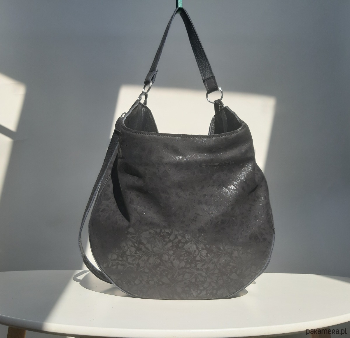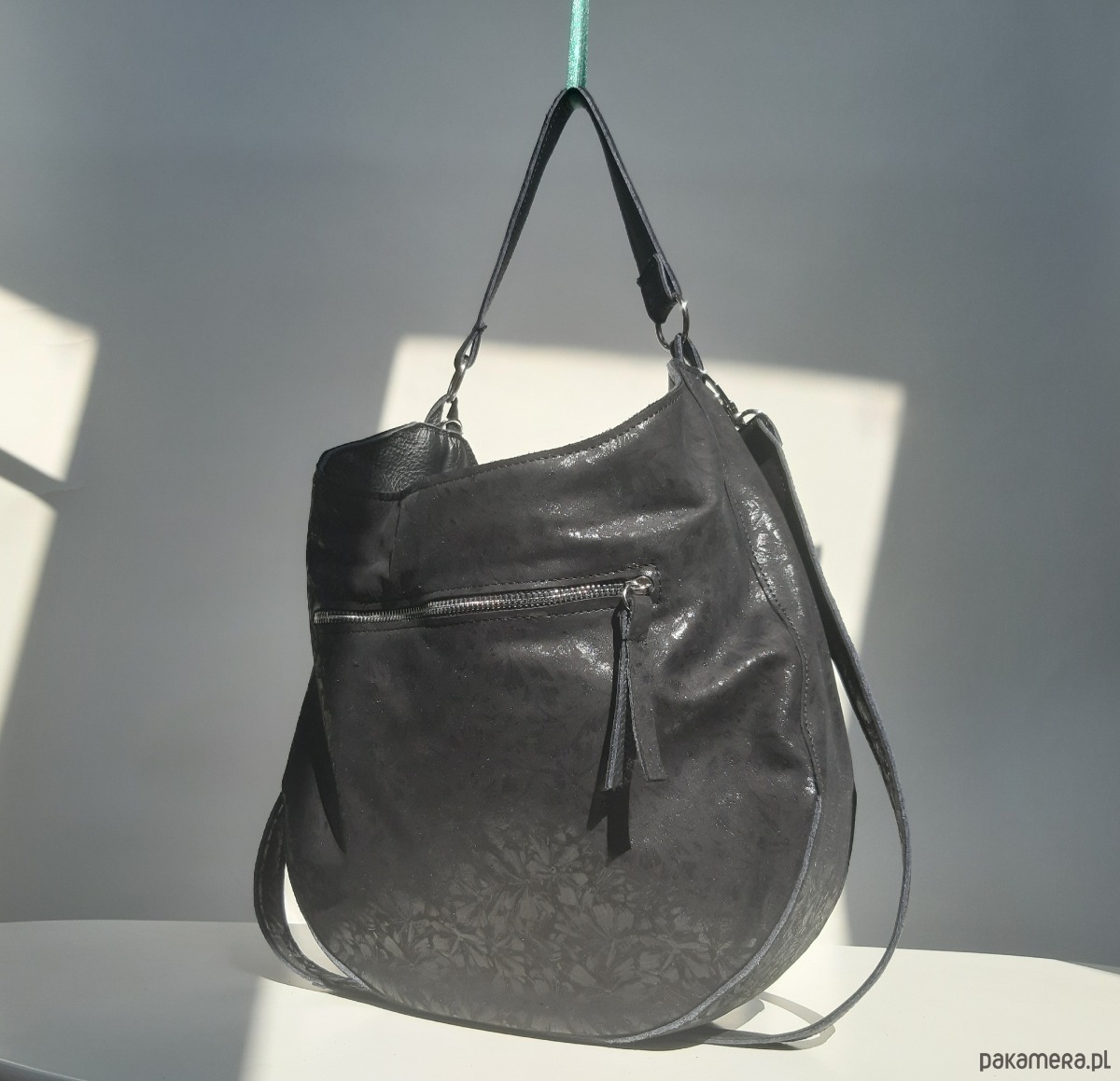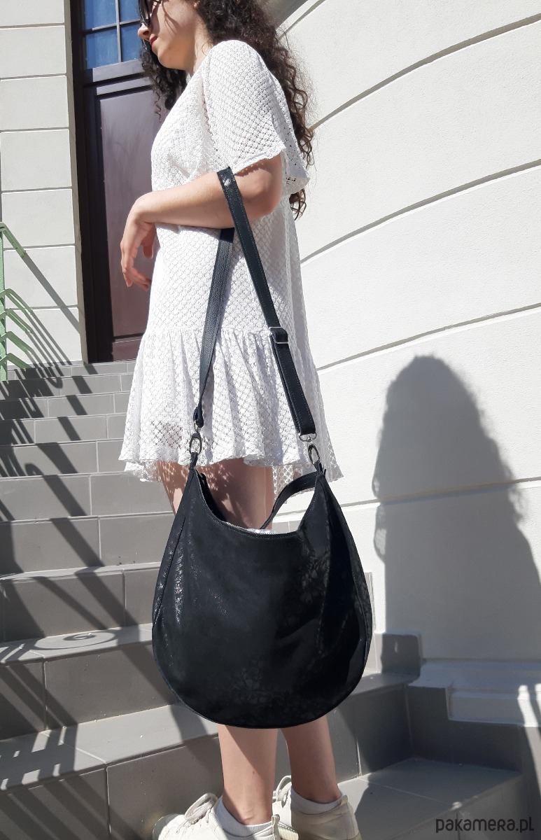 Miękka zaokrąglona torebka w stylu "banana bag". Do noszenia na krótkim pasku ciasno na ramieniu lub na skos na regulowanym. Uszyta z niezwykłej zupełnie skóry czarnej z delikatnie błyszczącymi kwiatkami. Cudowna na lato i po lecie .