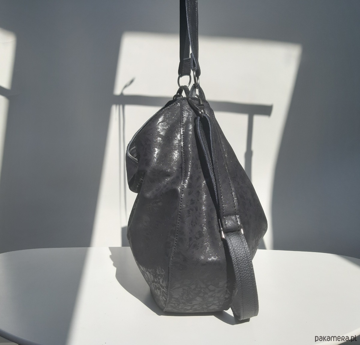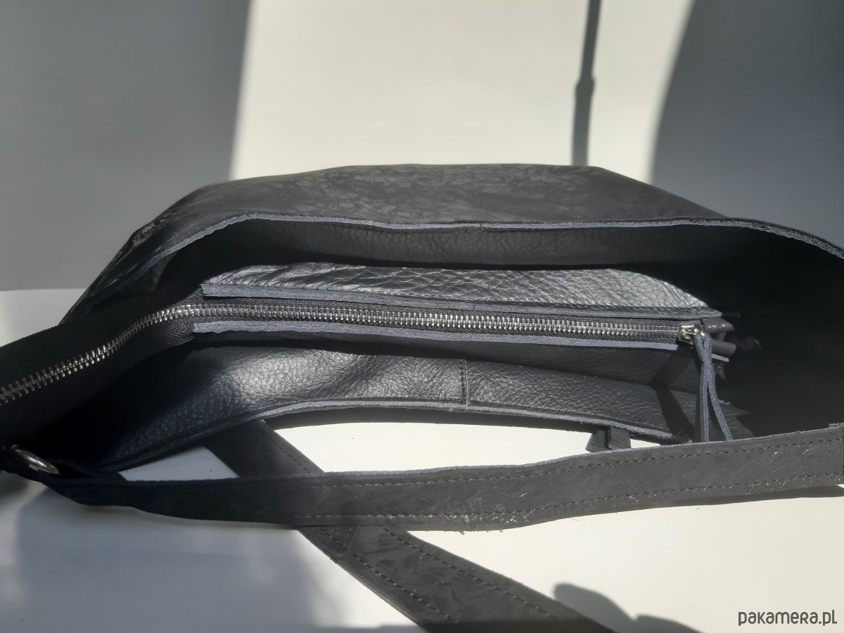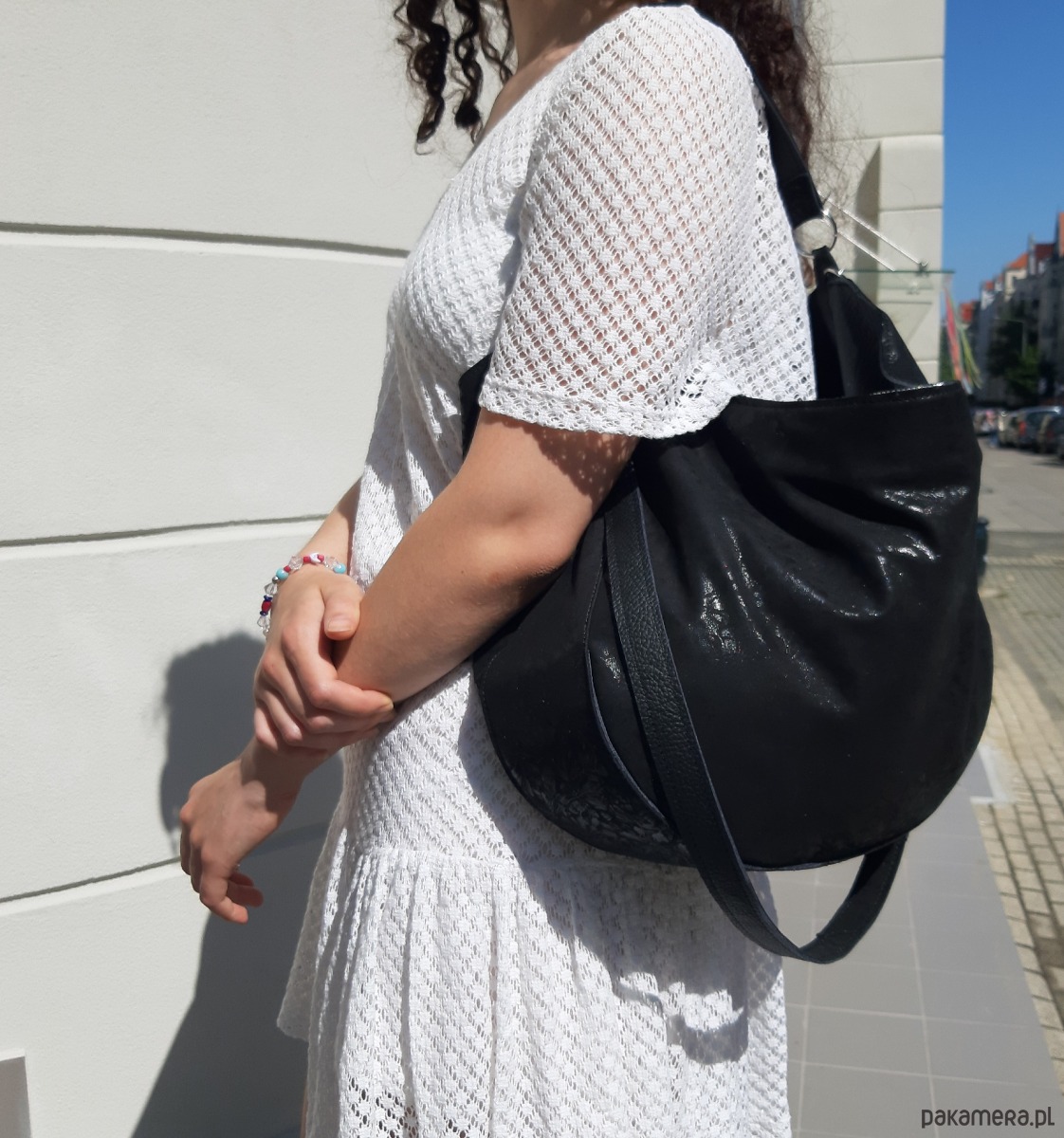 Miękka zaokrąglona torebka w stylu "banana bag". Do noszenia na krótkim pasku ciasno na ramieniu lub na skos na regulowanym. Uszyta z niezwykłej zupełnie skóry czarnej z delikatnie błyszczącymi kwiatkami. Cudowna na lato i po lecie .