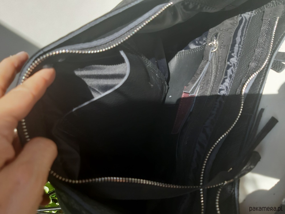 Wewnątrz czarna podszewka. Kieszonka na zamek i kieszonka na telefon. Mieści a4. Wys na środku 28 cm, bok w najszerszym miejscu 10 cm.