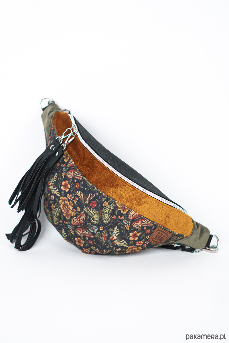 Produkt wykonywany jest rękodzielniczo – ułożenie wzoru może różnić się od przedstawionego na zdjęciu. Tyły nerek wykonywane są ze sztywnych tkanin tapicerskich, które aktualnie są dostępne w hurtowni. Nerka posiada kieszonkę na suwak w środku w podszewce. Nerka sprzedawana jest z czarnym pasem o szer. 38 mm z dwoma możliwościami regulacji do ok 90 cm. Jeżeli potrzebujesz dłuższy pas – napisz proszę w uwagach do zamówienia.