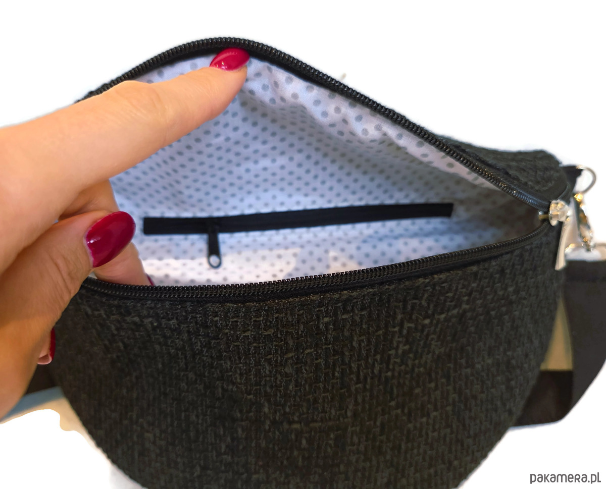 Nerka, saszetka do noszenia na ramię z regulowanym paskiem, zapinana na suwak, w środku mała kieszonka na suwak.