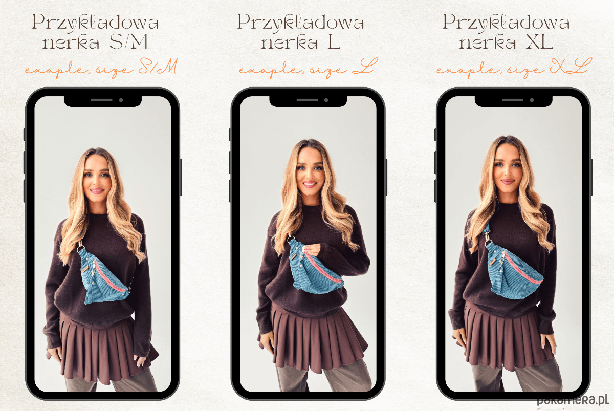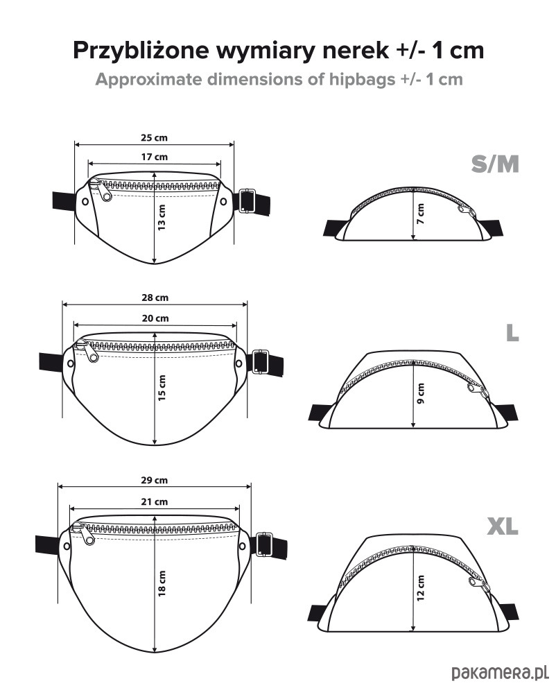 Nerkę szyjemy w 3 rozmiarach - najpopularniejszy jest rozmiar L. Można zamówić także nerkę w rozmiarze S/M i w rozmiarze XL. Niezależnie od wybranego rozmiaru z środku znajdziecie kieszonkę na zamek. Przykładowe zdjęcie wszystkich trzech rozmiarów oraz schemat z wymiarami znajdziecie w galerii.