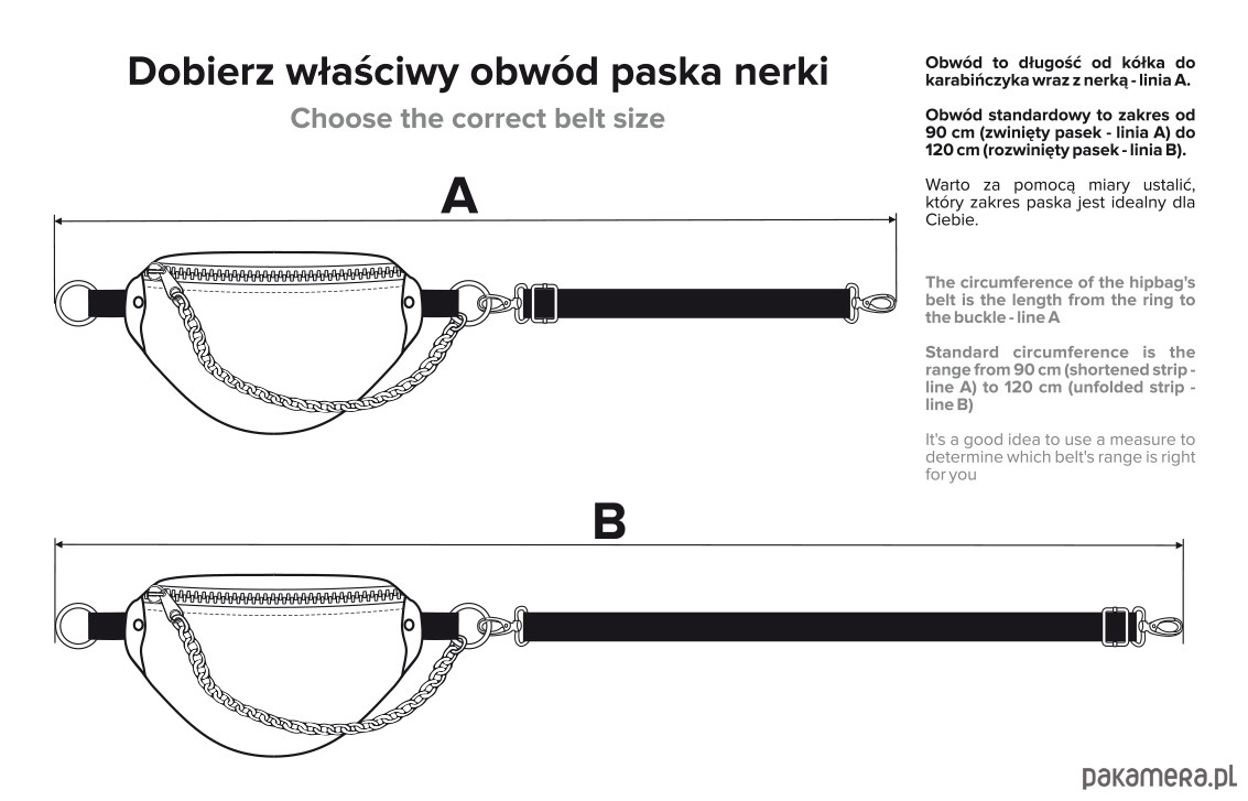 Pamiętaj aby dobrać odpowiedni zakres obwodu paska nerki. Obwód paska nerki to długość od kółka do karabińczyka wraz z nerką.