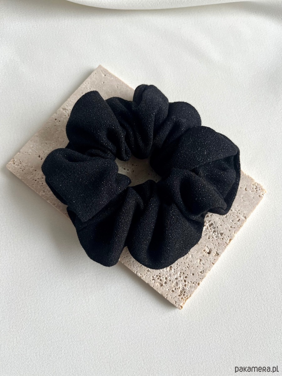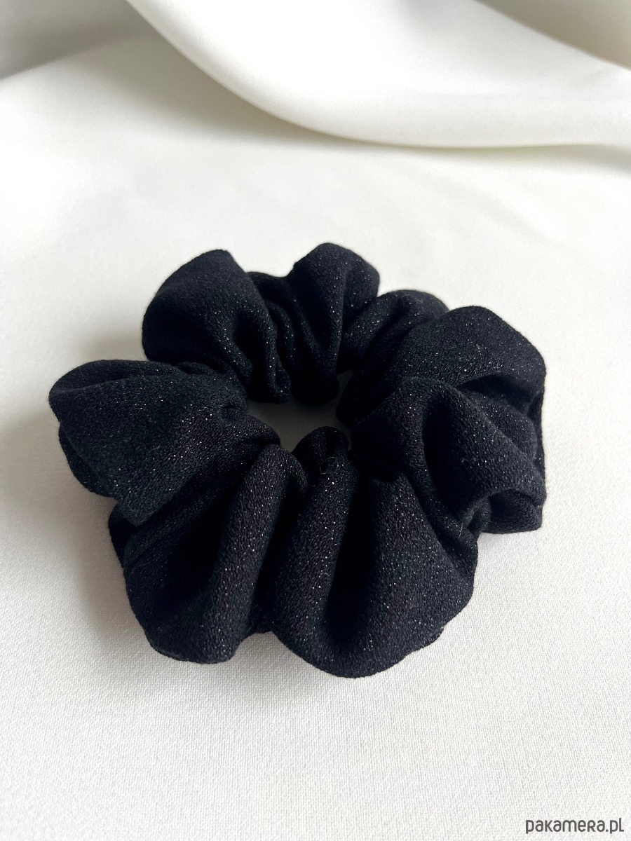 Scrunchie Black Sparkle to czarna gumka do włosów, uszyta z materiału o delikatnie mieniących się drobinkach, które przy ruchu światła tworzą subtelny, elegancki blask. To idealny dodatek, gdy chcesz dodać stylizacji charakteru.