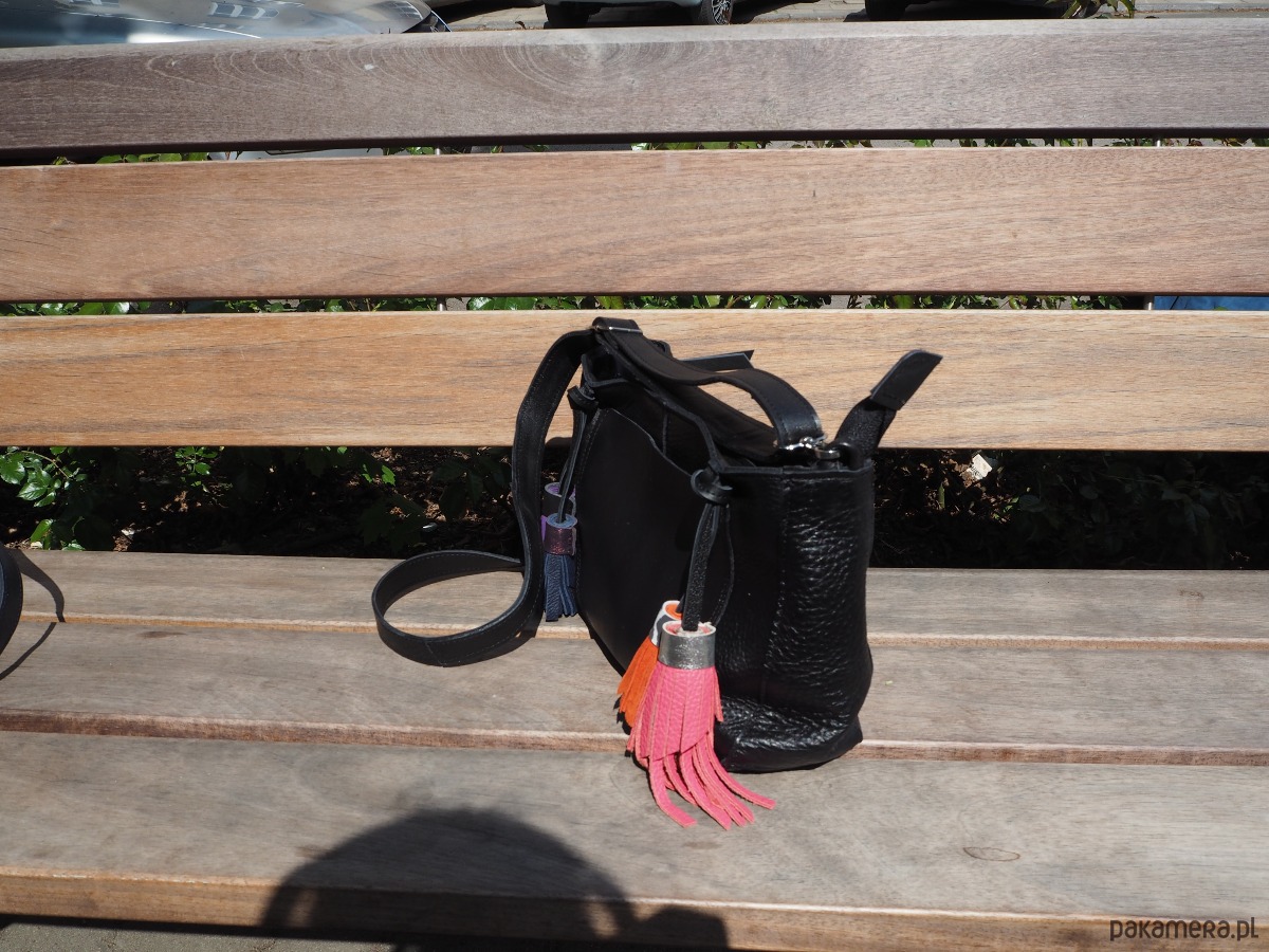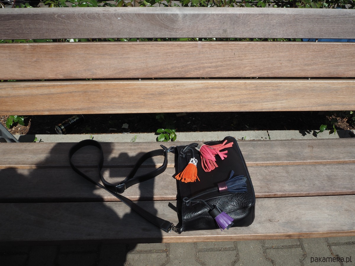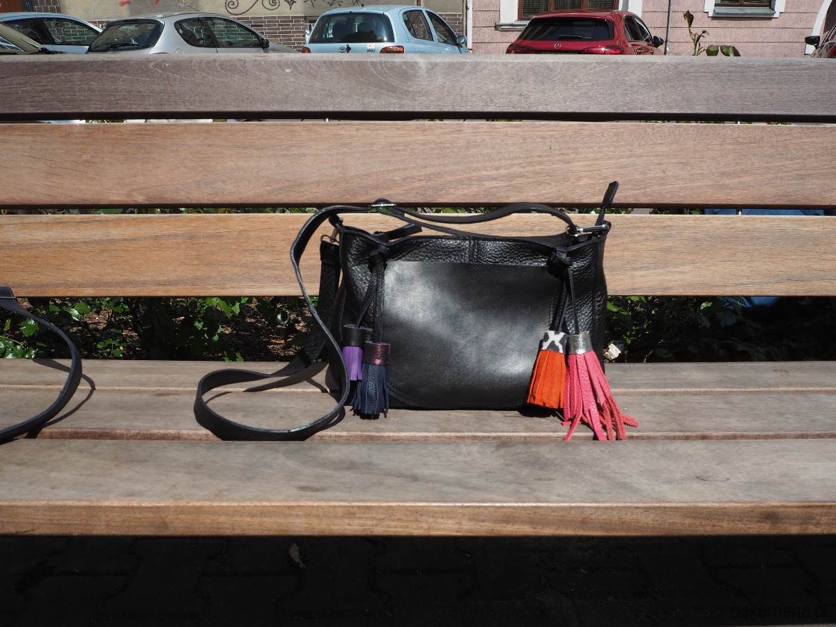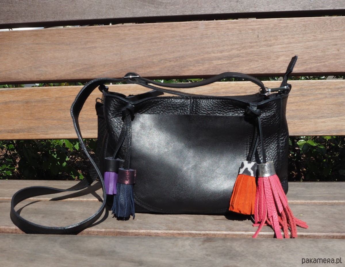Czarna skórzana torebka. Ozdobiona dwoma kompletami frędzli.