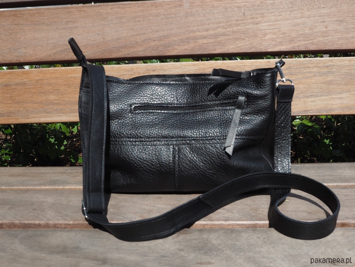 Wielkościowo jest to średniej wielkości listonoszka, która zmieści małą parasolkę, duży portfel, notes formatu a5 i sporo innych rzeczy. Przód i tył wycięte w kształcie/ wielkości kartki a4.