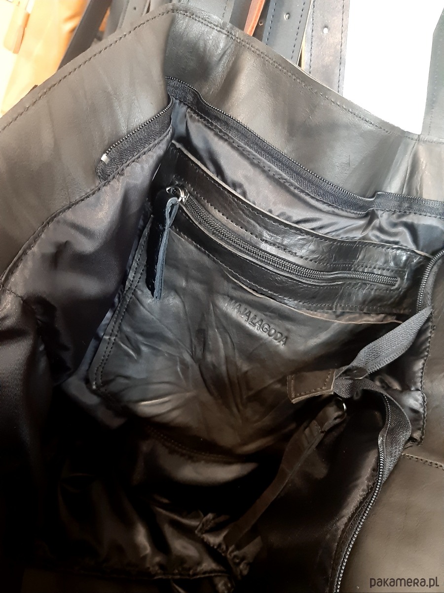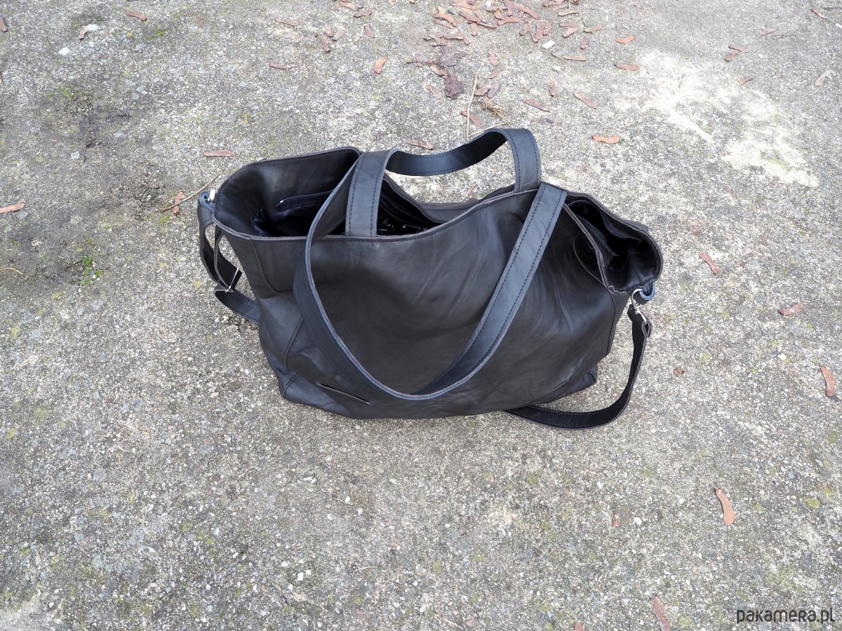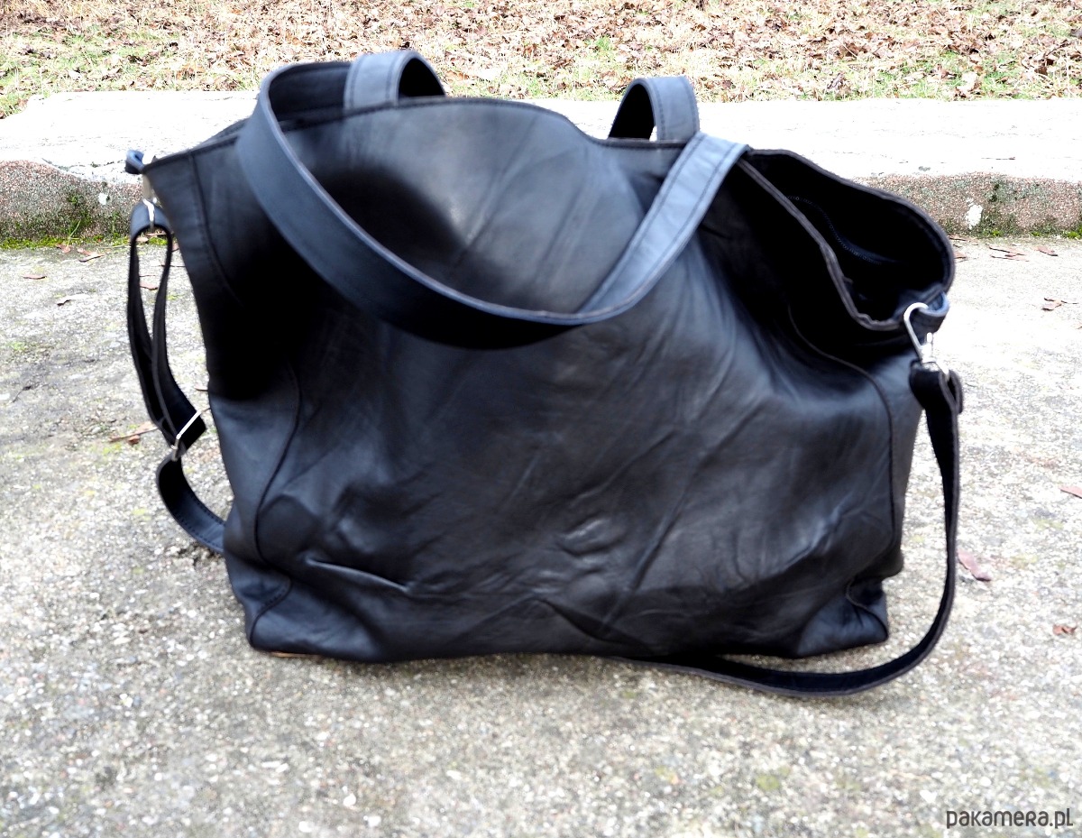 Duża czarna torba uszyta ze skóry naturalnej, bydlęcej. Skóra tak jakby lekko gnieciona. Daje jej to trochę rockowego pazura. Skóra nie jest błyszcząca.