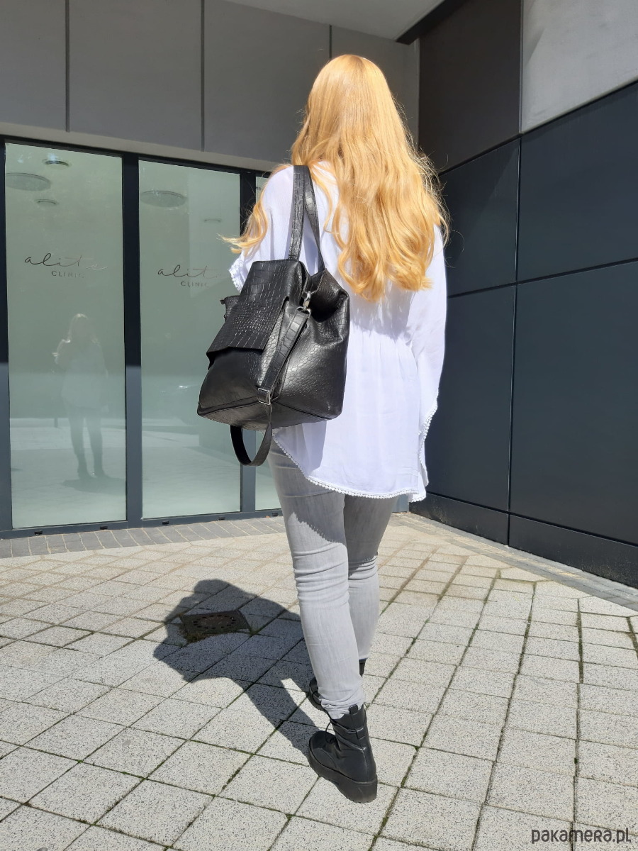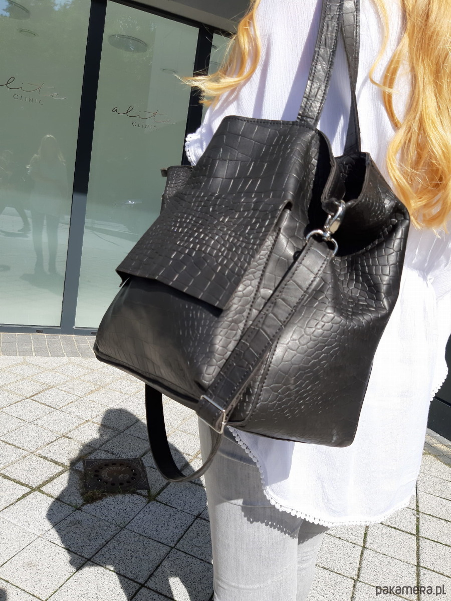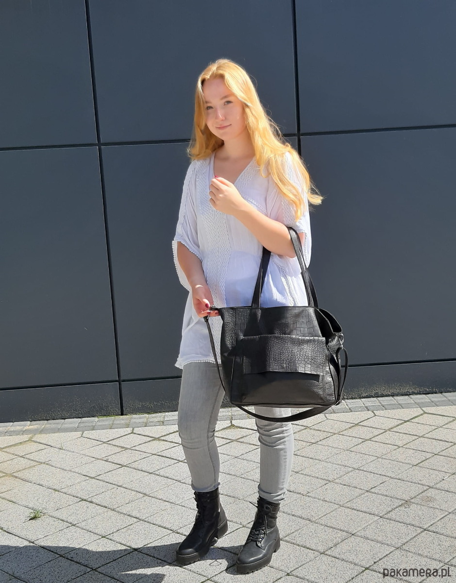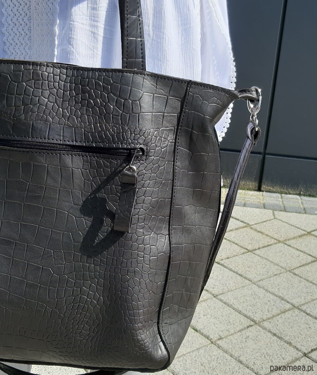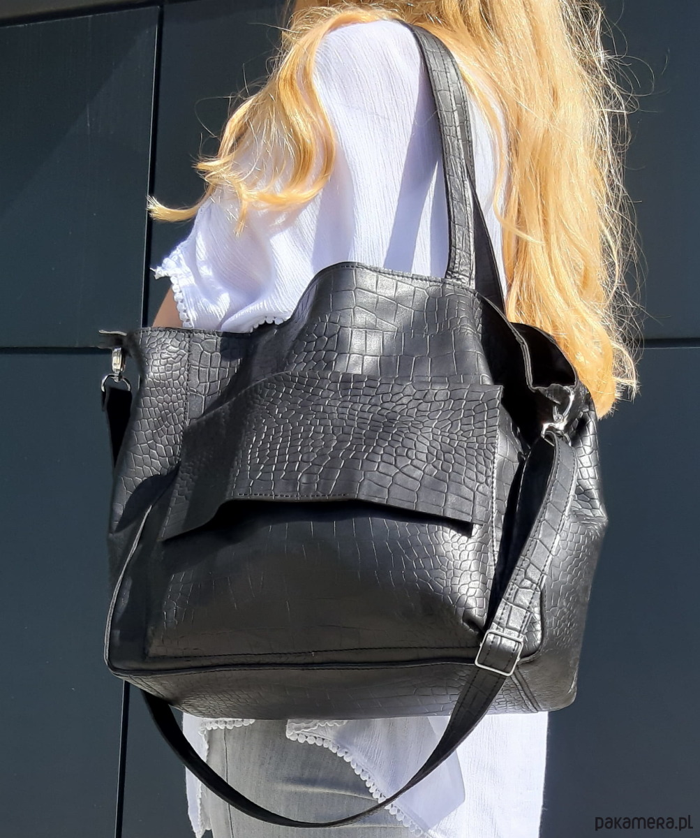 Duża skórzana torba uszyta ze skóry naturalnej fakturowanej w krokodyla. Skóra elastyczna, miękka.