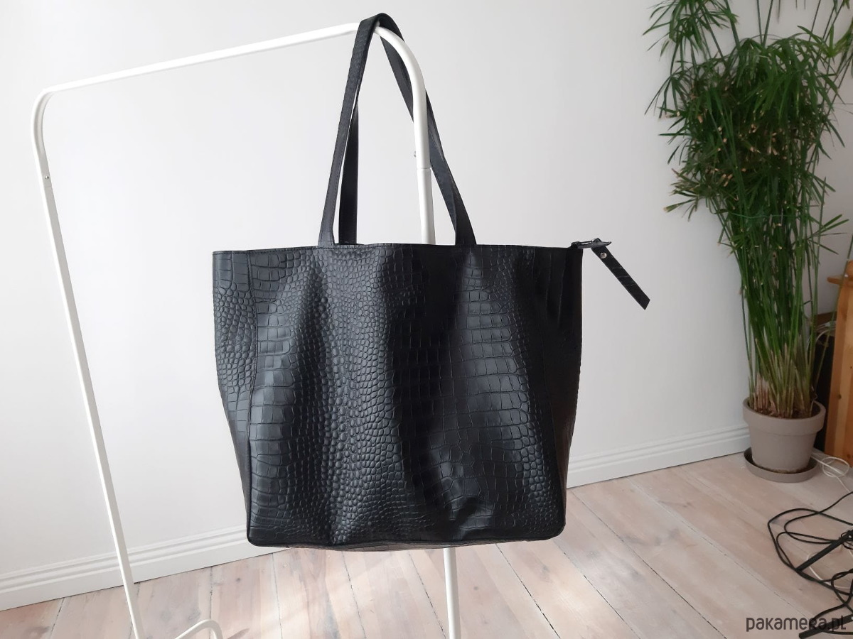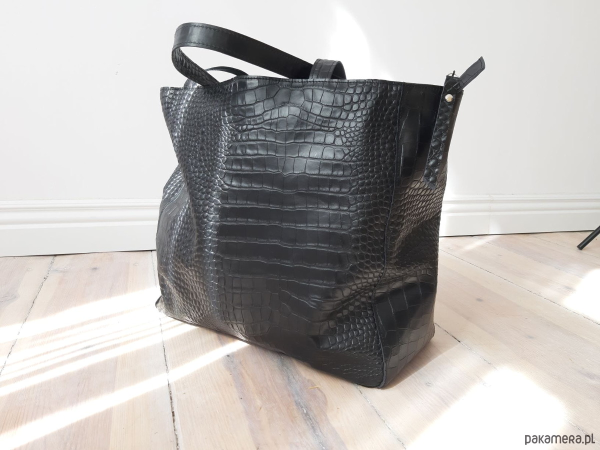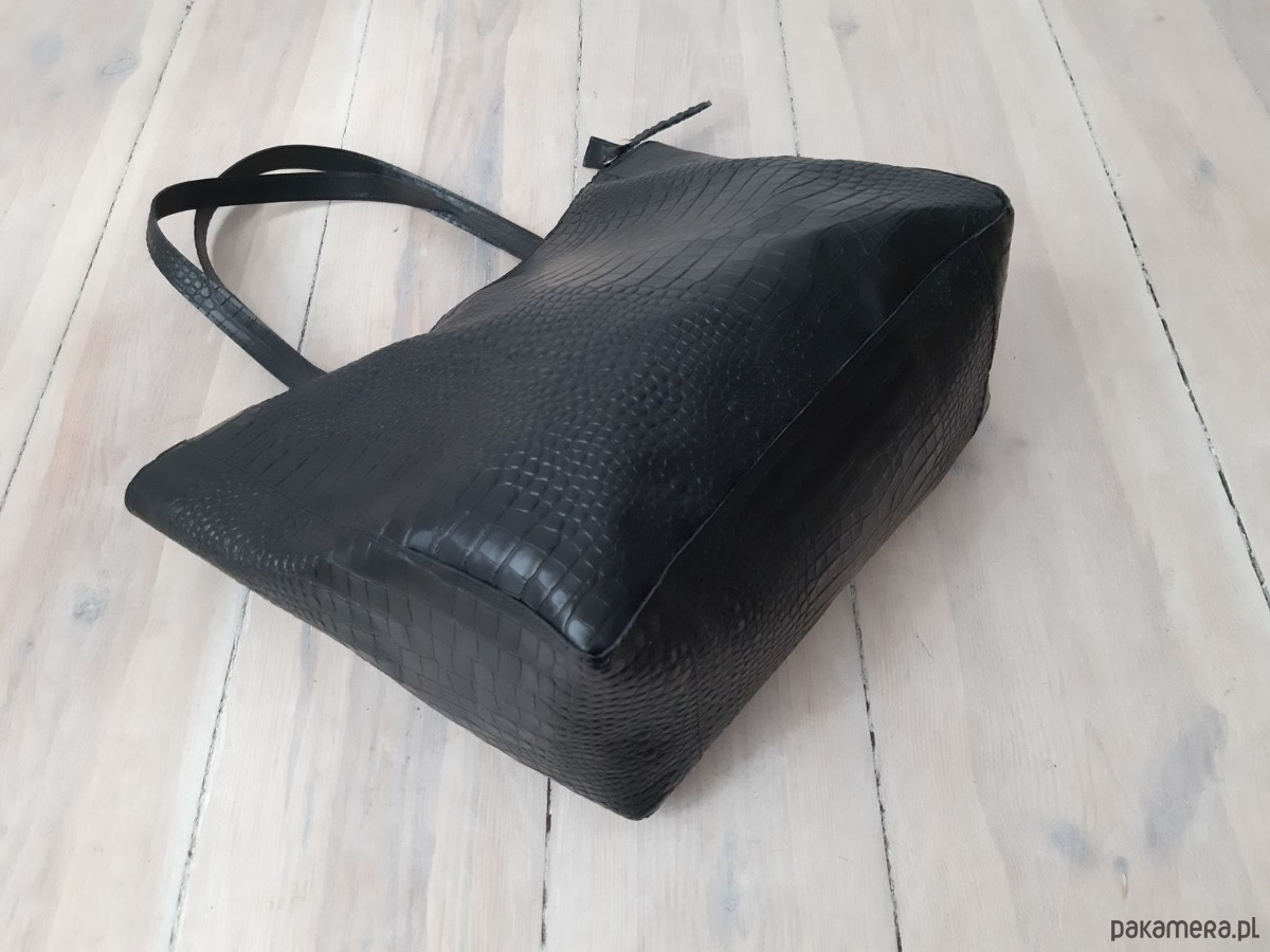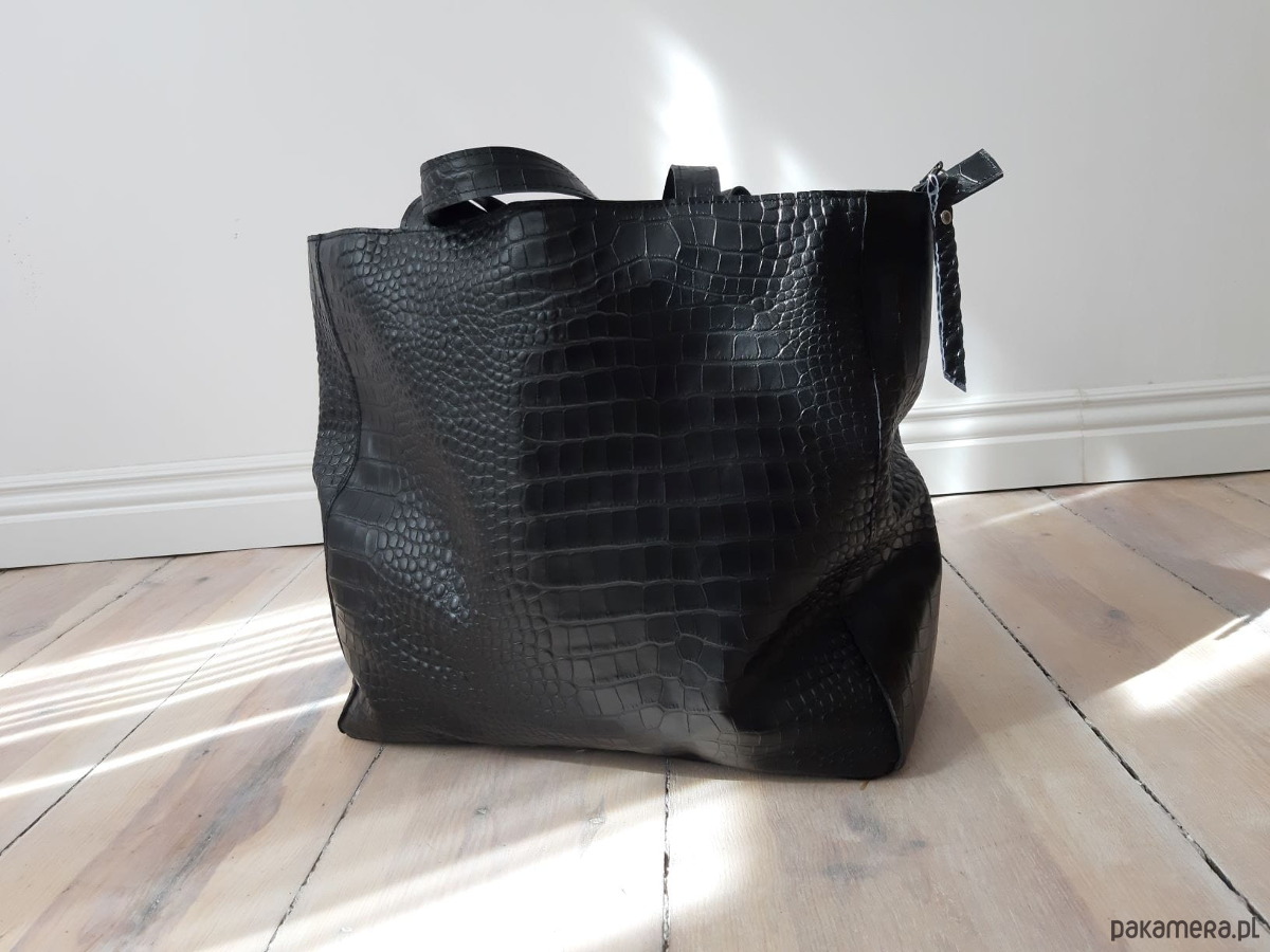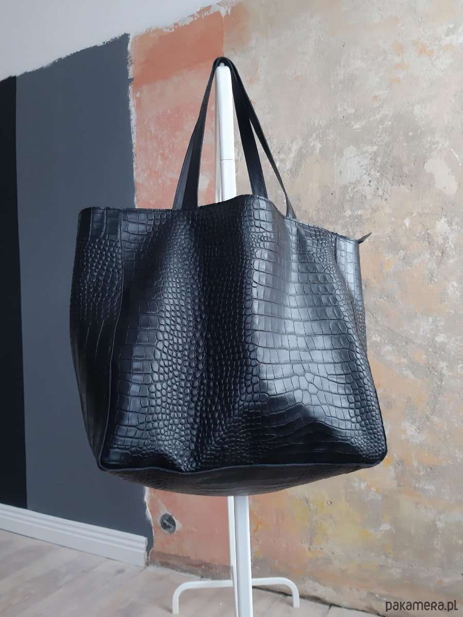 Duża skórzana torba uszyta ze skóry naturalnej fakturowanej w krokodyla. Kolor czarny.