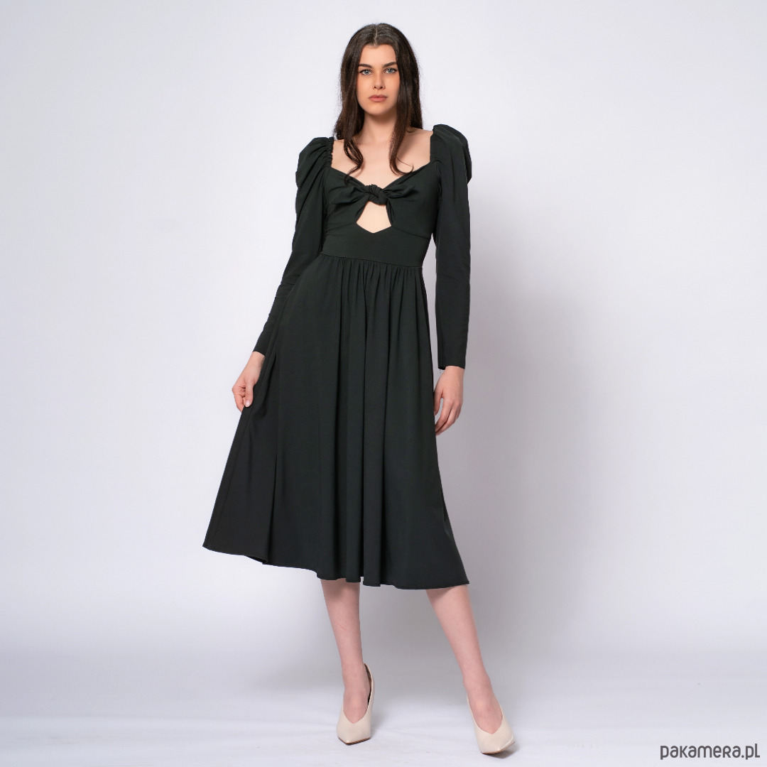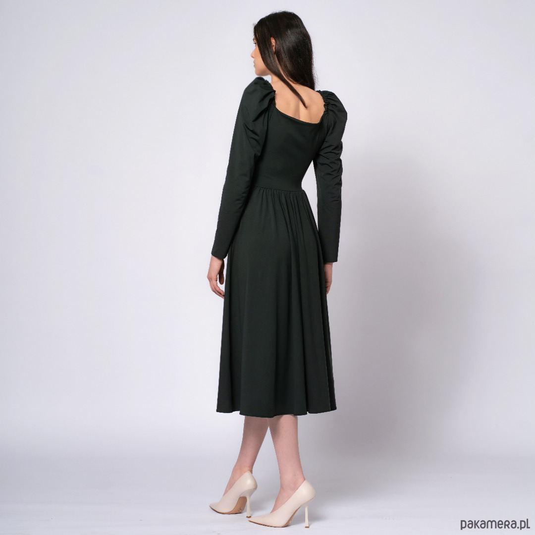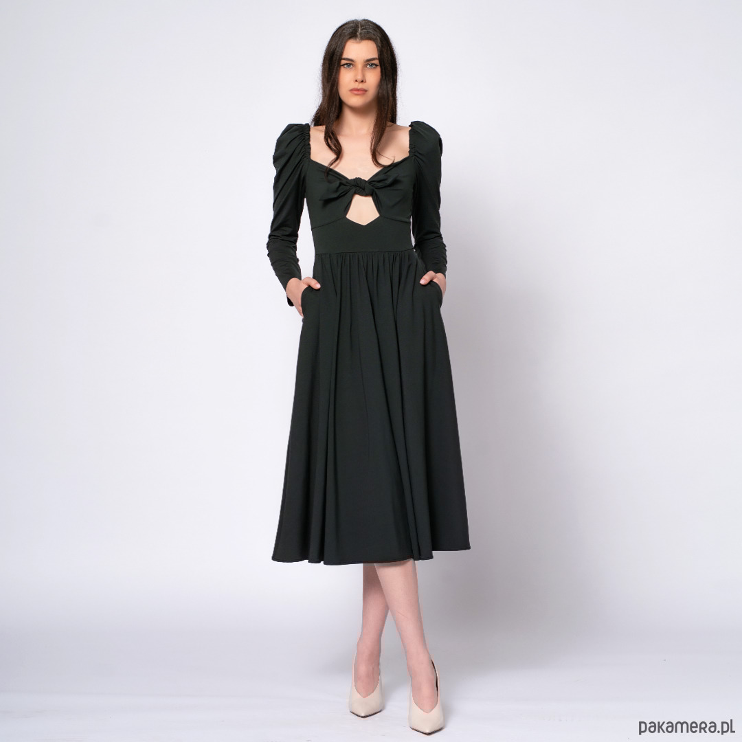 Sukienka posiada ukryte w szwach bocznych kieszenie.