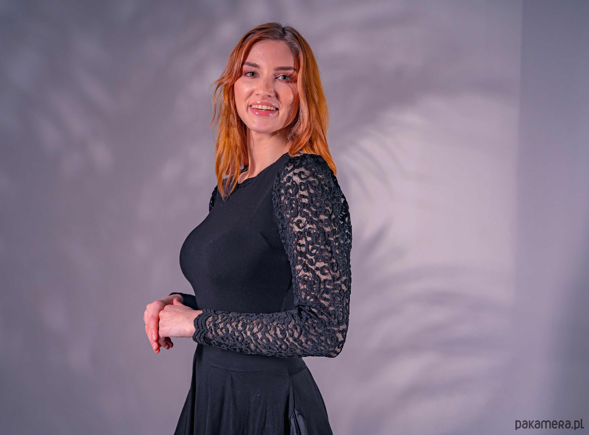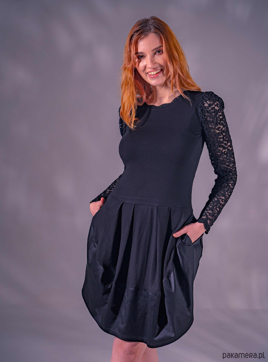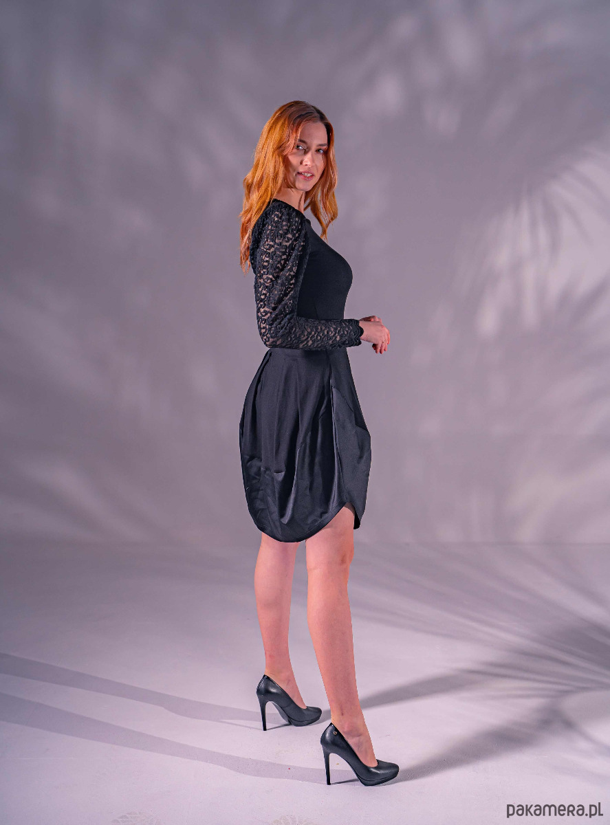 Czarna sukienka z marszczonym rękawem. Fason dopasowany, od talii spódnica ma rozporki po bokach. Sukienka jest rozciągliwa, więc pozwala na lepsze dopasowanie. Rękaw z bufką pozwala ukryć szersze ramiona. Długość do kolana, na wyższej osobie może być krótsza.