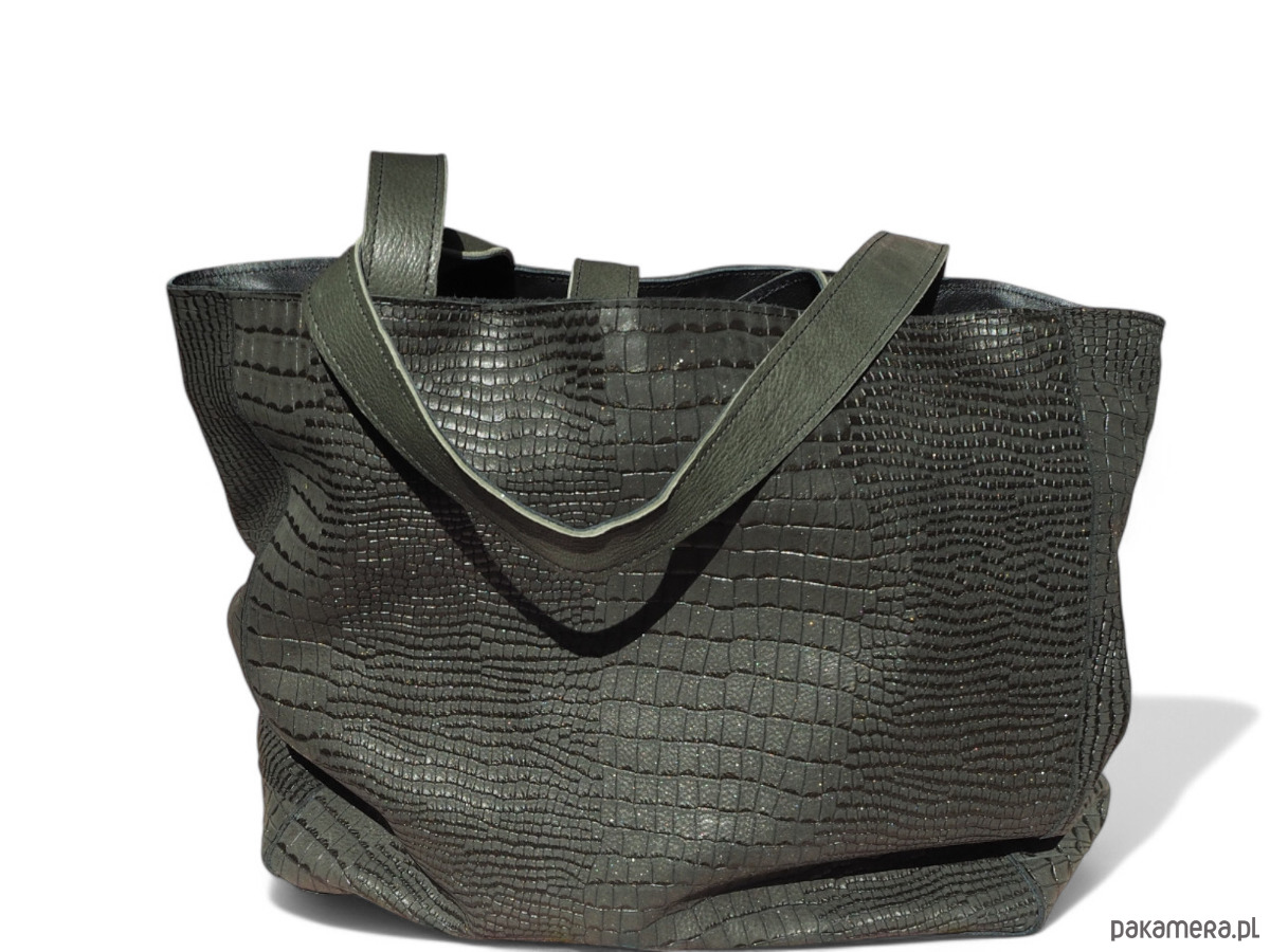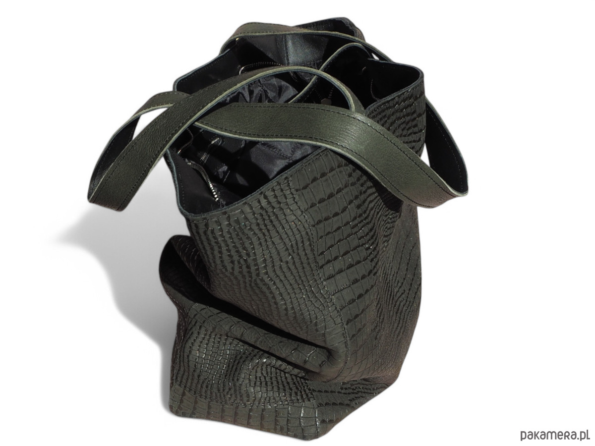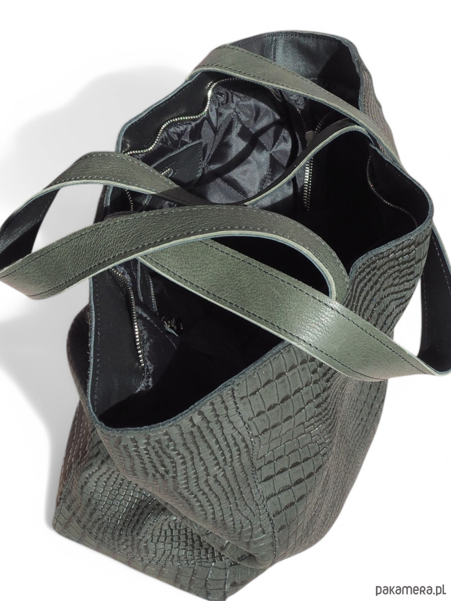 Ciemno zielona skórzana torba. Skóra z tłoczeniem krokodyla, miękka, elastyczna. Jest to skóra naturalna.