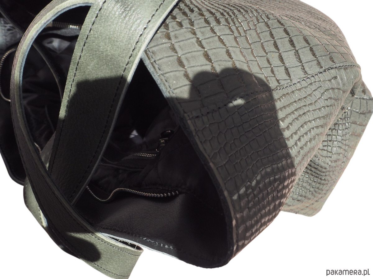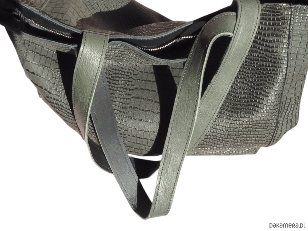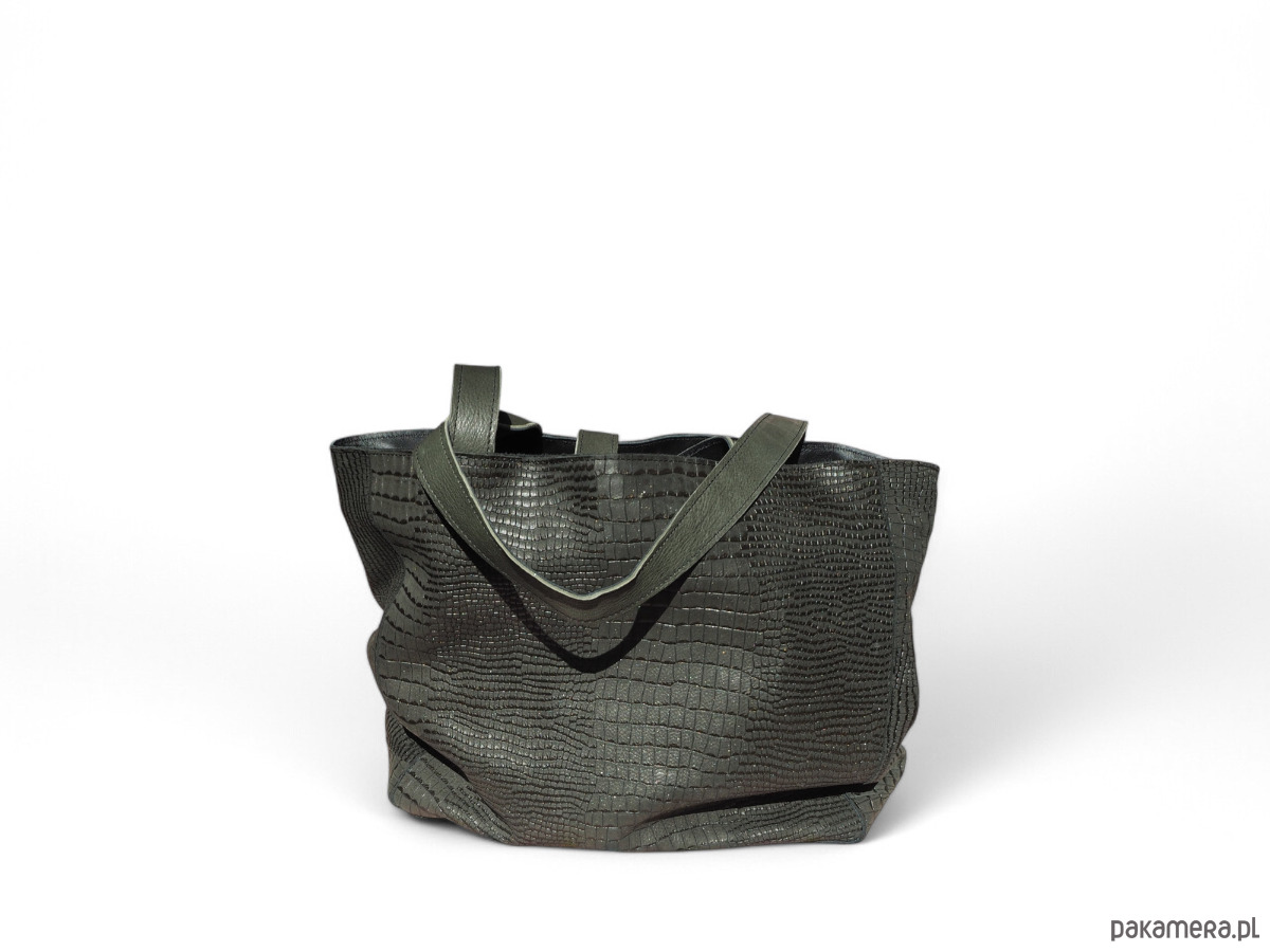 Ciemno zielona skórzana torba. Skóra z tłoczeniem krokodyla, miękka, elastyczna. Jest to skóra naturalna.
