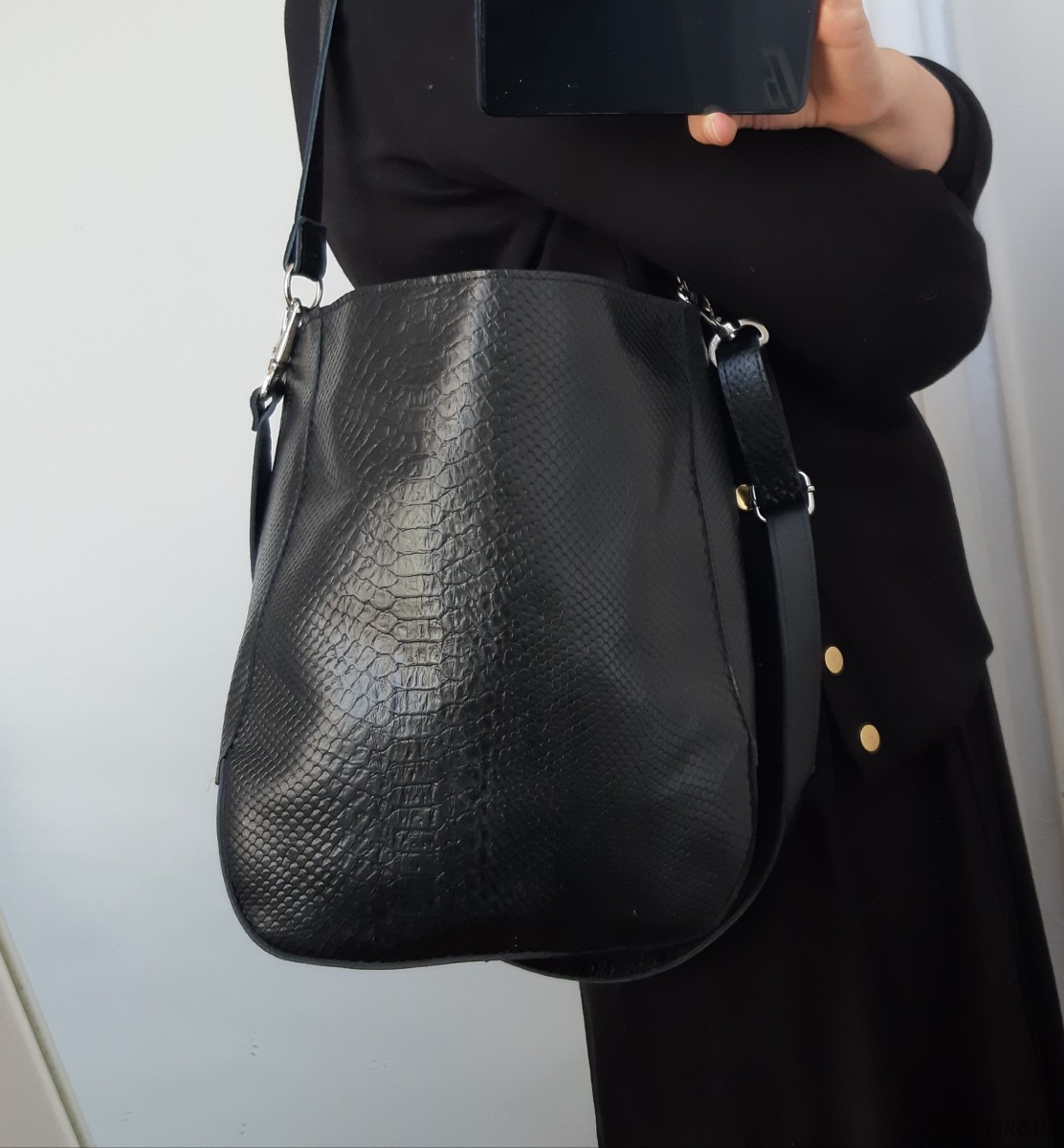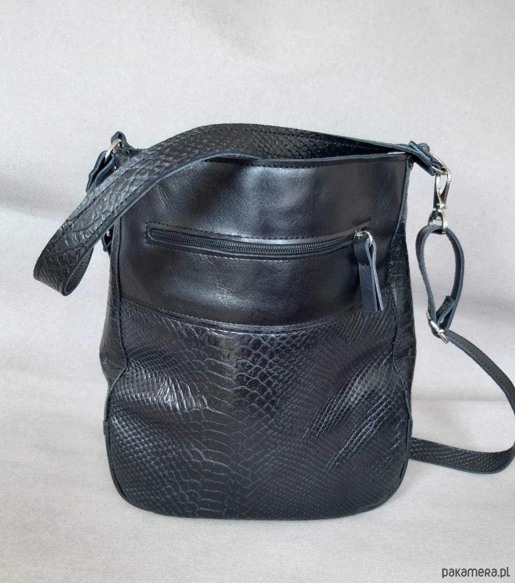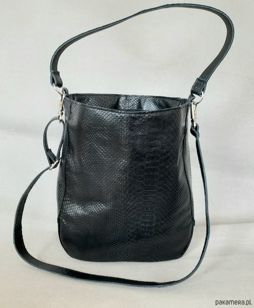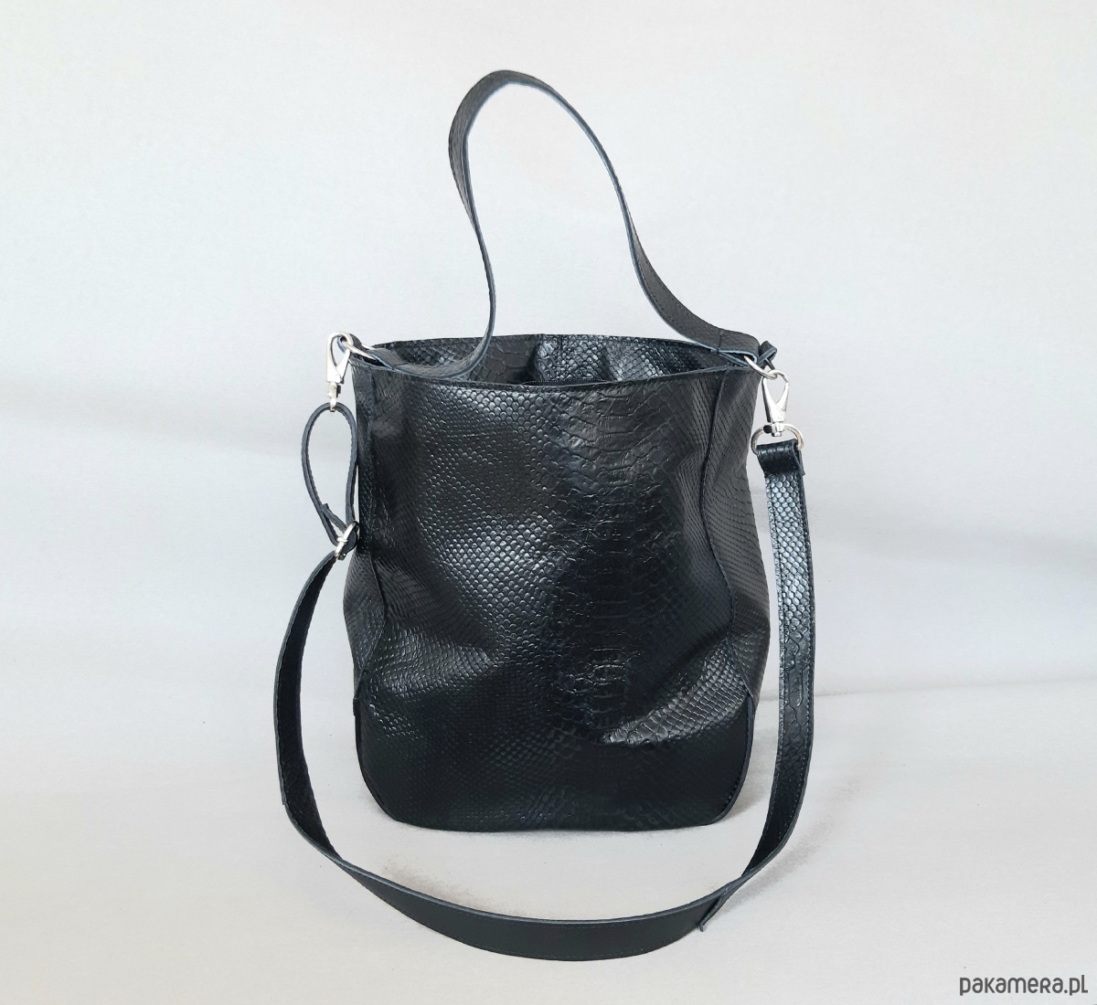 Duża skórzana torba w prostym fasonie zaokrąglonego kubełka. Skóra naturalna z fakturą węża. Kolor czarny. Skóra raczej miękka. To znaczy nie jest lejąca, ale jest plastyczna, układa się do ciała.