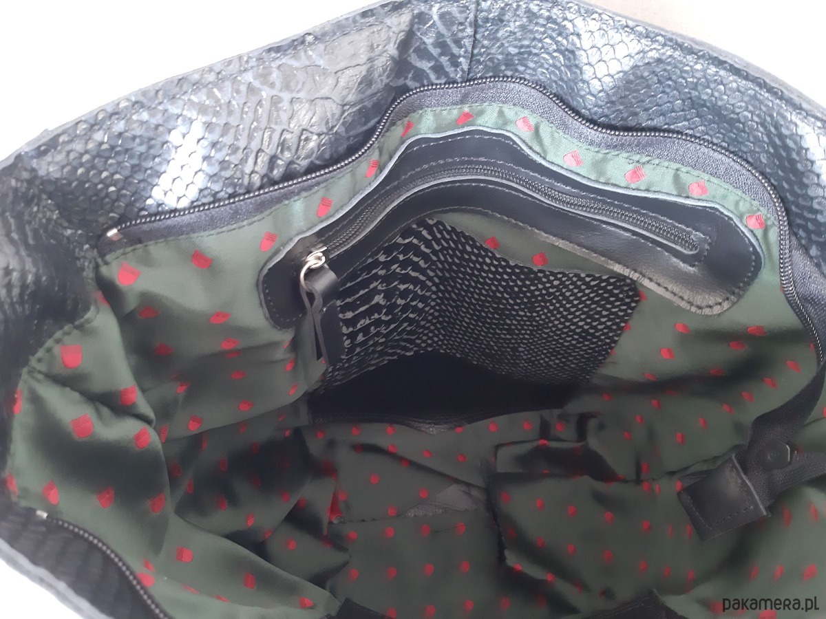 Torba zapinana jest na zamek, wewnątrz podszewka, kieszonka zapinana na zamek i kieszonka na komórkę.