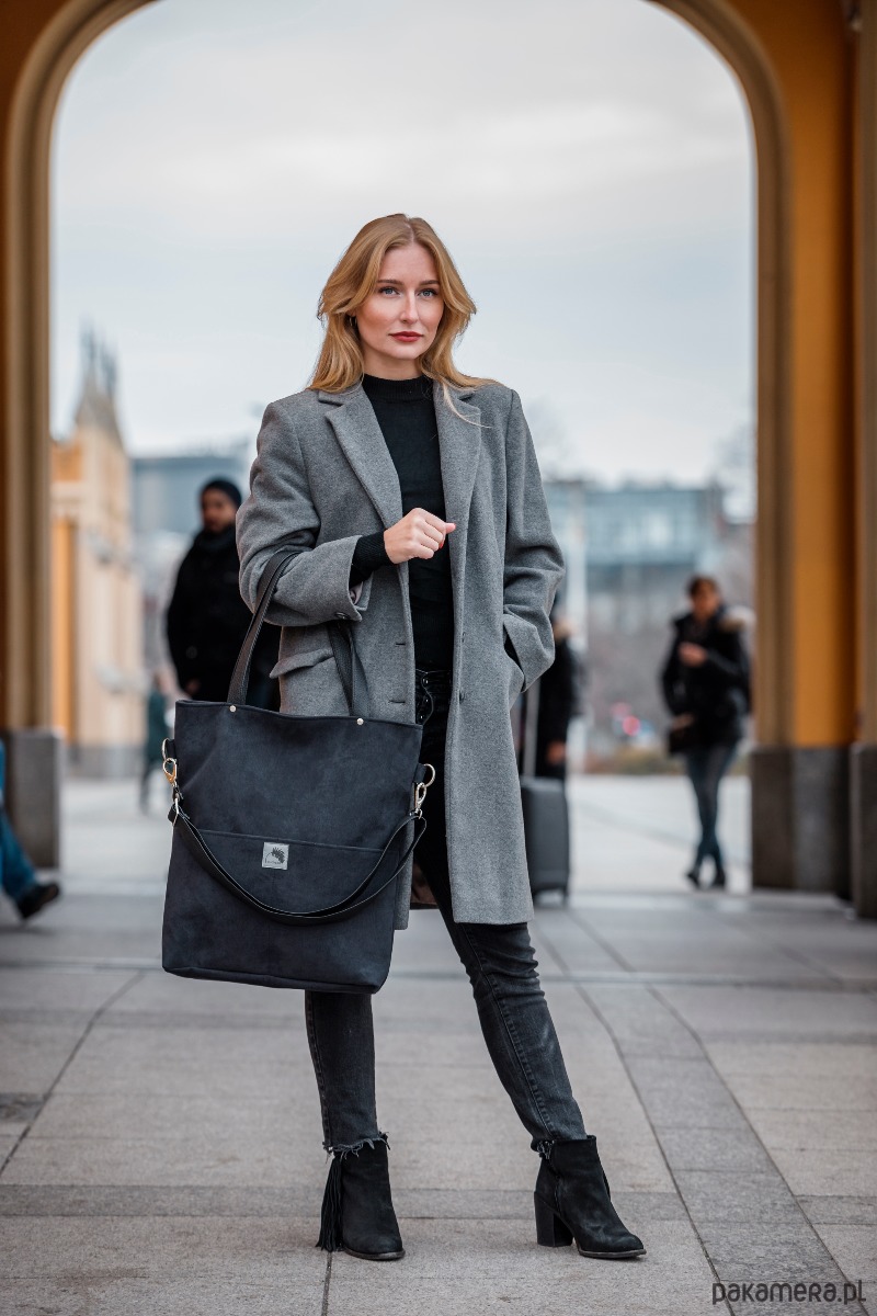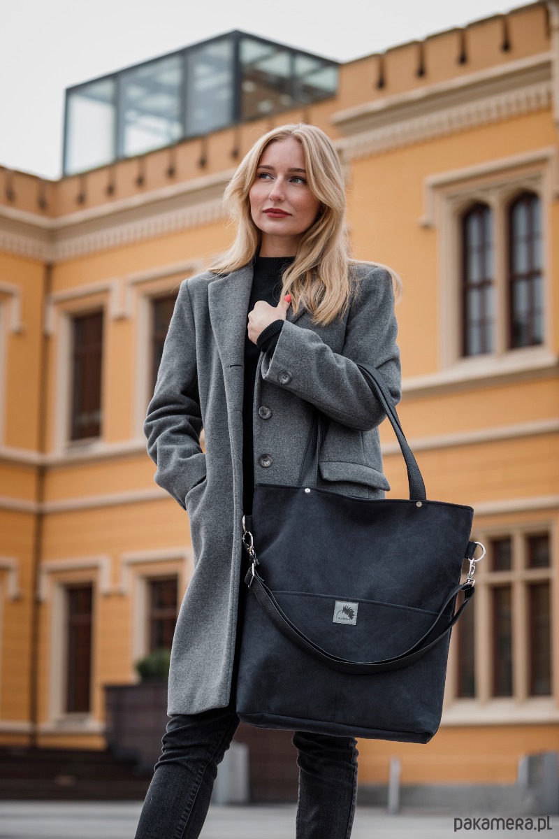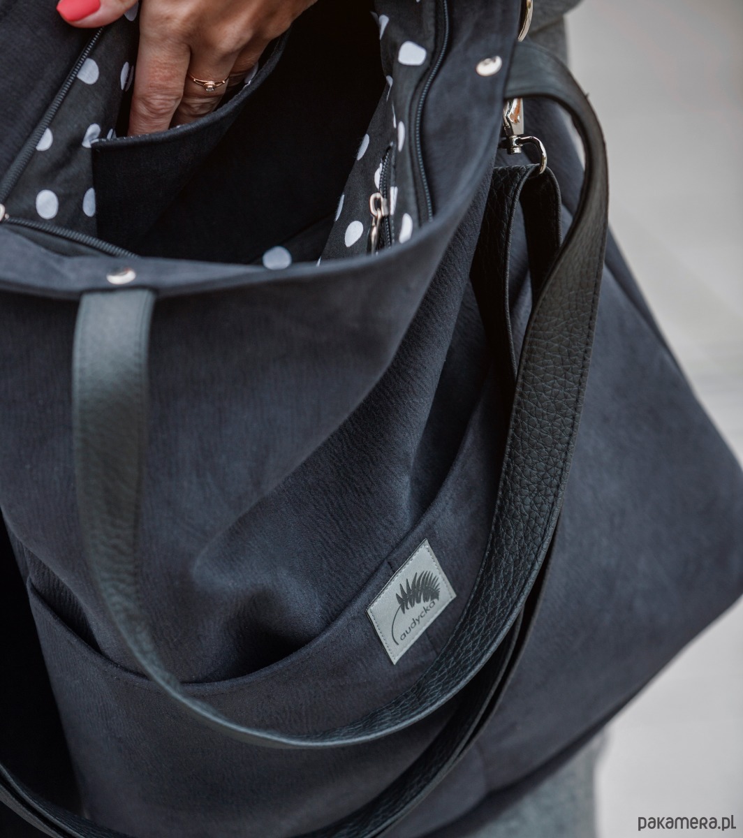 Duża czarna zamszowa torba (sztywny, gruby, wodoodporny nubuk ekologiczny ) do noszenia na ramieniu i na skos na długim regulowanym, dopinanym pasku.