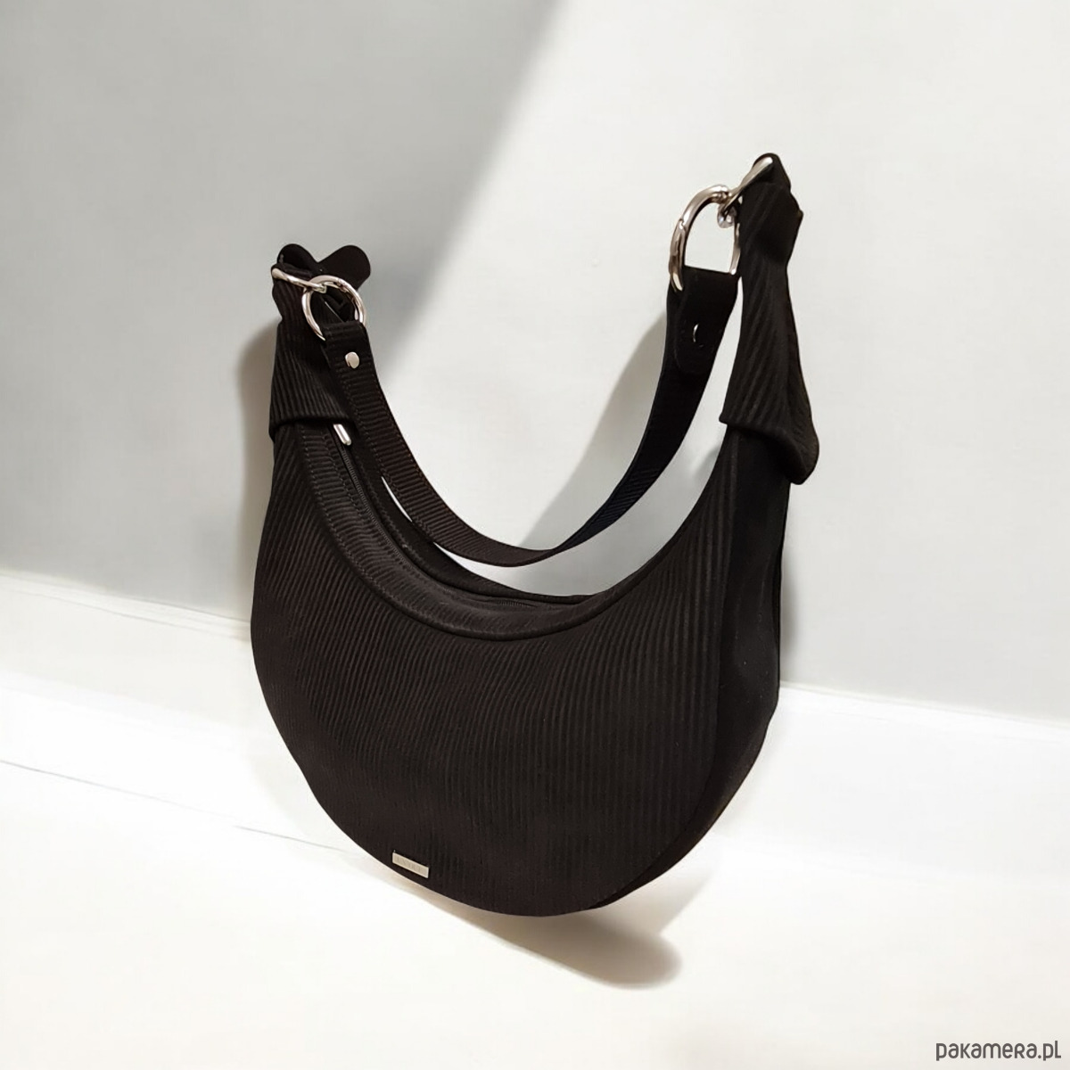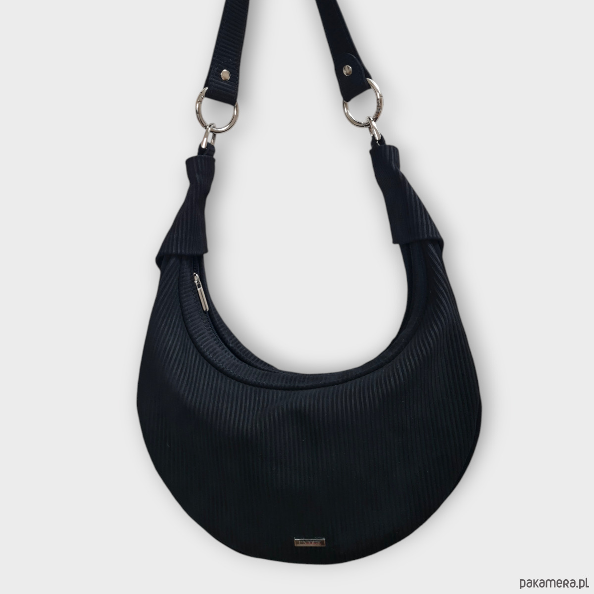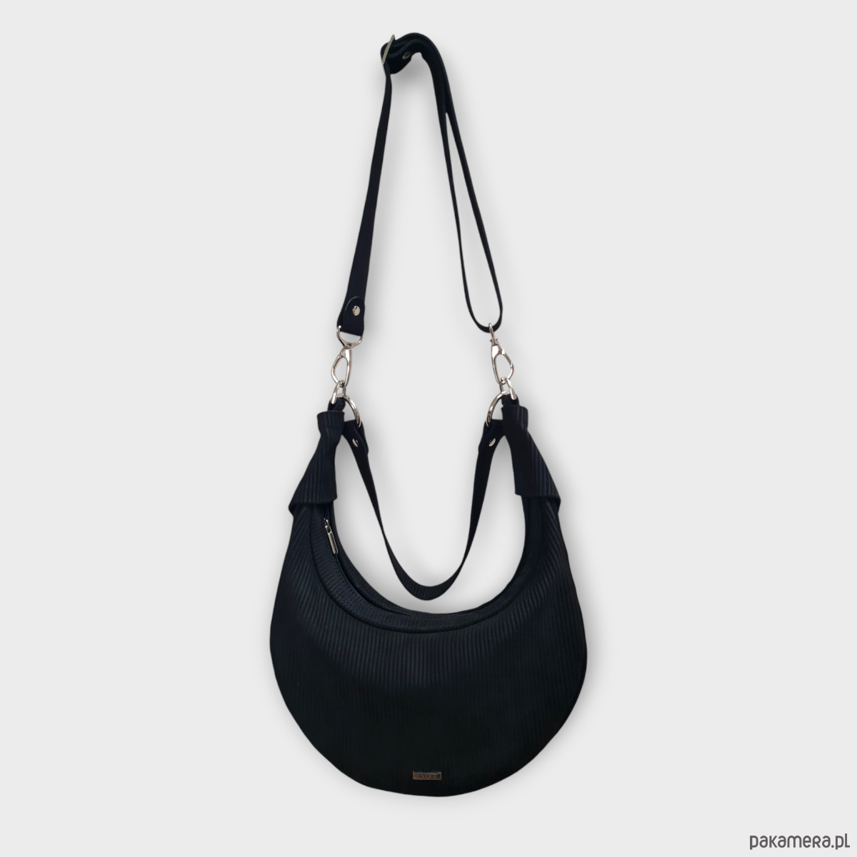 Torebka U'CARMEN typu okrągłej bagietki, czarny zamsz o fakturze sztruksu.