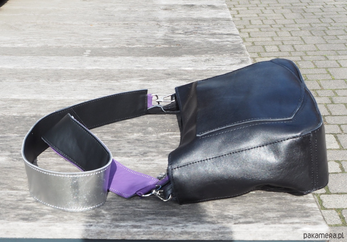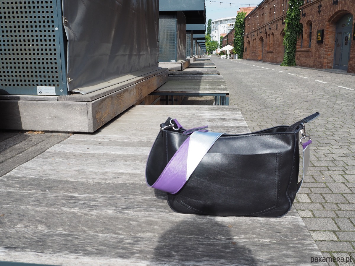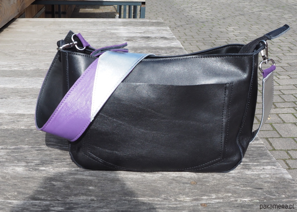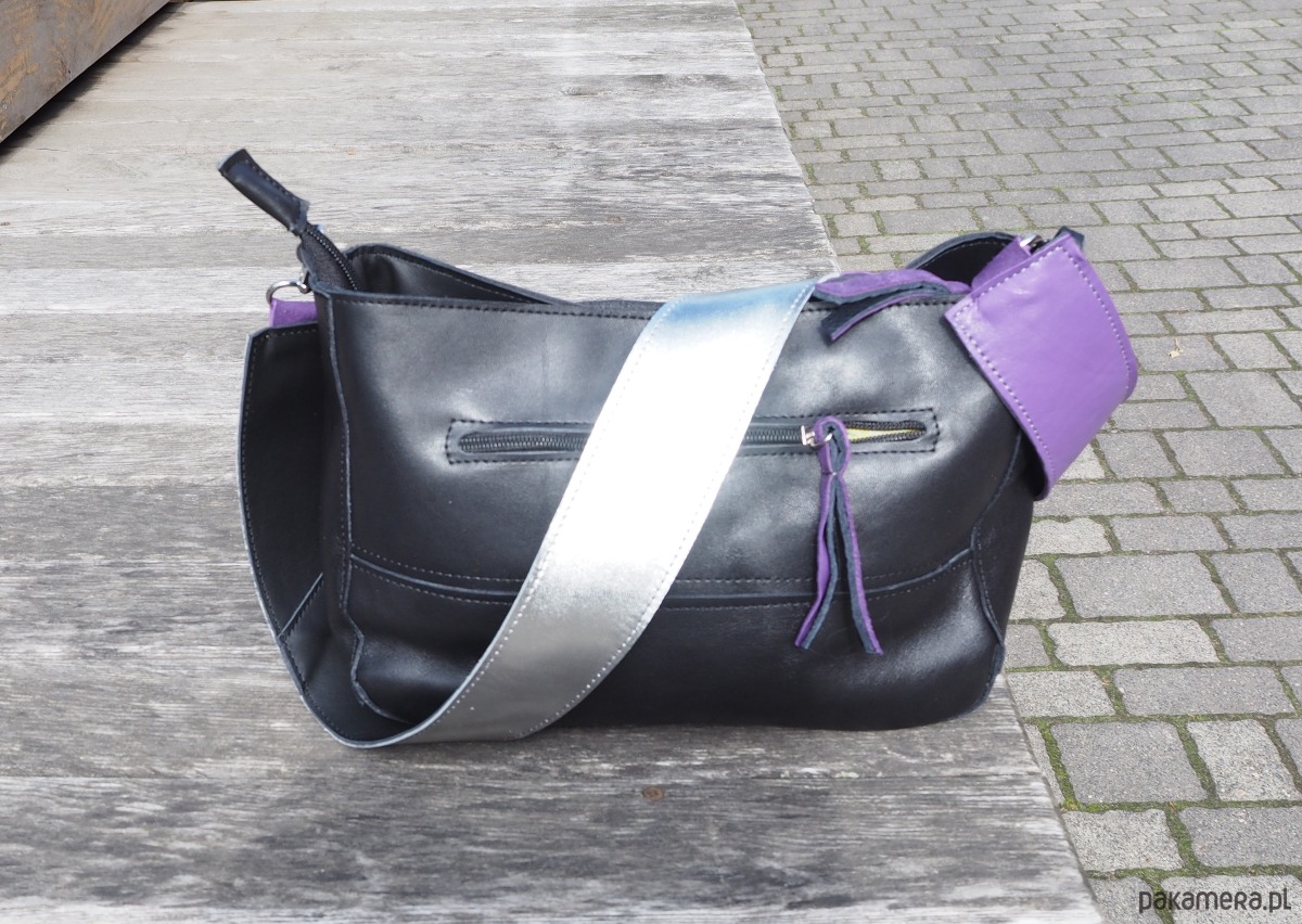 Wielkościowo jest to średniej wielkości listonoszka, która zmieści małą parasolkę, duży portfel, notes formatu a5 i sporo innych rzeczy. Przód i tył wycięte w kształcie/ wielkości kartki a4.