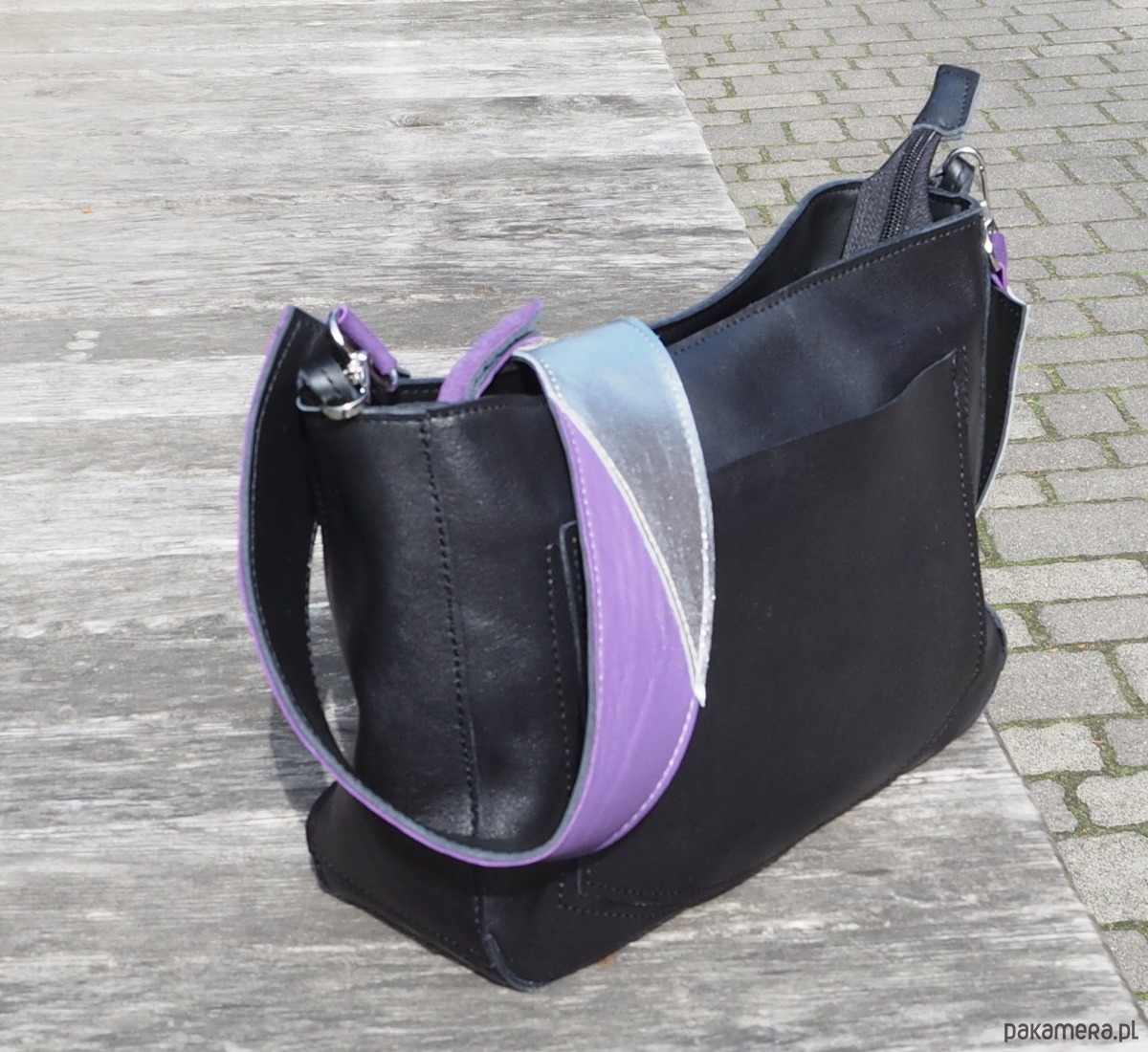 Czarna skórzana torebka. Z przodu kieszonka.