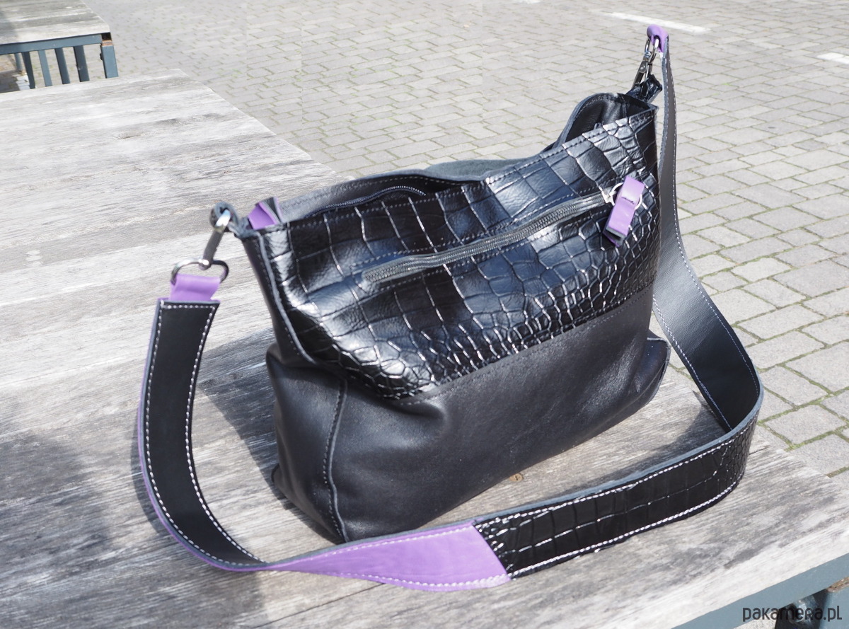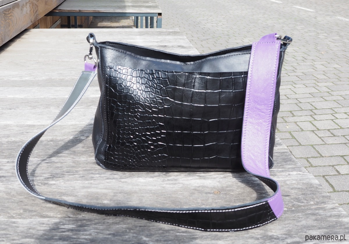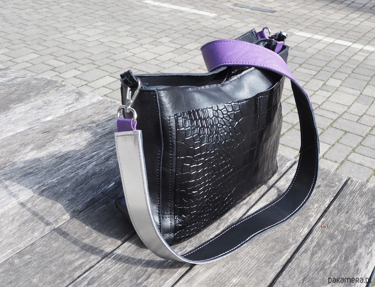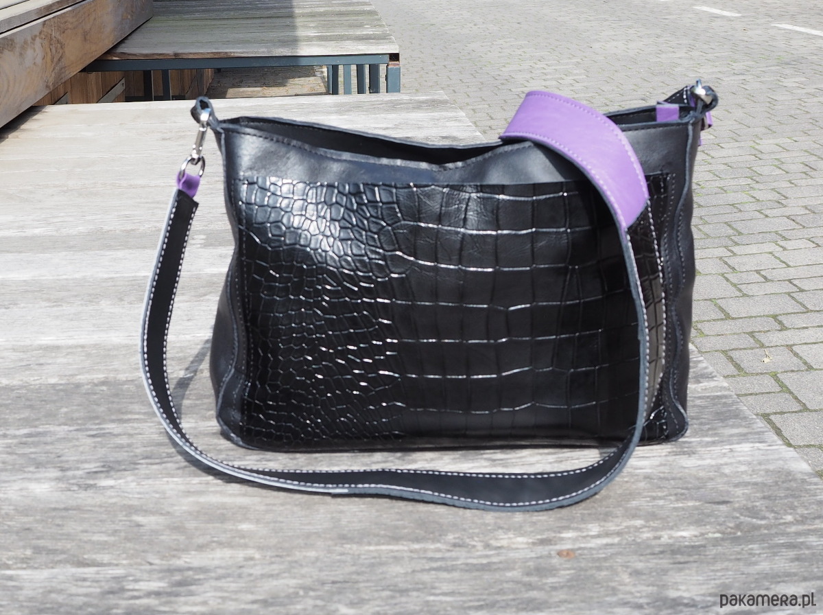 Wielkościowo jest to średniej wielkości listonoszka, która zmieści małą parasolkę, duży portfel, notes formatu a5 i sporo innych rzeczy. Przód i tył wycięte w kształcie/ wielkości kartki a4.
