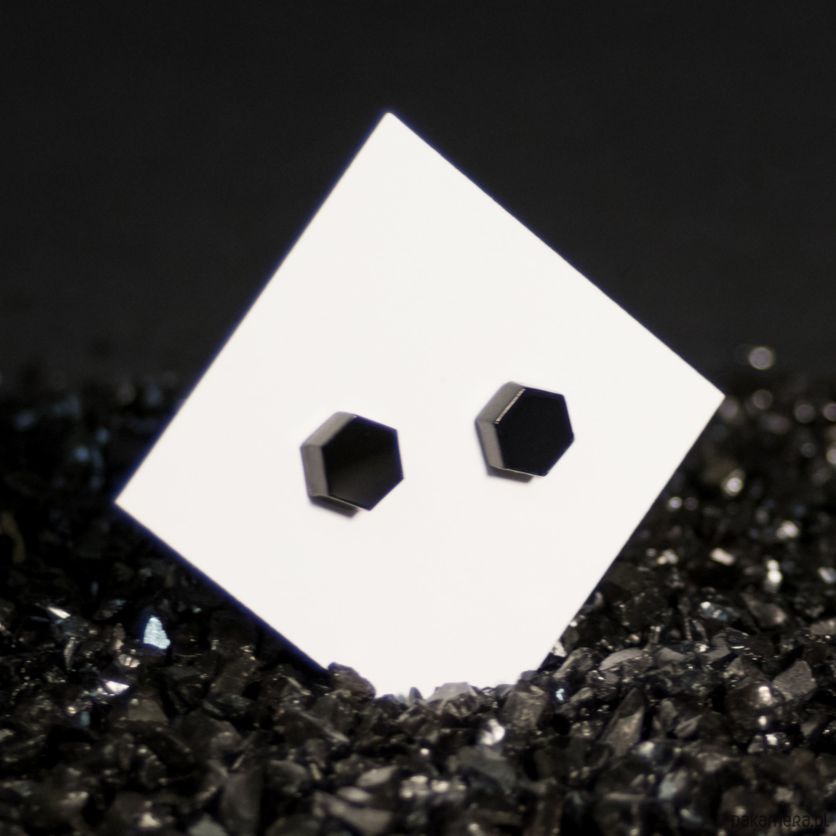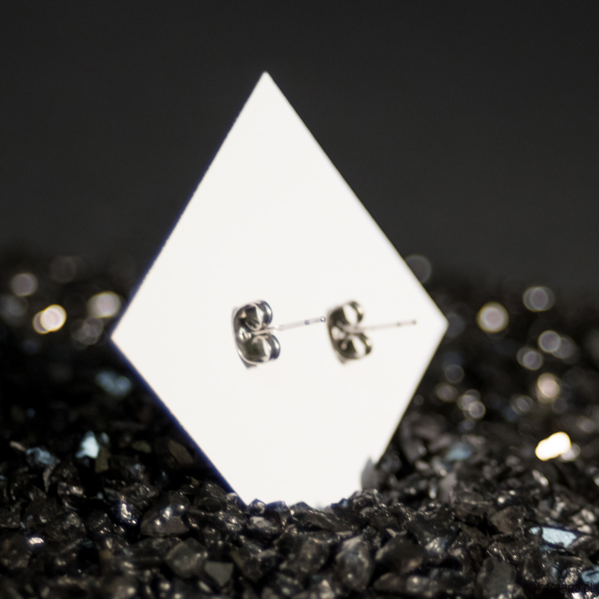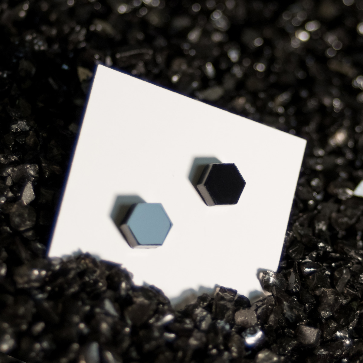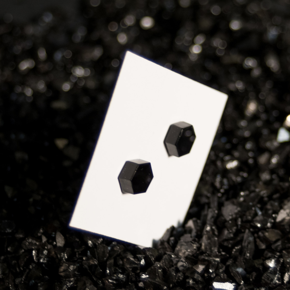 Te drobne kolczyki wykonane zostały z czarnego błyszczącego plexiglassu i są mocowane na sztyftach ze stali chirurgicznej.
