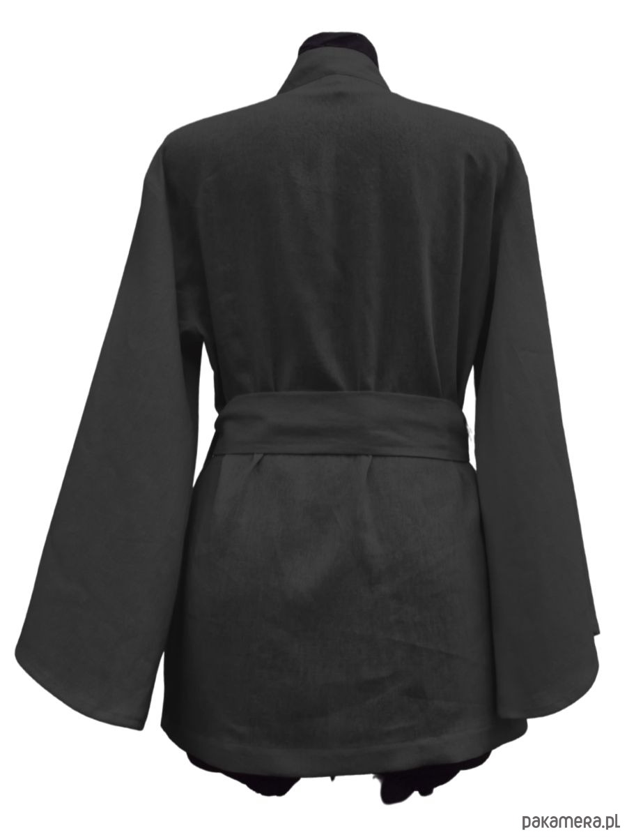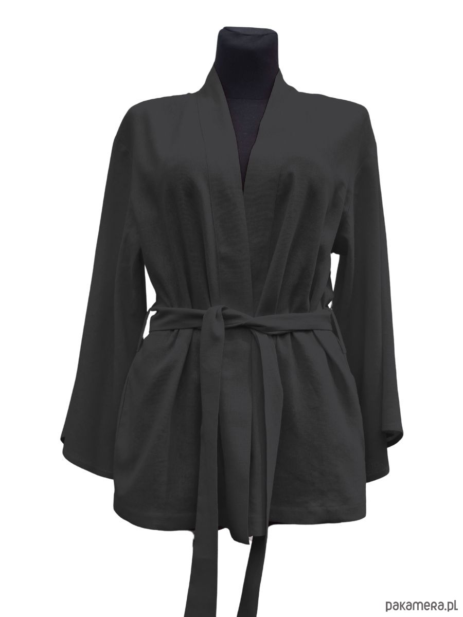 Czarne , eleganckie kimono wzorowane na japońskich kimonach HAORI. Uszyte z lnu z domieszką wiskozy, dzięki czemu jest niesamowicie wygodne w noszeniu, miłe w dotyku i nie sprawia problemu z praniem.