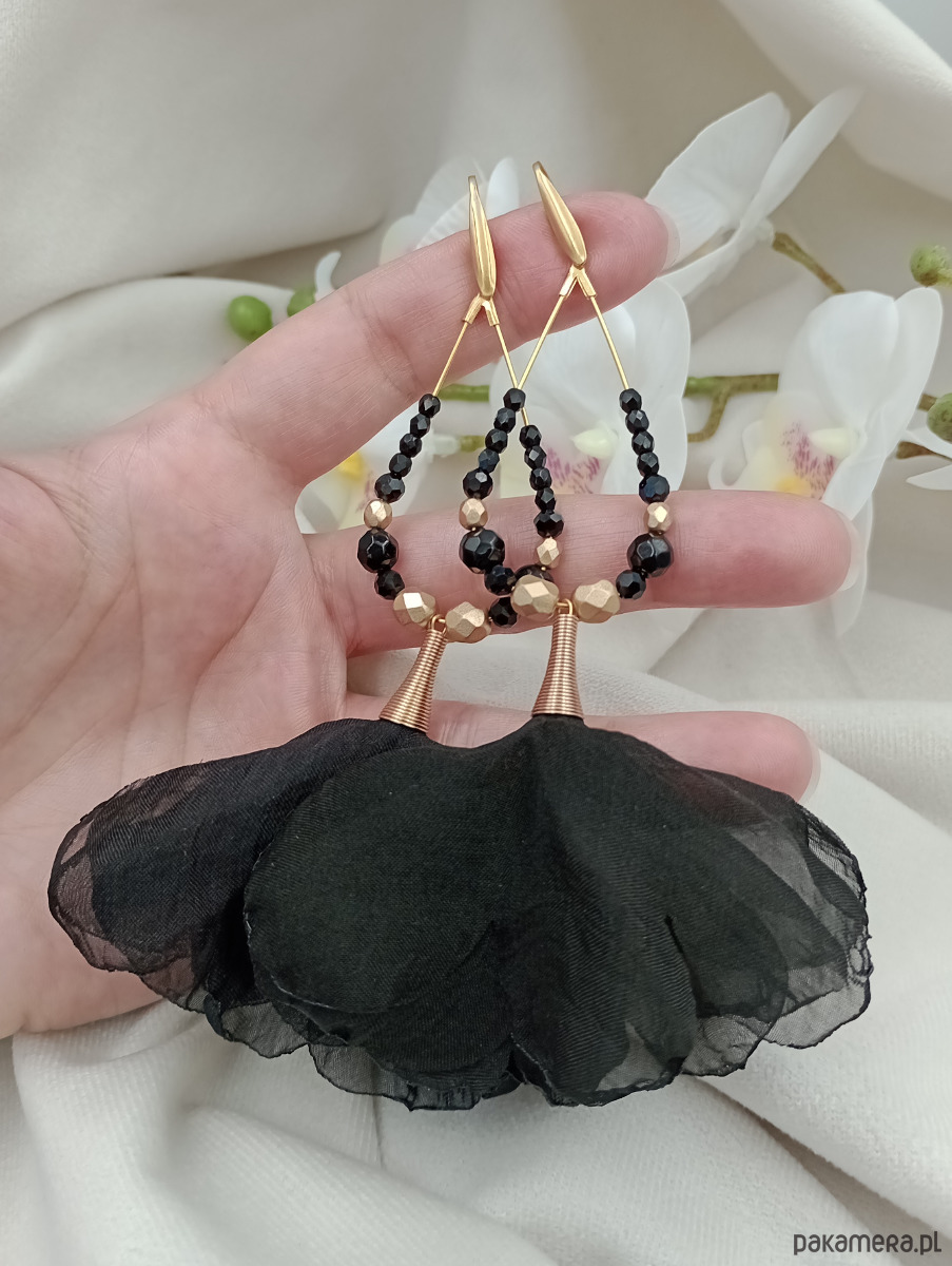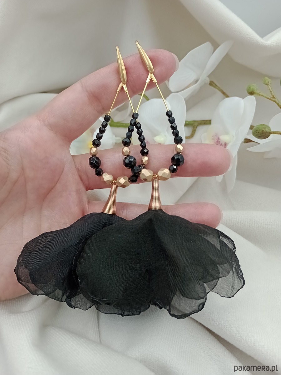 Czarne kolczyki kwiaty, ręcznie robione, z cieniutkiego i delikatnego szyfonu.