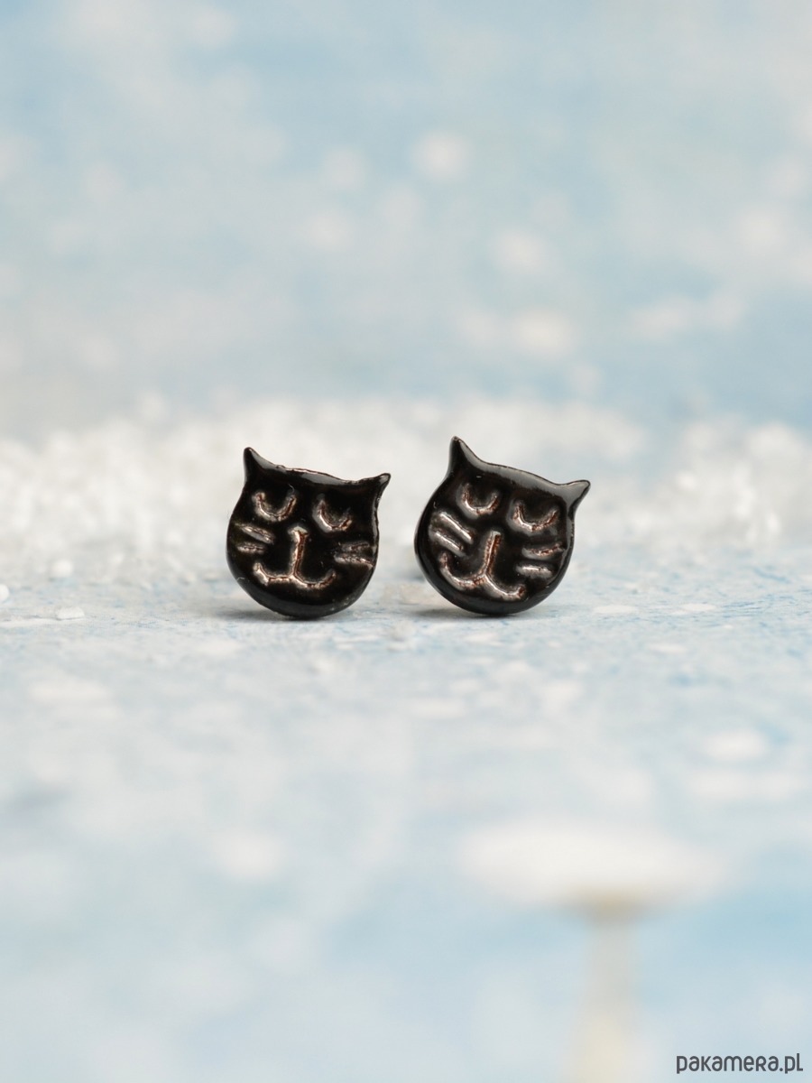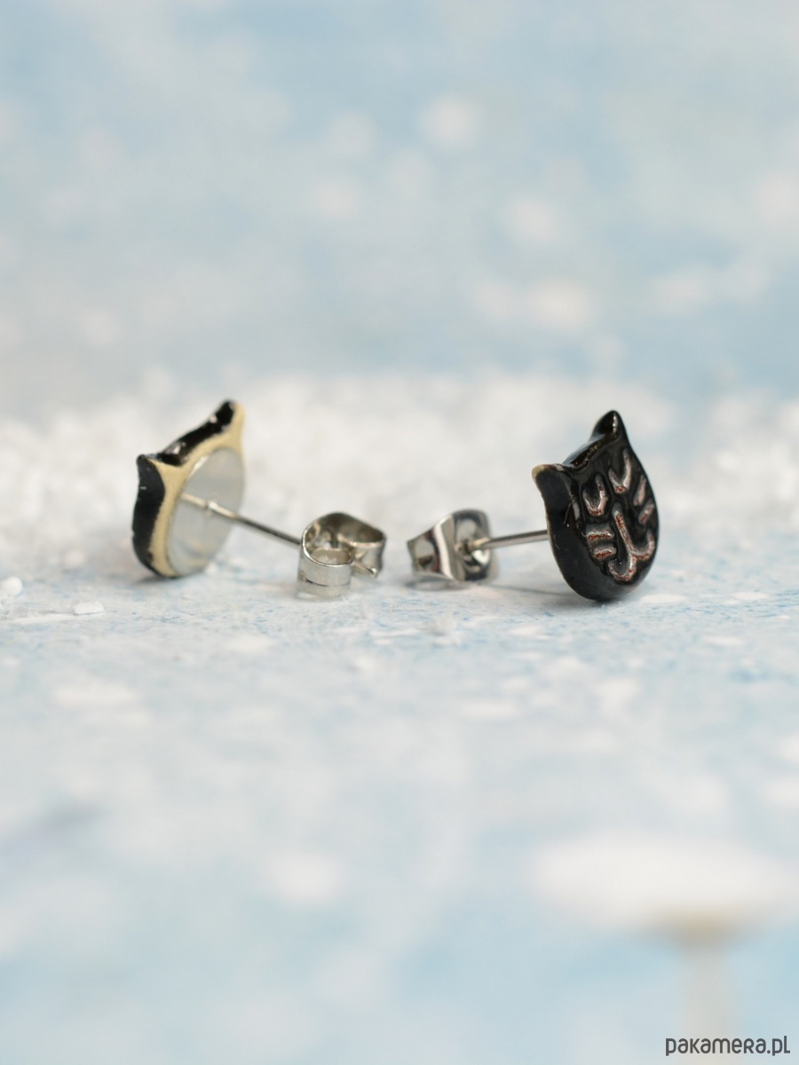 Kolczyki w kształcie kotków o wymiarach: 9x9x1,5mm. Elementy zostały poszkliwione w kolorze czarnym a wzór kociej mordki podkreśla szkliwo z silnym połyskiem. Elementy ceramiczne zostały przeze mnie dopracowane w najmniejszym szczególe :))) Kolczyki są solidnie umocowane na sztyftach ze stali chirurgicznej- antyalergiczna, w kolorze oksydowanego srebra. Polecam!!