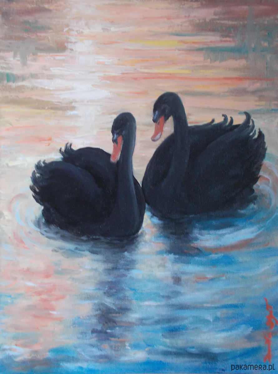 Czarne łabędzie - autorski obraz olejny 30 x 40 cm, sygnowany. Do wykonania obrazu użyto podobrazia malarskiego wykonanego ze sztywnej 2 milimetrowej sklejki, na którą zostało trwale przyklejone bawełniane płótno o fakturze lnianej kanwy, gruntowane profesjonalnym gruntem typu gesso. Dzięki niewielkiej grubości podobrazia, obraz może zostać oprawiony w dużo płytsze, a przez to tańsze ramy. Do obrazu dołączony Certyfikat autentyczności.