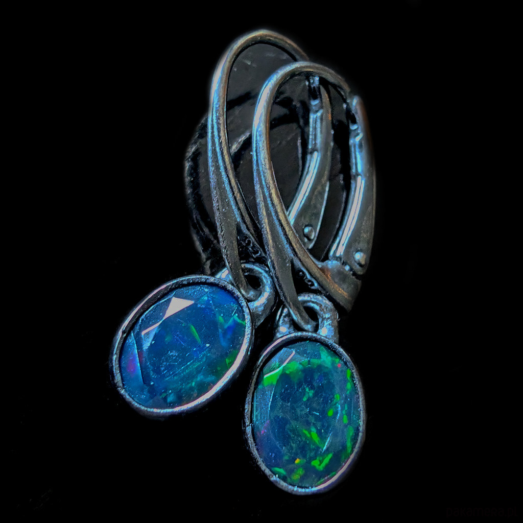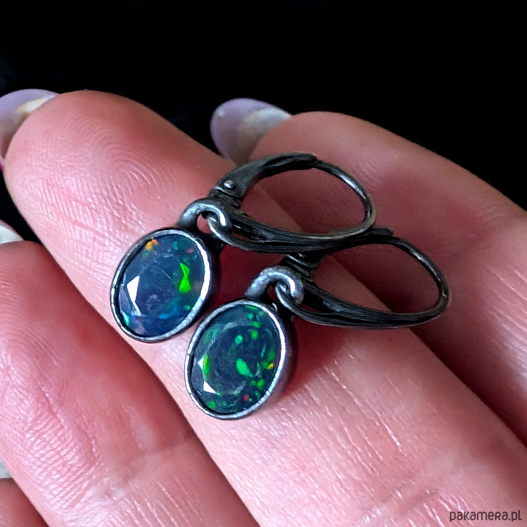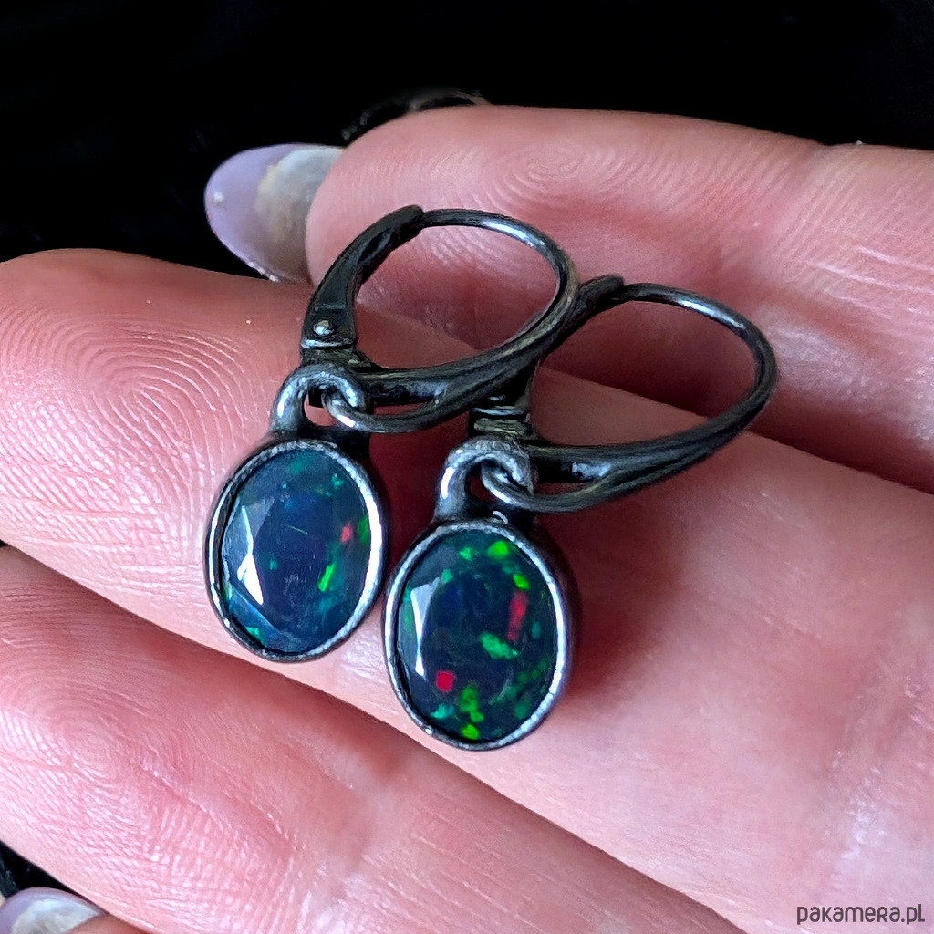 Kolczyki wykonane z oksydowanego srebra 925 oraz czarnych opali szlachetnych z Etiopii. Kamienie zachwycają multikolorową opalizacją spotęgowaną precyzyjnym szlifem. Kamienie mają 9 x 7 mm. Zapinane na klasyczne bigle angielskie. Długość całości z biglami 28mm. Leciutkie,waga jednego kolczyka 1,4 grama. Kolczyki zostaną zapakowane w ozdobne pudełeczko. Do kompletu polecam wisiorek, można zamówić również pierścionek w konkretnym rozmiarze jubilerskim.