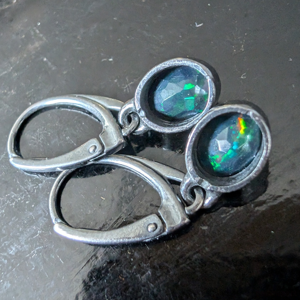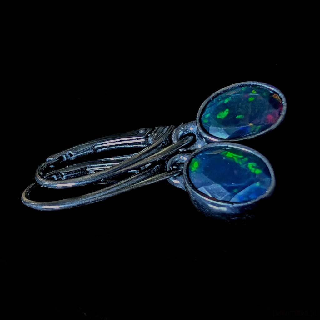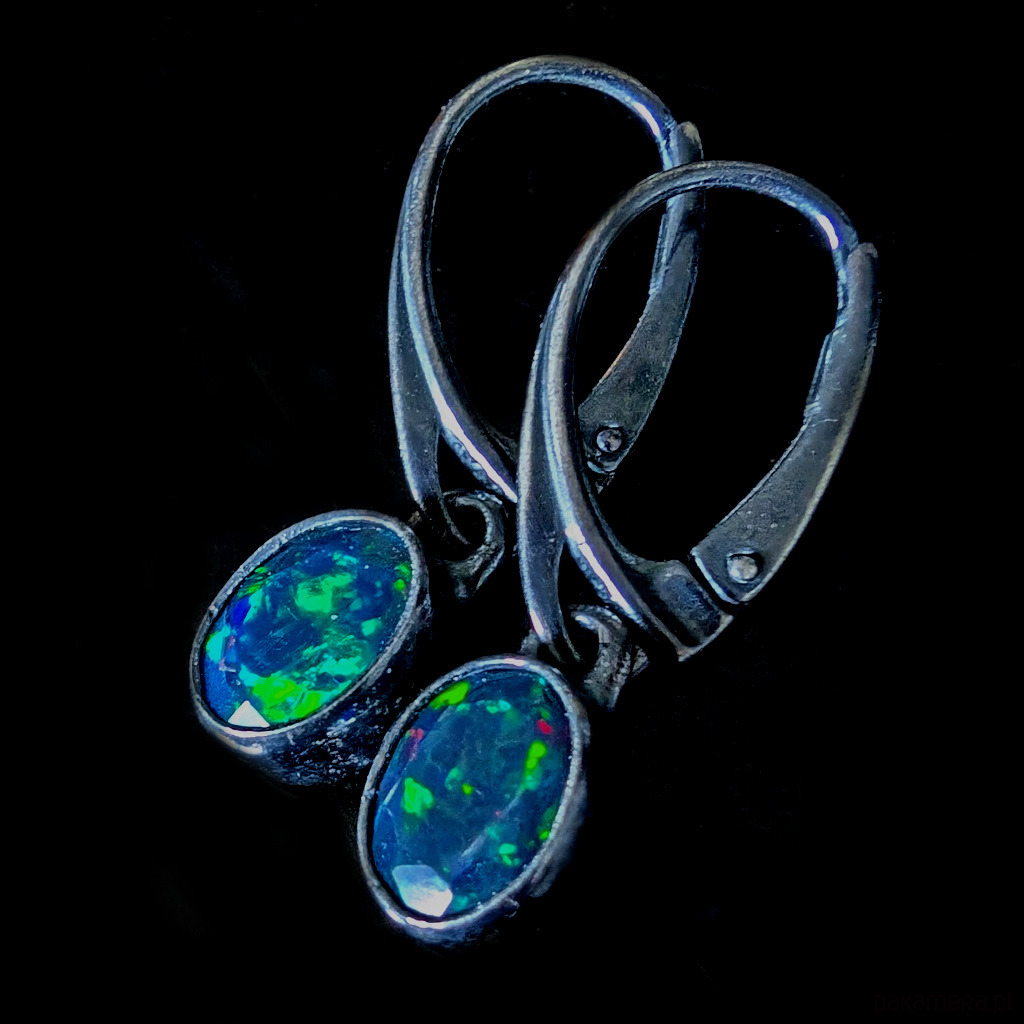 Kolczyki wykonane z oksydowanego srebra 925 oraz czarnych opali szlachetnych z Etiopii. Kamienie zachwycają multikolorową opalizacją spotęgowaną precyzyjnym szlifem. Kamienie mają 9 x 7 mm. Zapinane na klasyczne bigle angielskie. Długość całości z biglami 28mm. Leciutkie,waga jednego kolczyka 1,4 grama. Kolczyki zostaną zapakowane w ozdobne pudełeczko. Do kompletu polecam wisiorek, można zamówić również pierścionek w konkretnym rozmiarze jubilerskim.