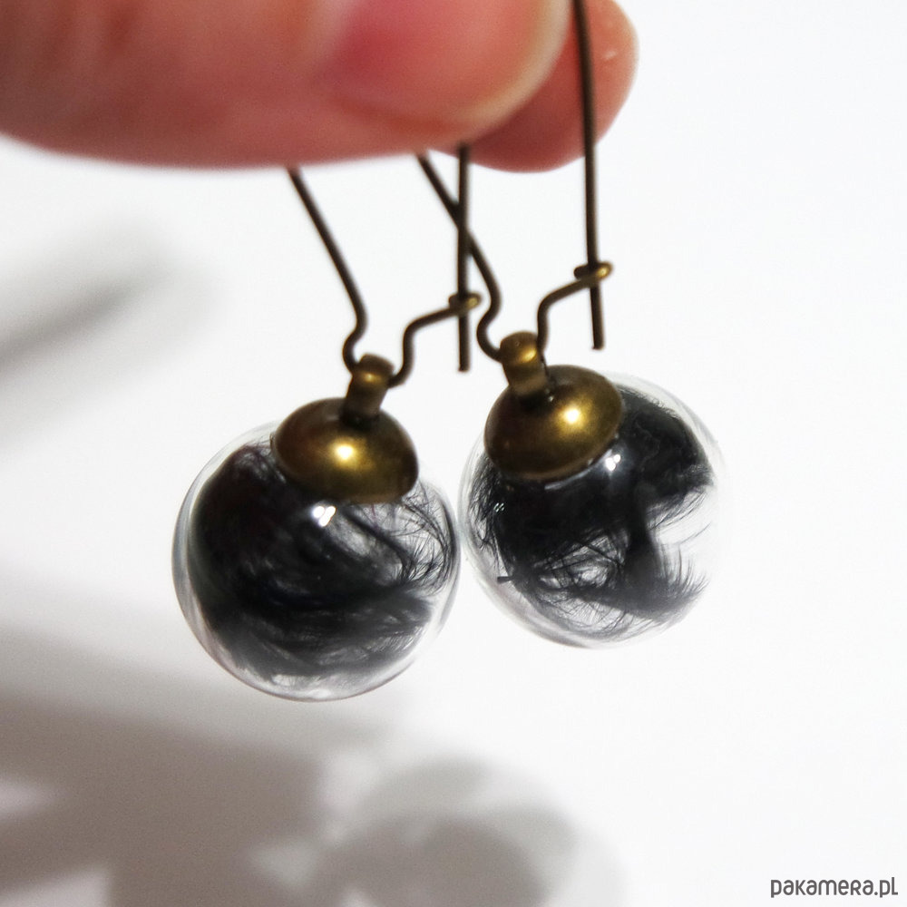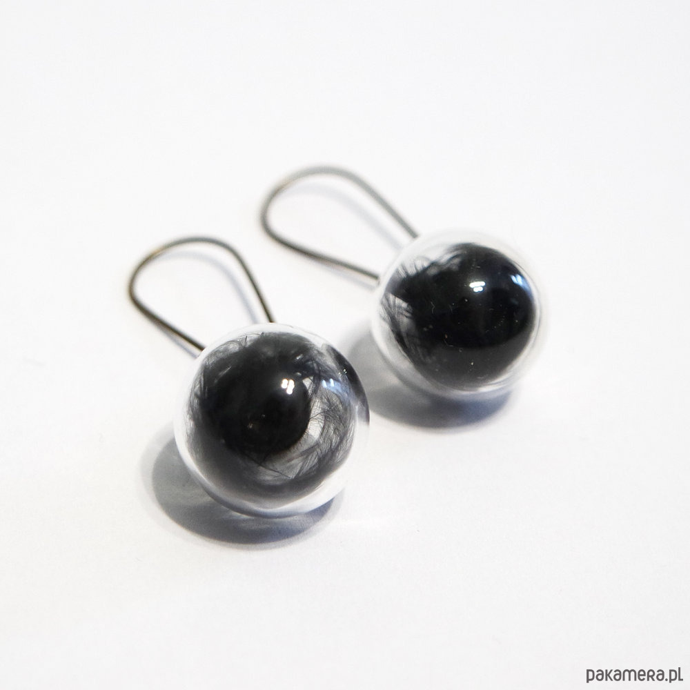 Delikatne, czarne piórka umieszczone w szklanych bańkach o średnicy ok. 1,5 cm.