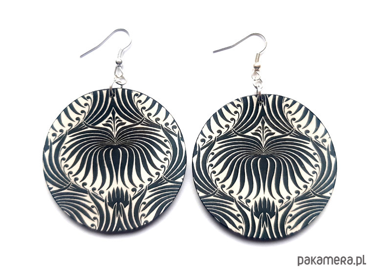 kolczyki drewniane, ozdobione metodą decoupage, dwustronne, starannie wykończone farbami akrylowymi i zabezpieczone wielokrotnie lakierem, bigle posrebrzane, długość kolczyków bez bigli: 5,5 cm, średnica: 5 cm, bardzo lekkie