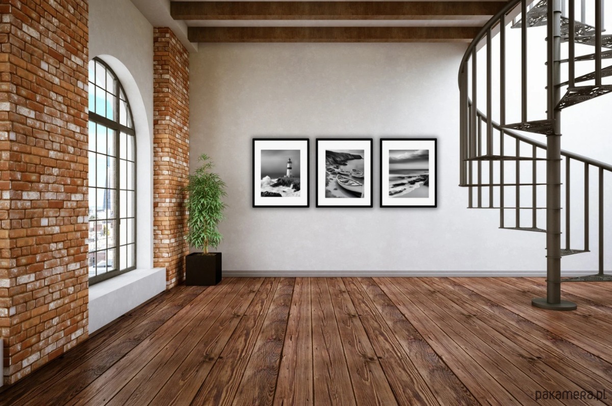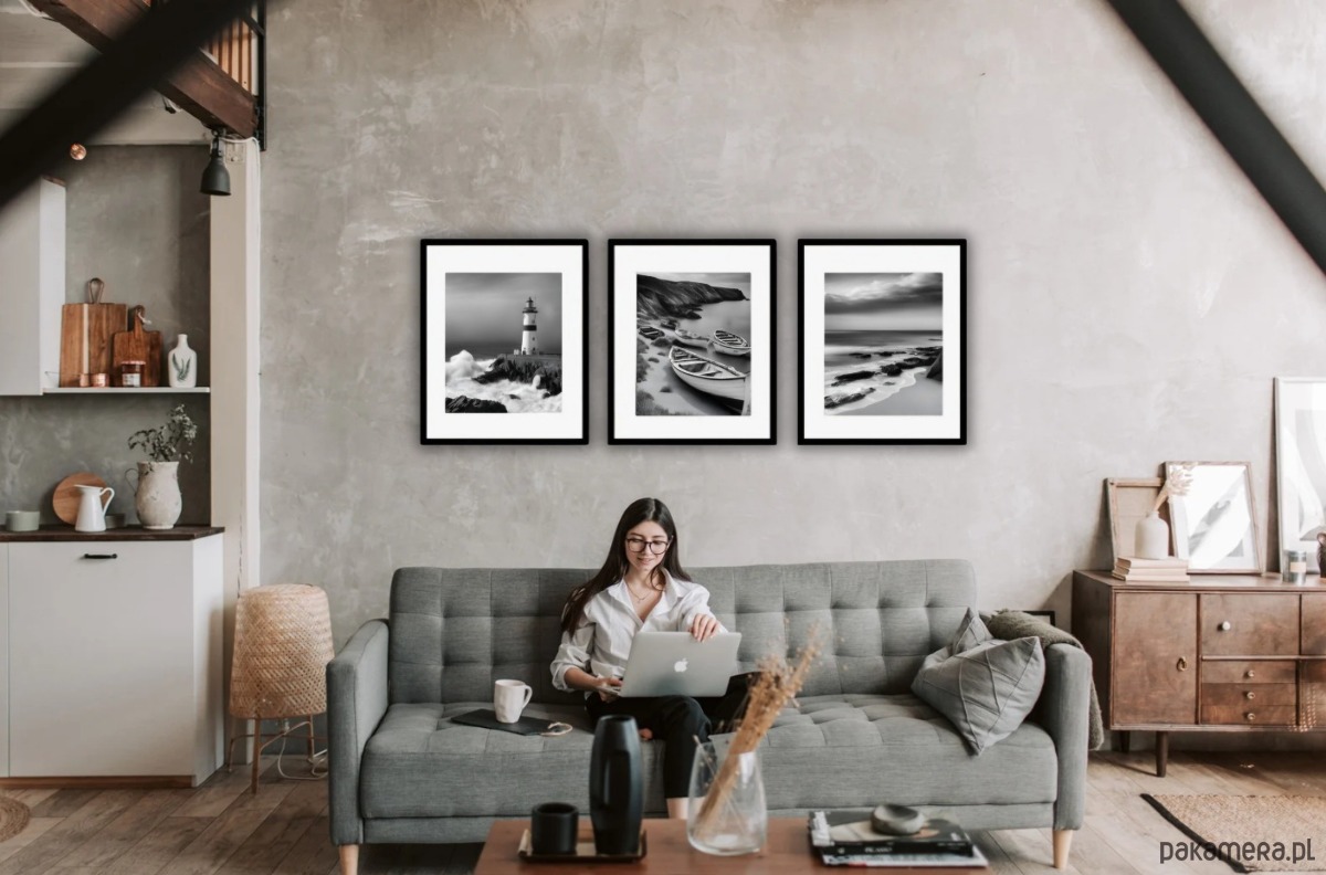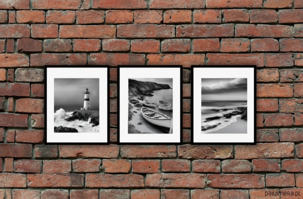 Czarno biała galeria ścienna z motywem nadmorskim.