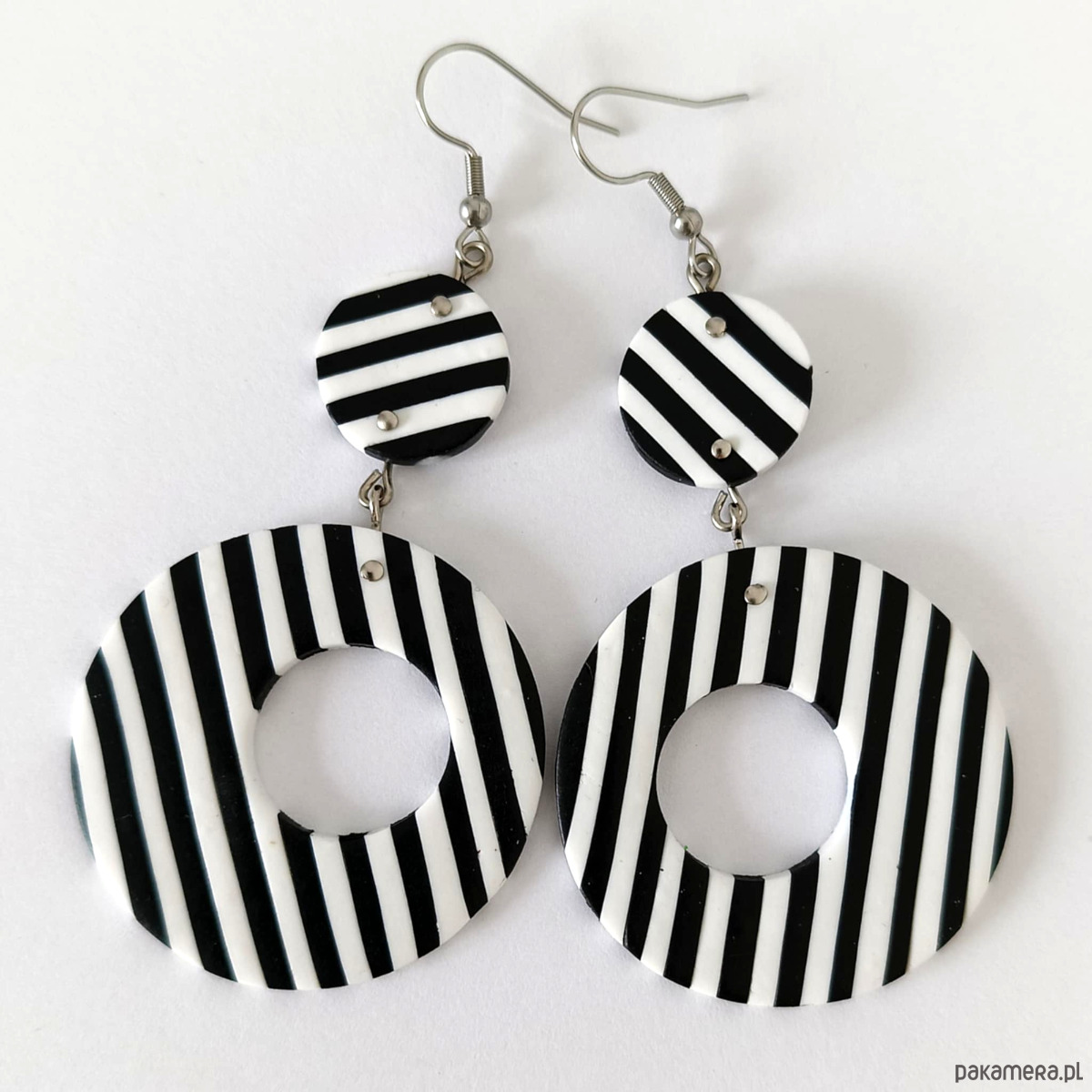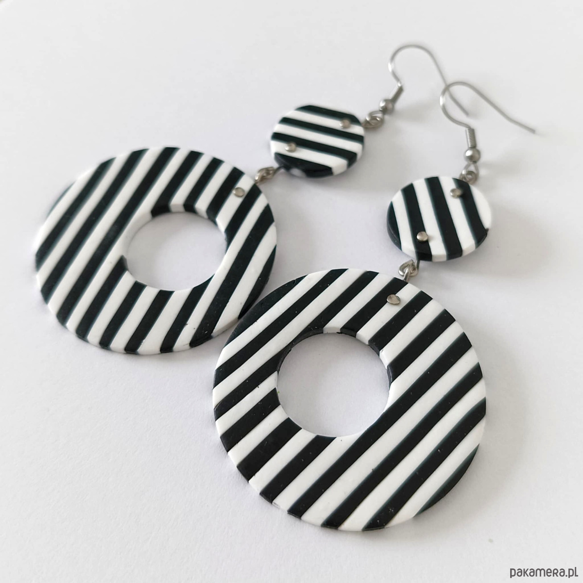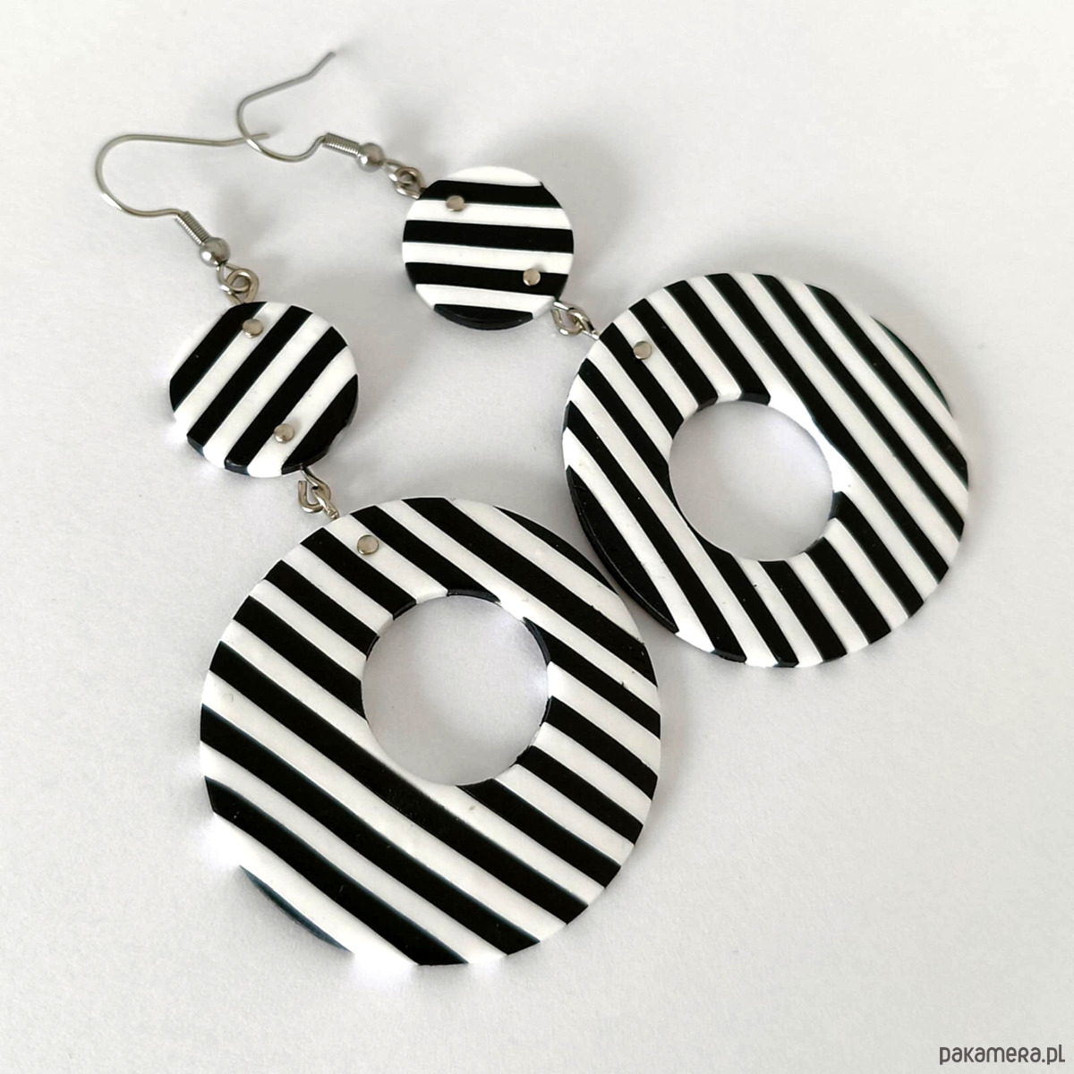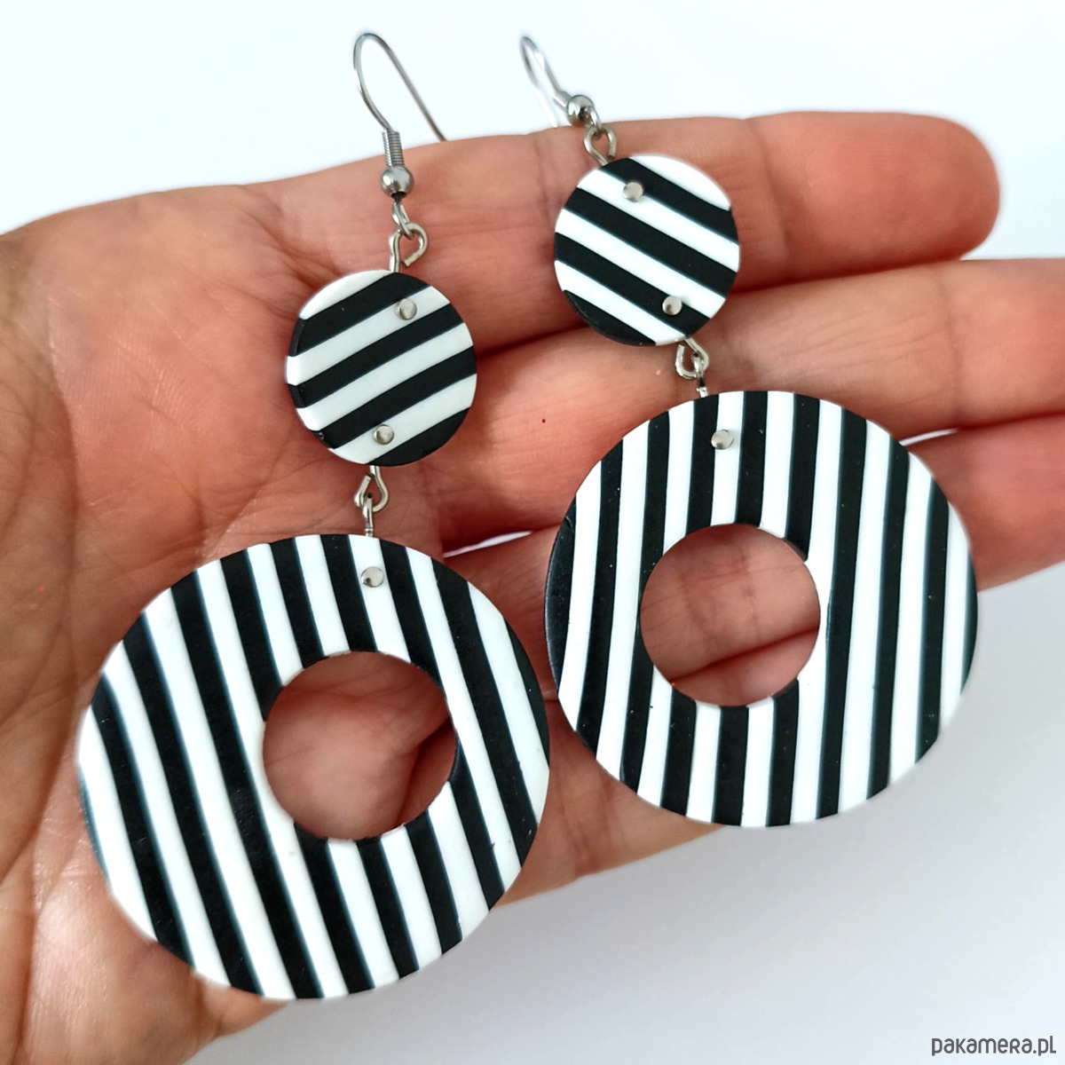 Ręcznie robione kolczyki w kontrastowe czarno-białe paski to odważna i nowoczesna propozycja dla osób, które kochają wyraziste dodatki. Geometryczna forma i lekkość masy termoutwardzalnej sprawiają, że są wygodne w noszeniu, a jednocześnie przyciągają wzrok. Idealne na prezent lub do urozmaicenia codziennej stylizacji.