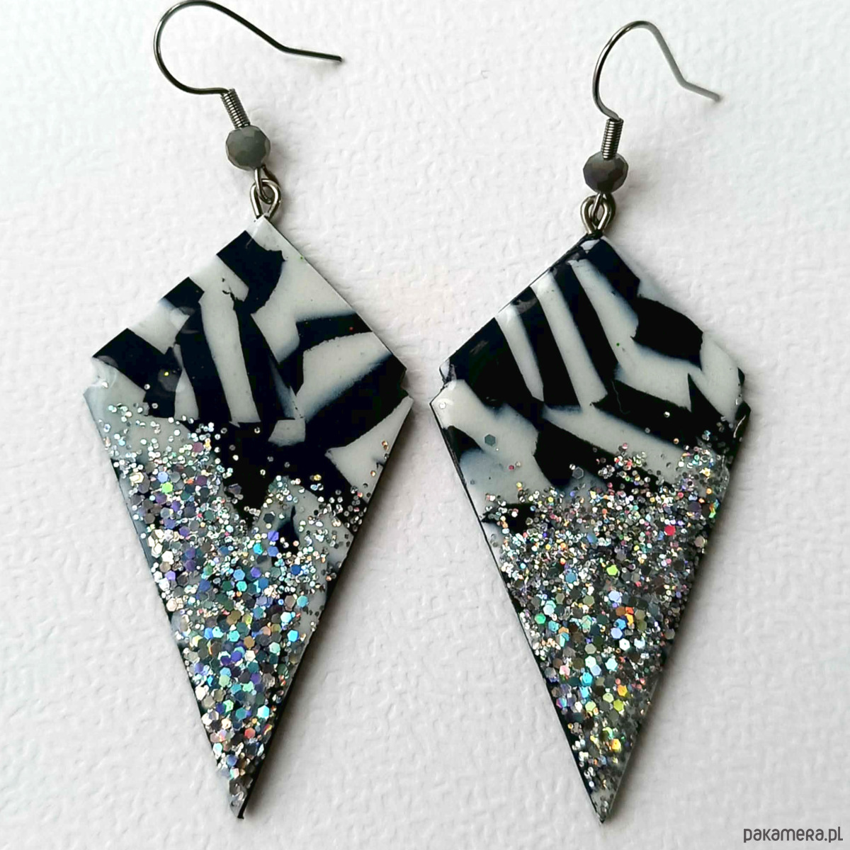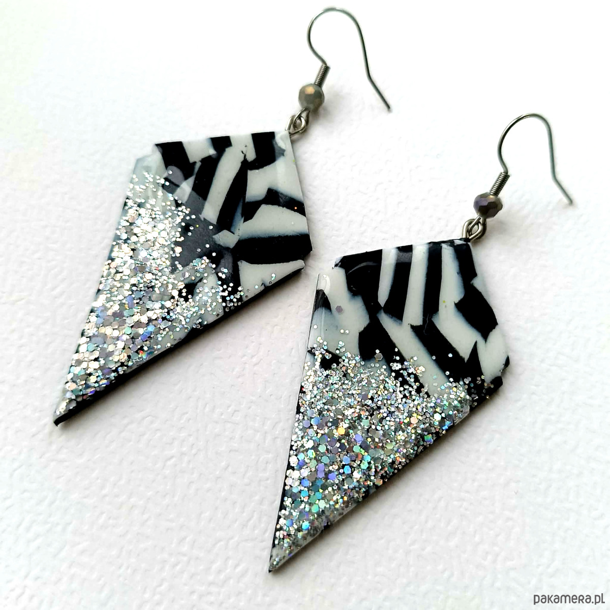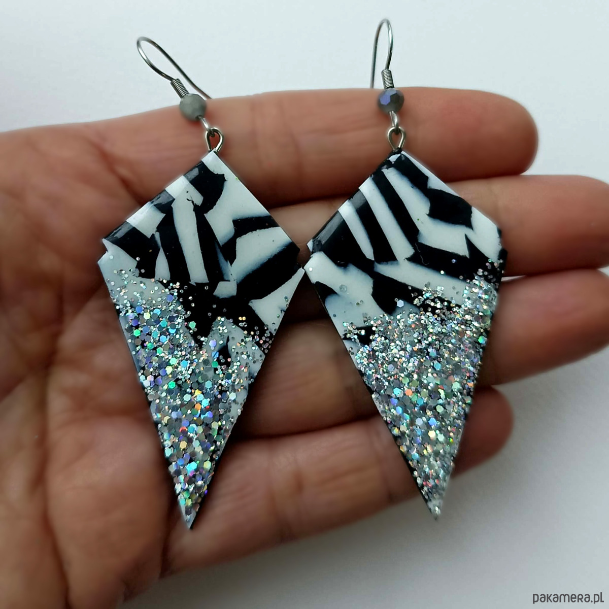 Efektowne, czarno-białe kolczyki typu statement, które przyciągają spojrzenia i dodają stylizacji wyjątkowego charakteru. Połączenie kontrastowych kolorów z holograficznym srebrnym brokatowym połyskiem sprawia, że kolczyki pięknie odbijają światło i idealnie sprawdzą się na imprezy, festiwale, karnawał czy wieczorne wyjścia.