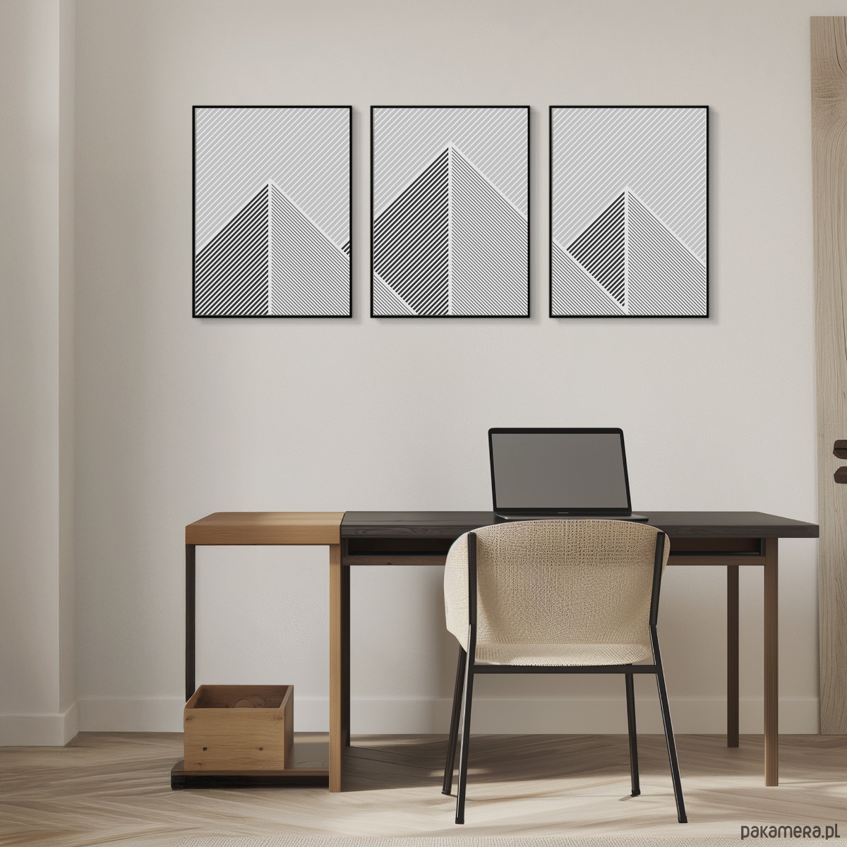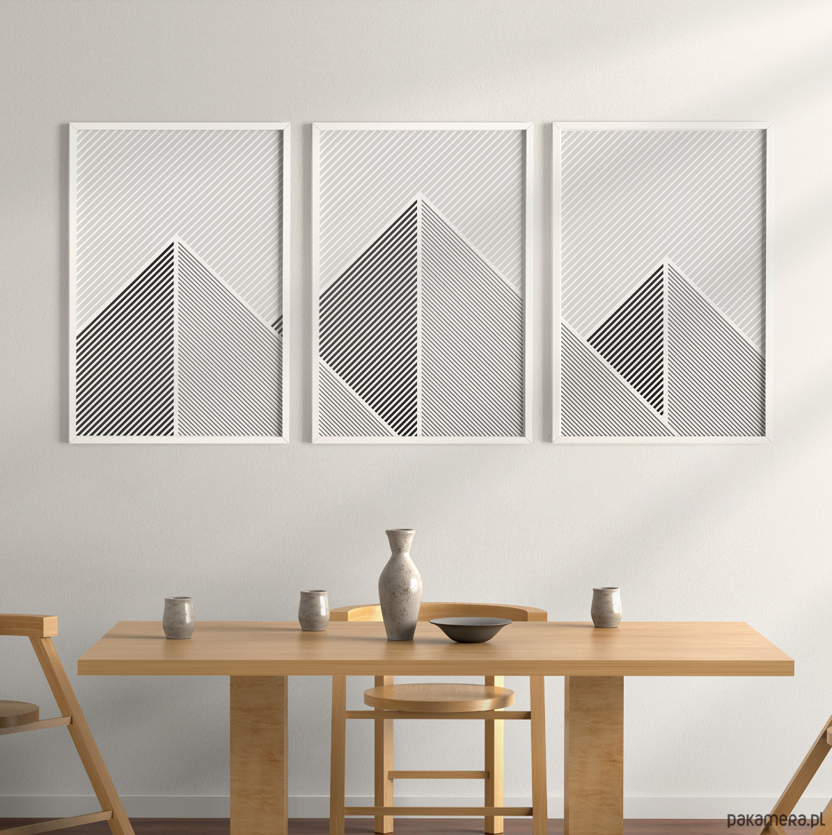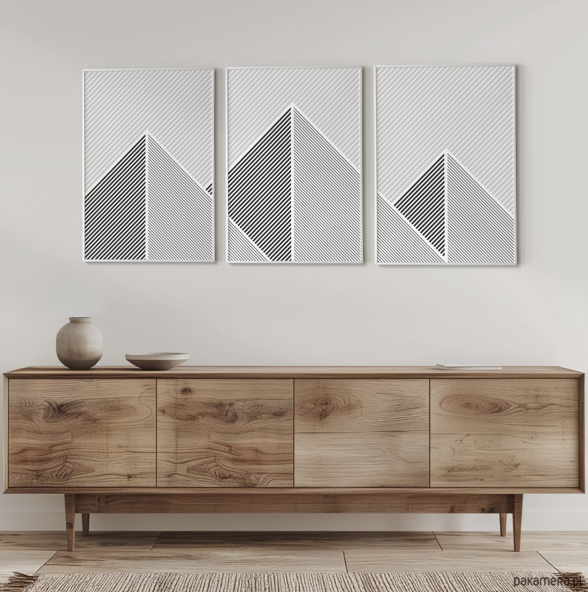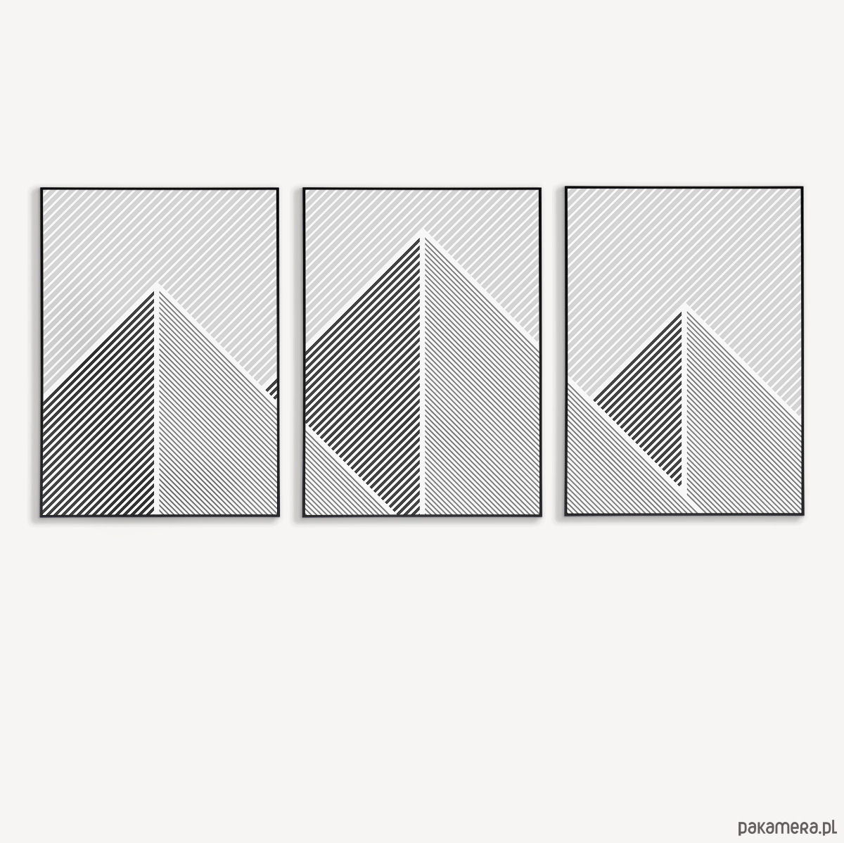 Tryptyk plakatów graficznych z motywem przypominającym górski krajobraz. Proste, geometryczne formy oraz czarno-biała paleta tworzą spójną kompozycję, która dobrze odnajdzie się w aranżacjach w stylu loftowym, nowoczesnym, czy też minimalistycznym.