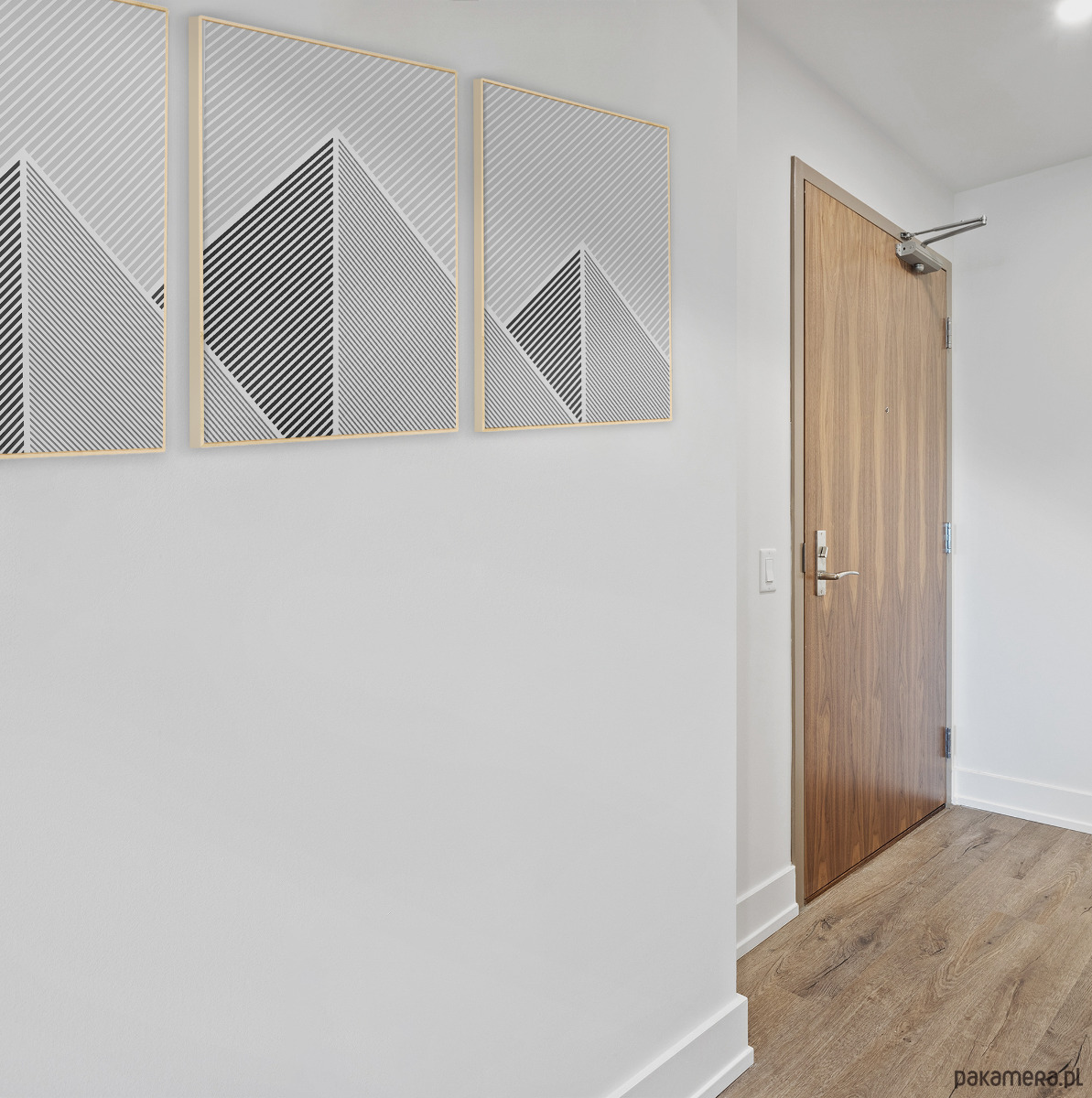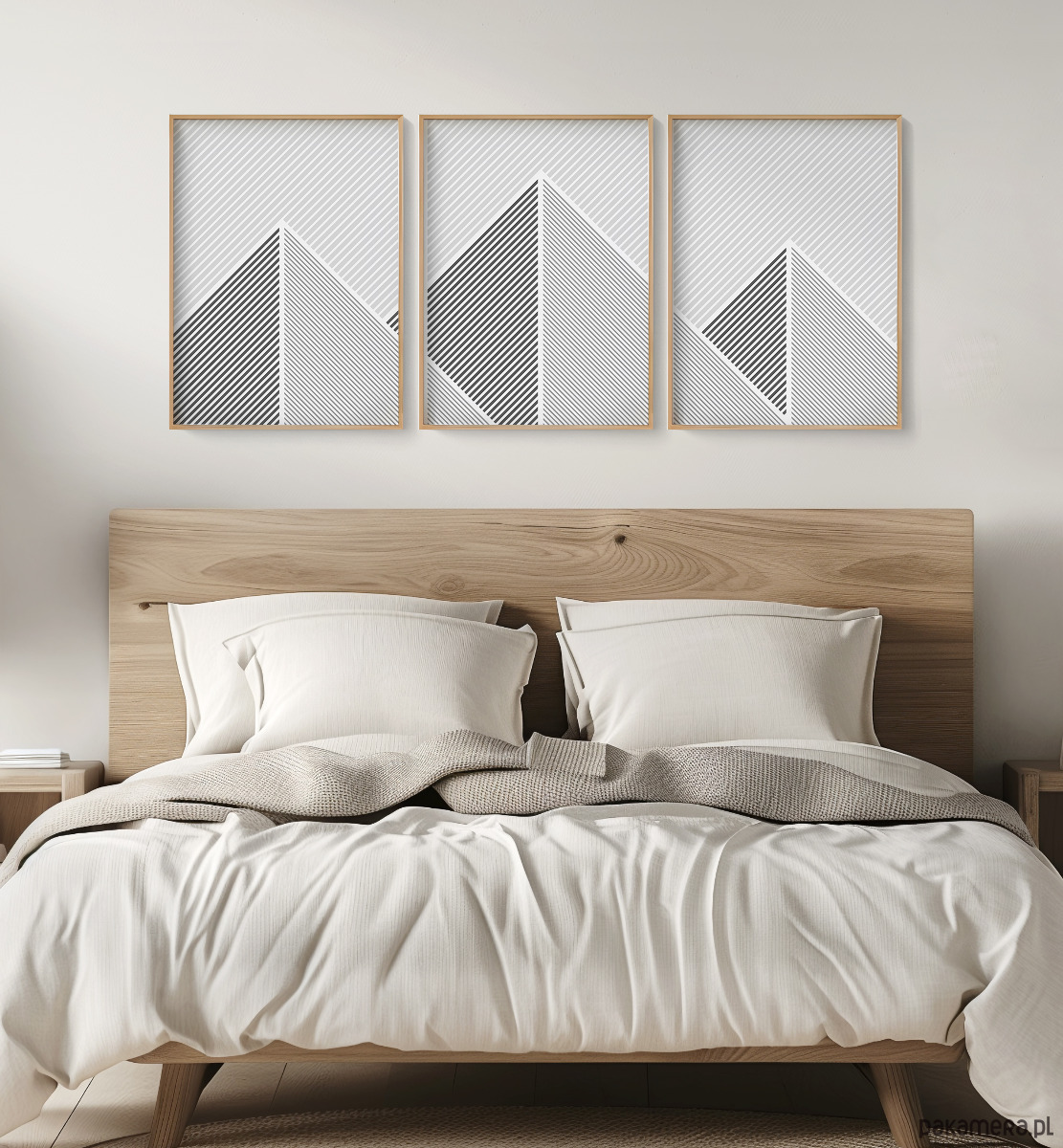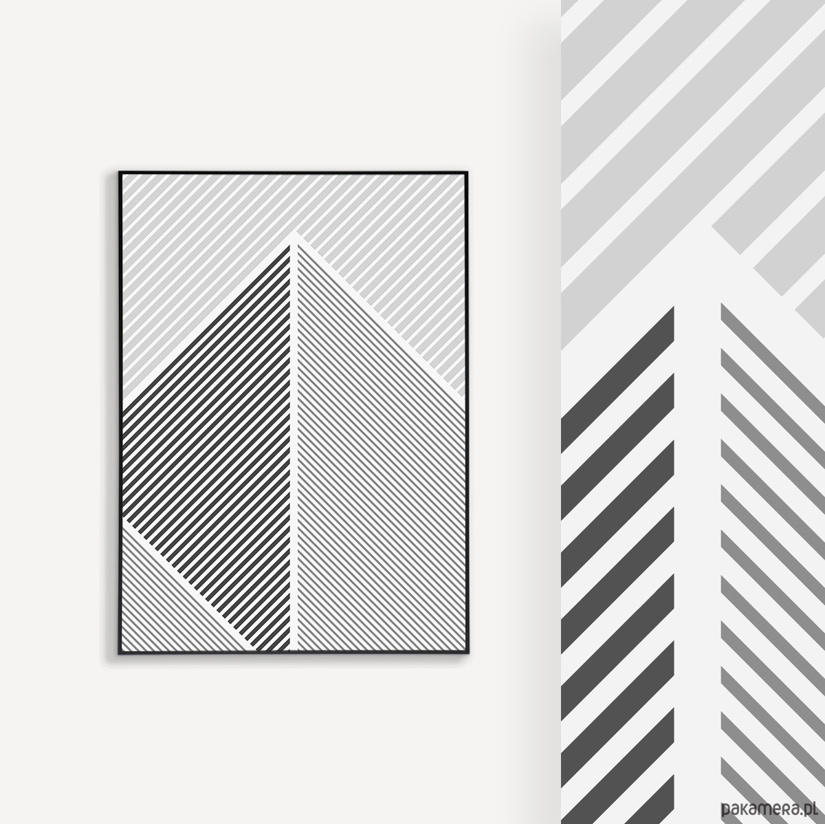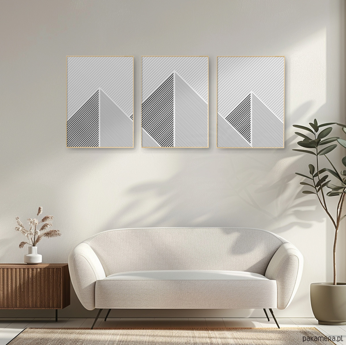 Tryptyk plakatów graficznych z motywem przypominającym górski krajobraz. Proste, geometryczne formy oraz czarno-biała paleta tworzą spójną kompozycję, która dobrze odnajdzie się w aranżacjach w stylu loftowym, nowoczesnym, czy też minimalistycznym.