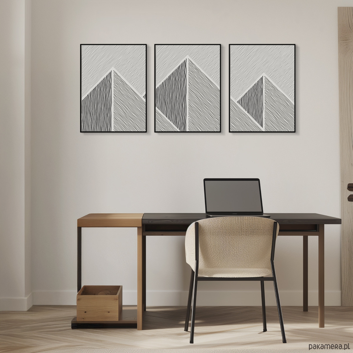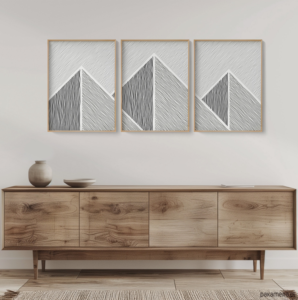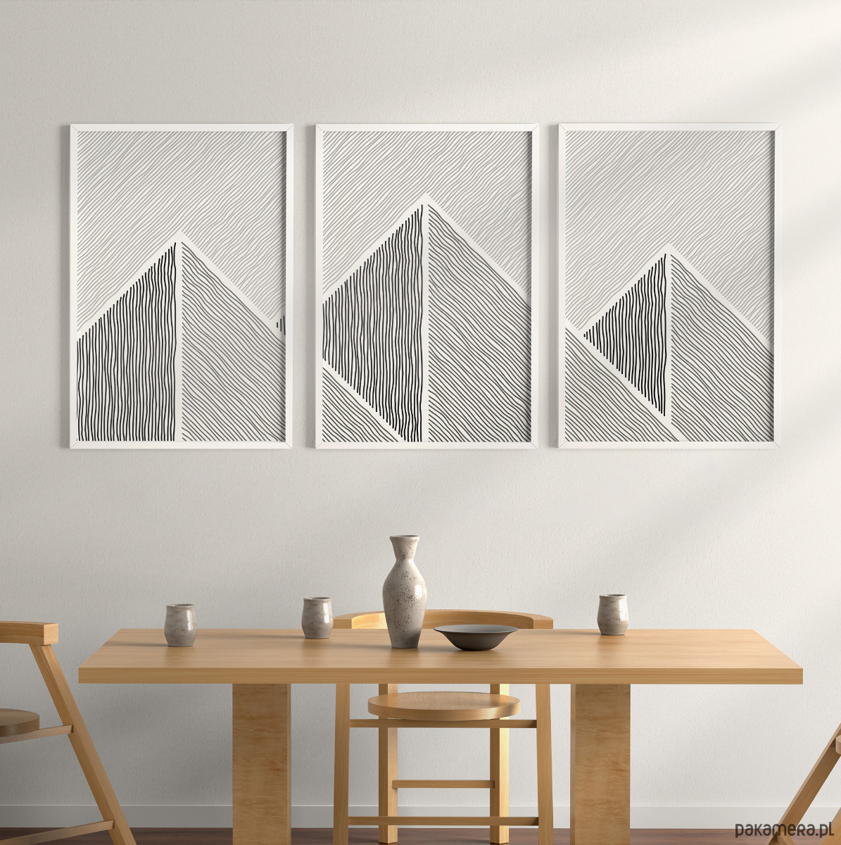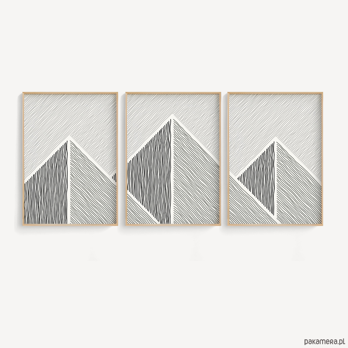 Tryptyk plakatów graficznych z motywem przypominającym górski krajobraz. Proste, geometryczne formy oraz czarno-biała kolorystyka tworzą spójną kompozycję, która dobrze odnajdzie się w aranżacjach w stylu loftowym, nowoczesnym, czy też minimalistycznym.