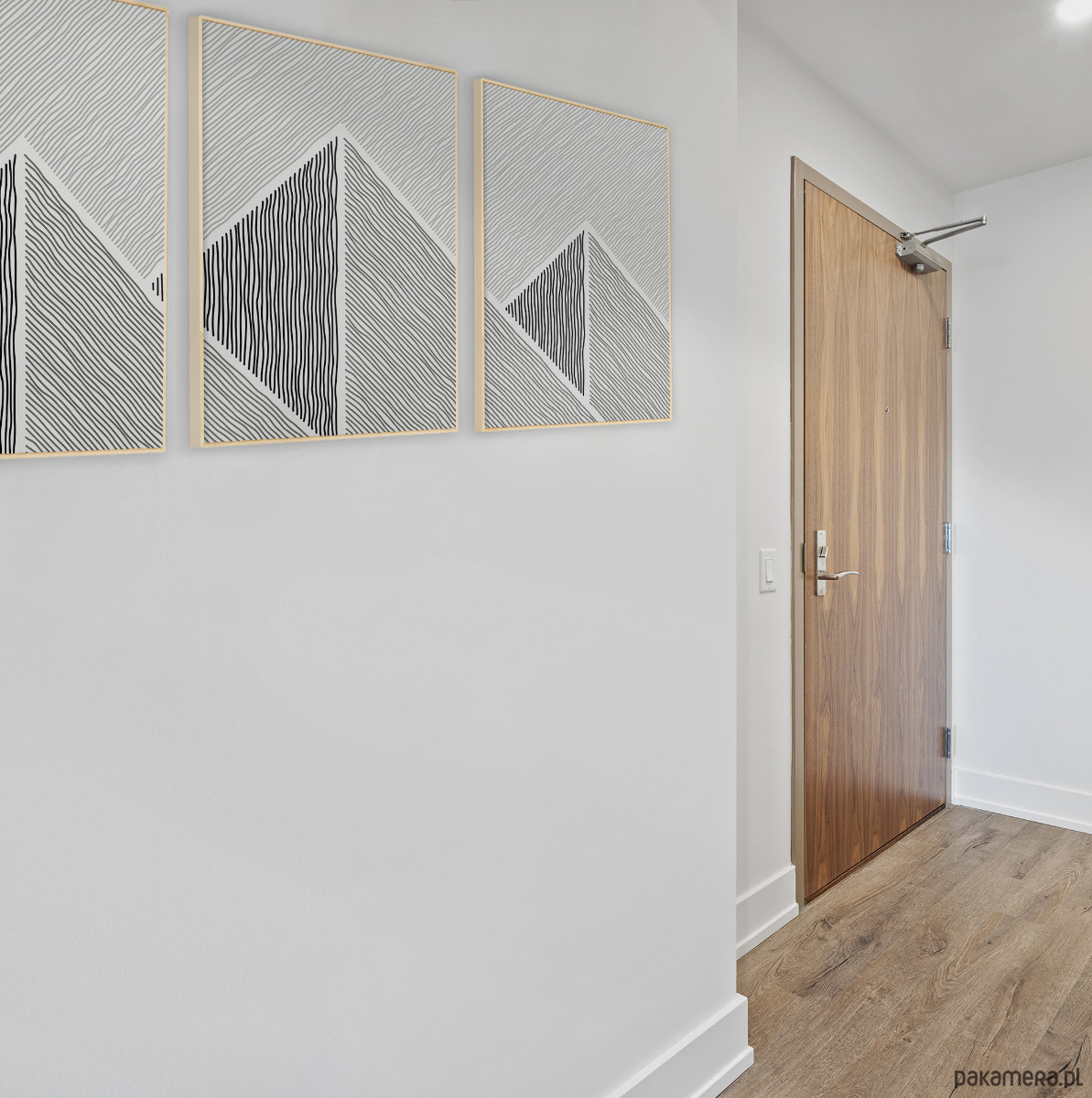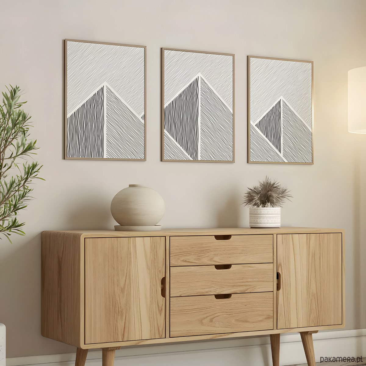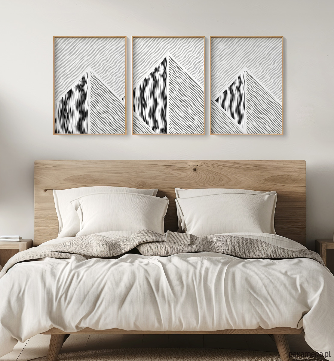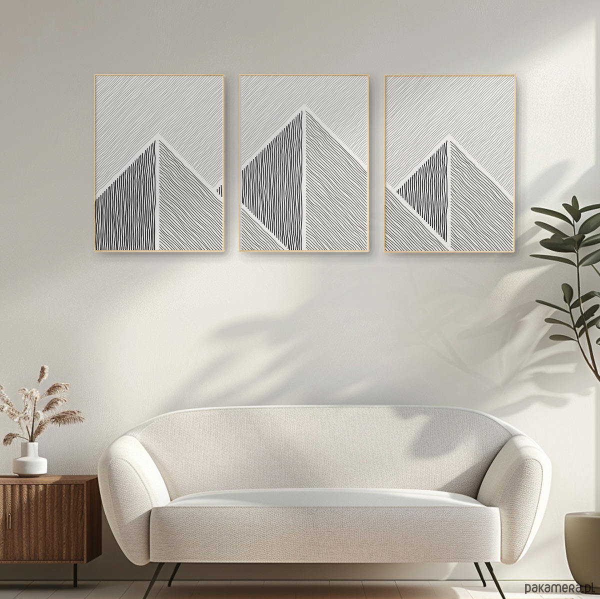 Tryptyk plakatów graficznych z motywem przypominającym górski krajobraz. Proste, geometryczne formy oraz czarno-biała kolorystyka tworzą spójną kompozycję, która dobrze odnajdzie się w aranżacjach w stylu loftowym, nowoczesnym, czy też minimalistycznym.