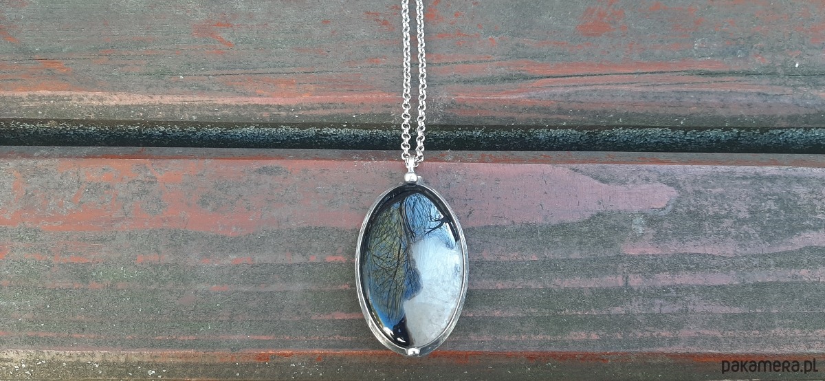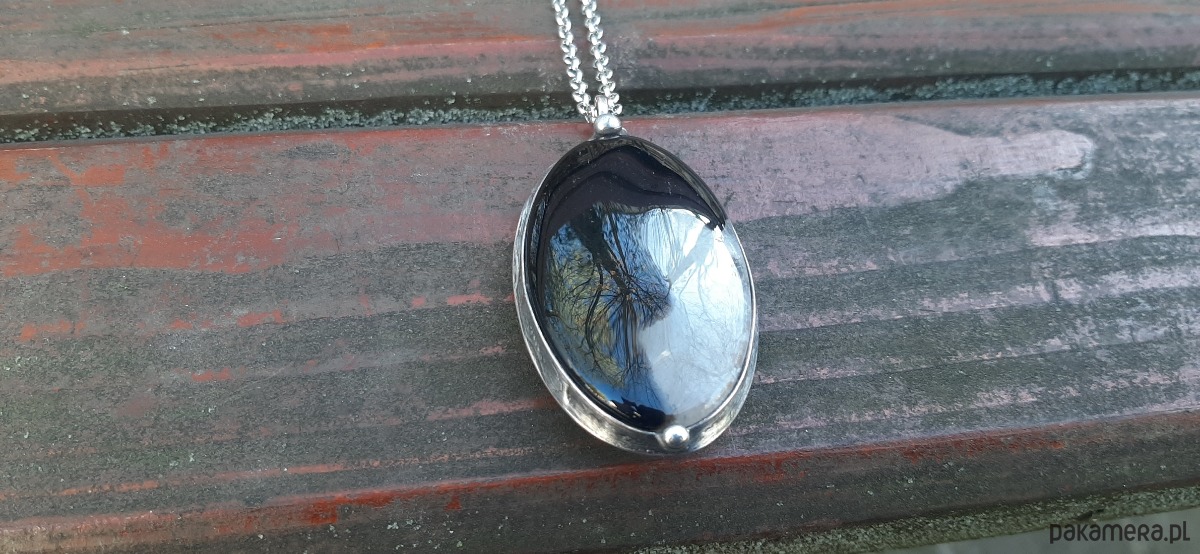 Wisiorek wykonany z miedzi, cyny i agatu. Wymiary ok. 6 na 3.5 cm. Zawieszony na łańcuszku o długości ok. 50 cm. Można go nosić na dwie strony.