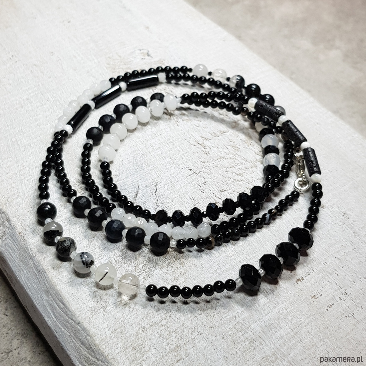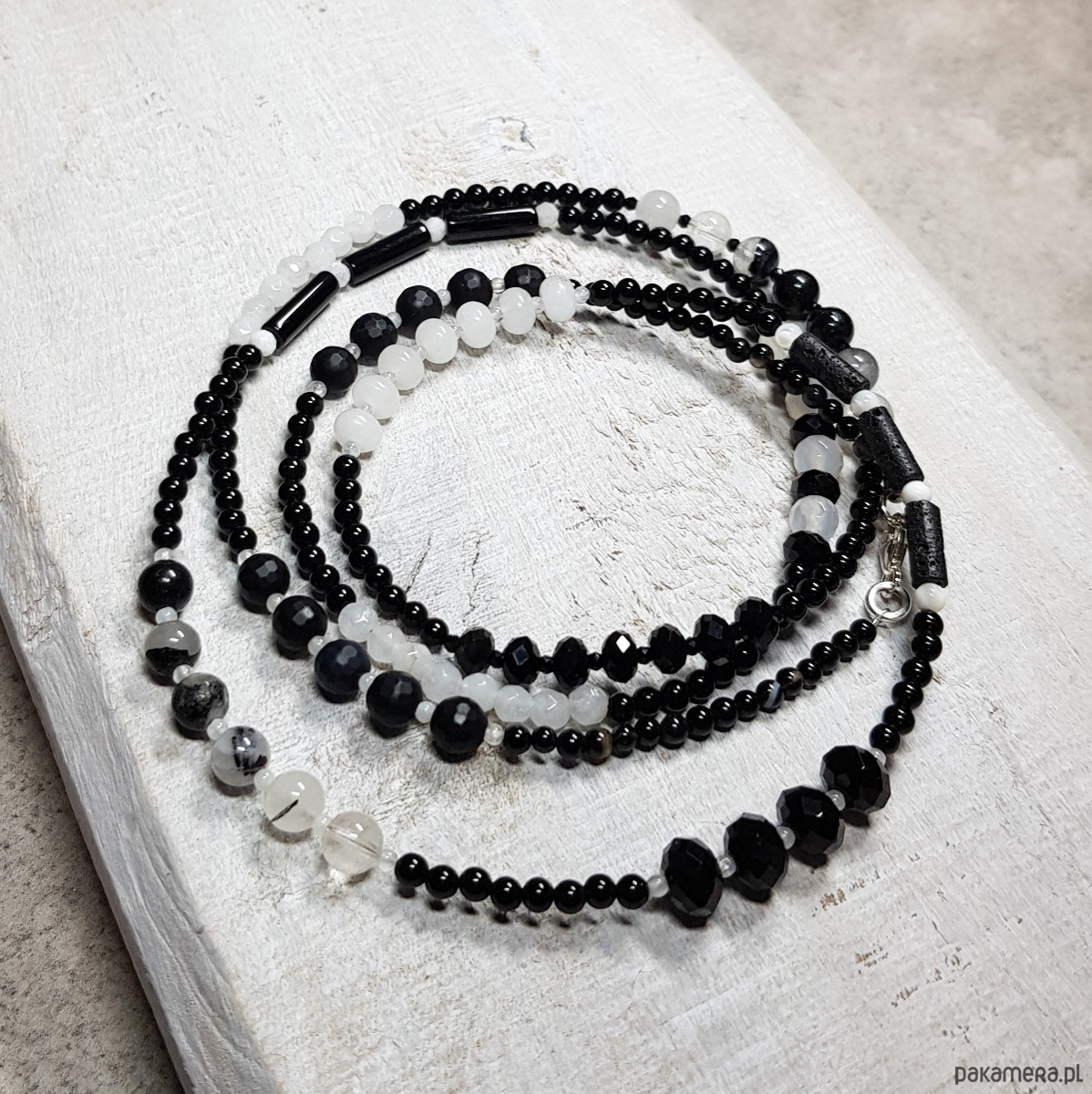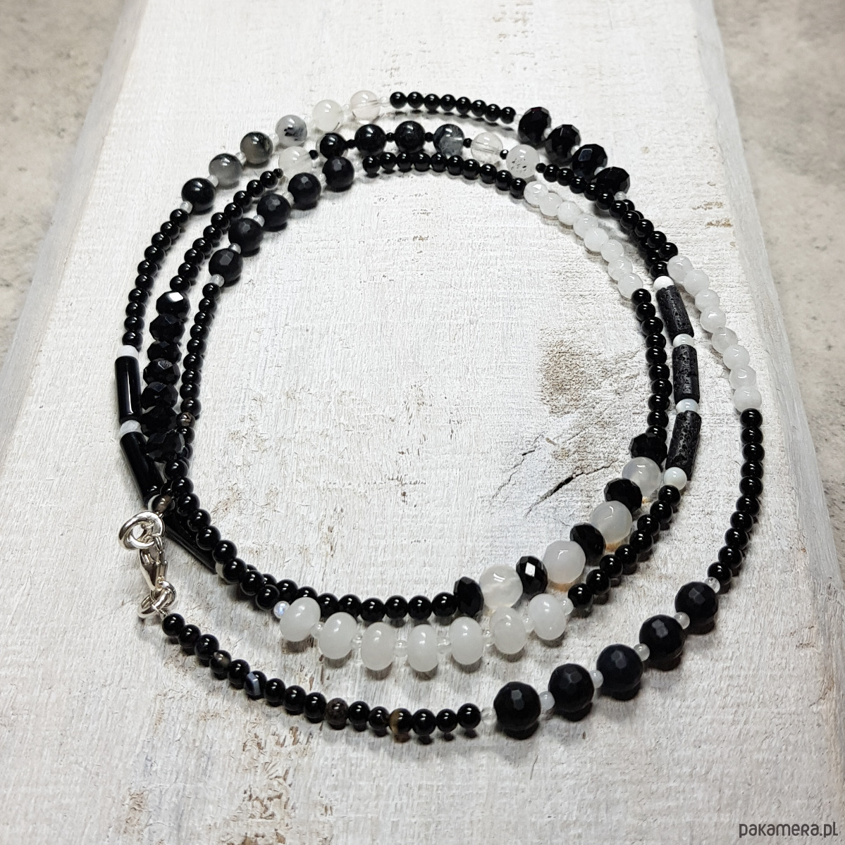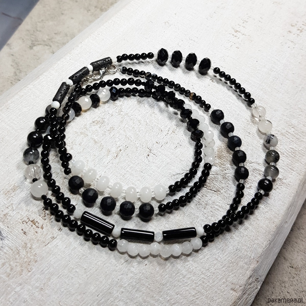 94 centymetrowy sznur korali z naturalnych minerałów o różnych kształtach i rozmiarach. Z onyksu, turmalinu, spineli, lawy, agatu, kwarcu z turmalinem i księżycowego kamienia starałam się utworzyć ciekawą, oryginalną i zarazem elegancką kompozycję. Korale są bezpiecznie nanizane na stalową linkę, a wykończenia i zapięcie są ze srebra.