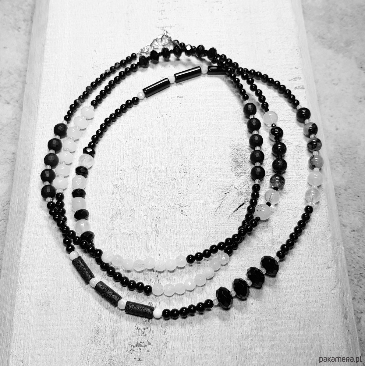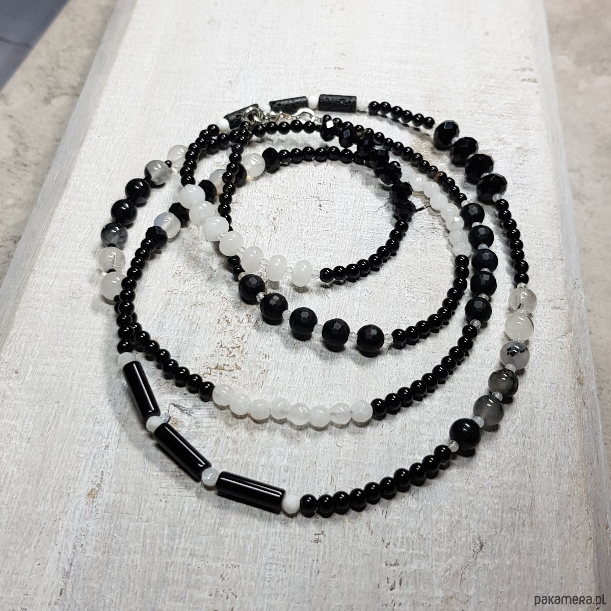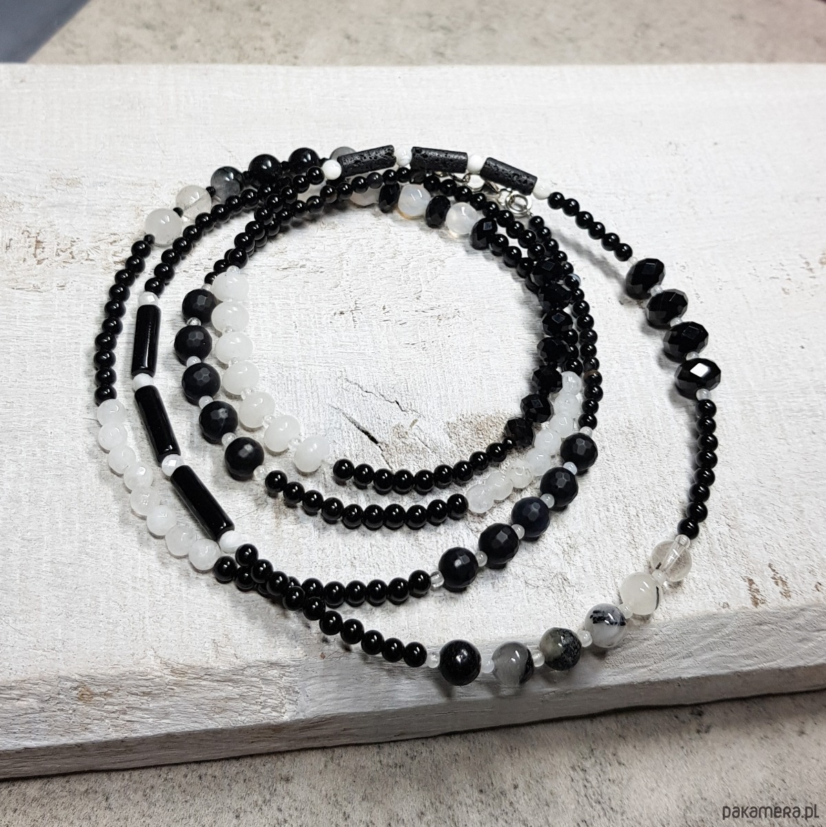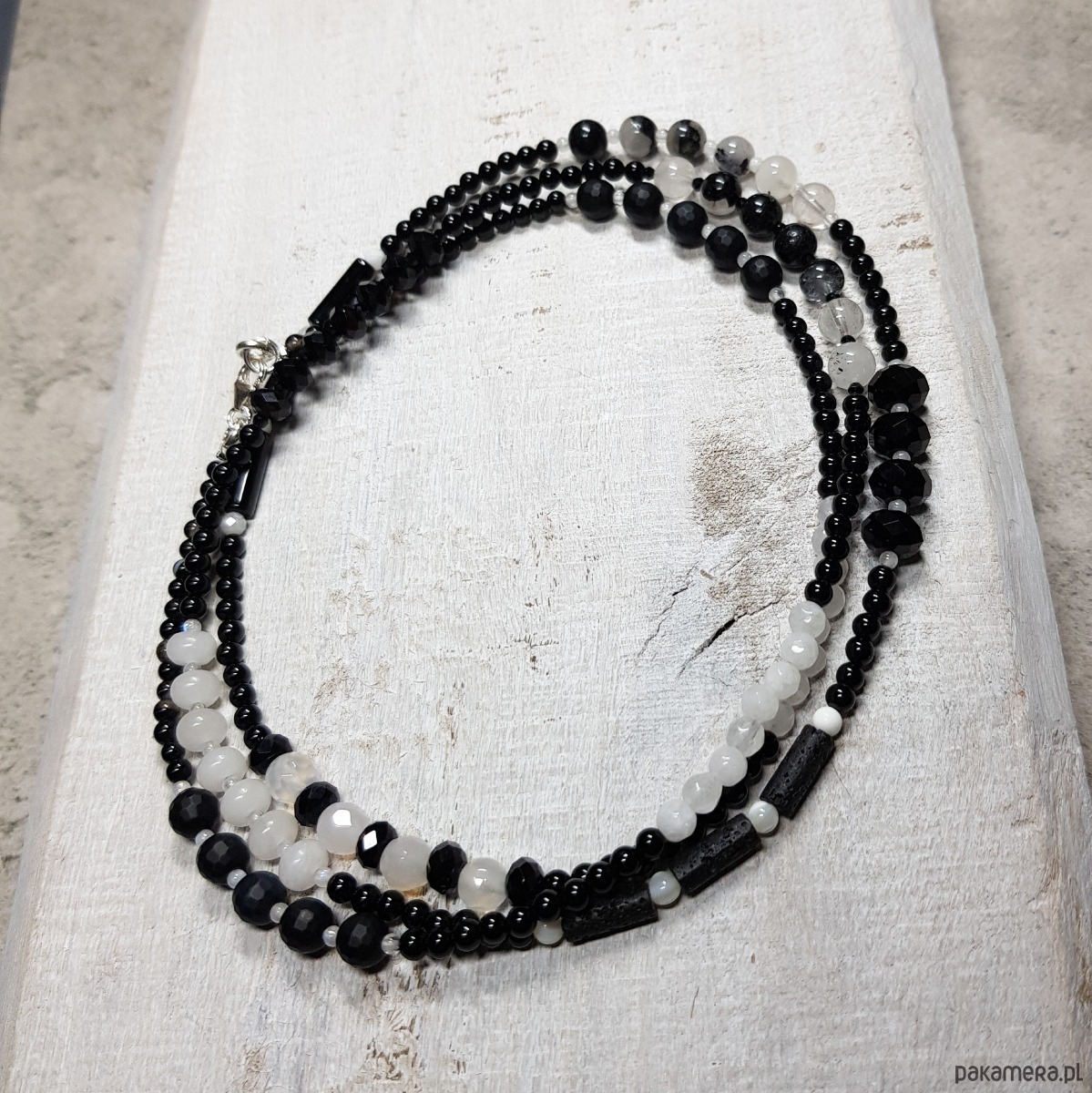 94 centymetrowy sznur korali z naturalnych minerałów o różnych kształtach i rozmiarach. Z onyksu, turmalinu, spineli, lawy, agatu, kwarcu z turmalinem i księżycowego kamienia starałam się utworzyć ciekawą, oryginalną i zarazem elegancką kompozycję. Korale są bezpiecznie nanizane na stalową linkę, a wykończenia i zapięcie są ze srebra.