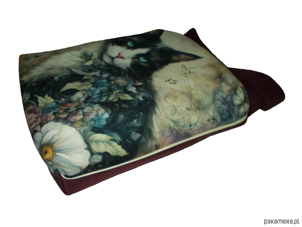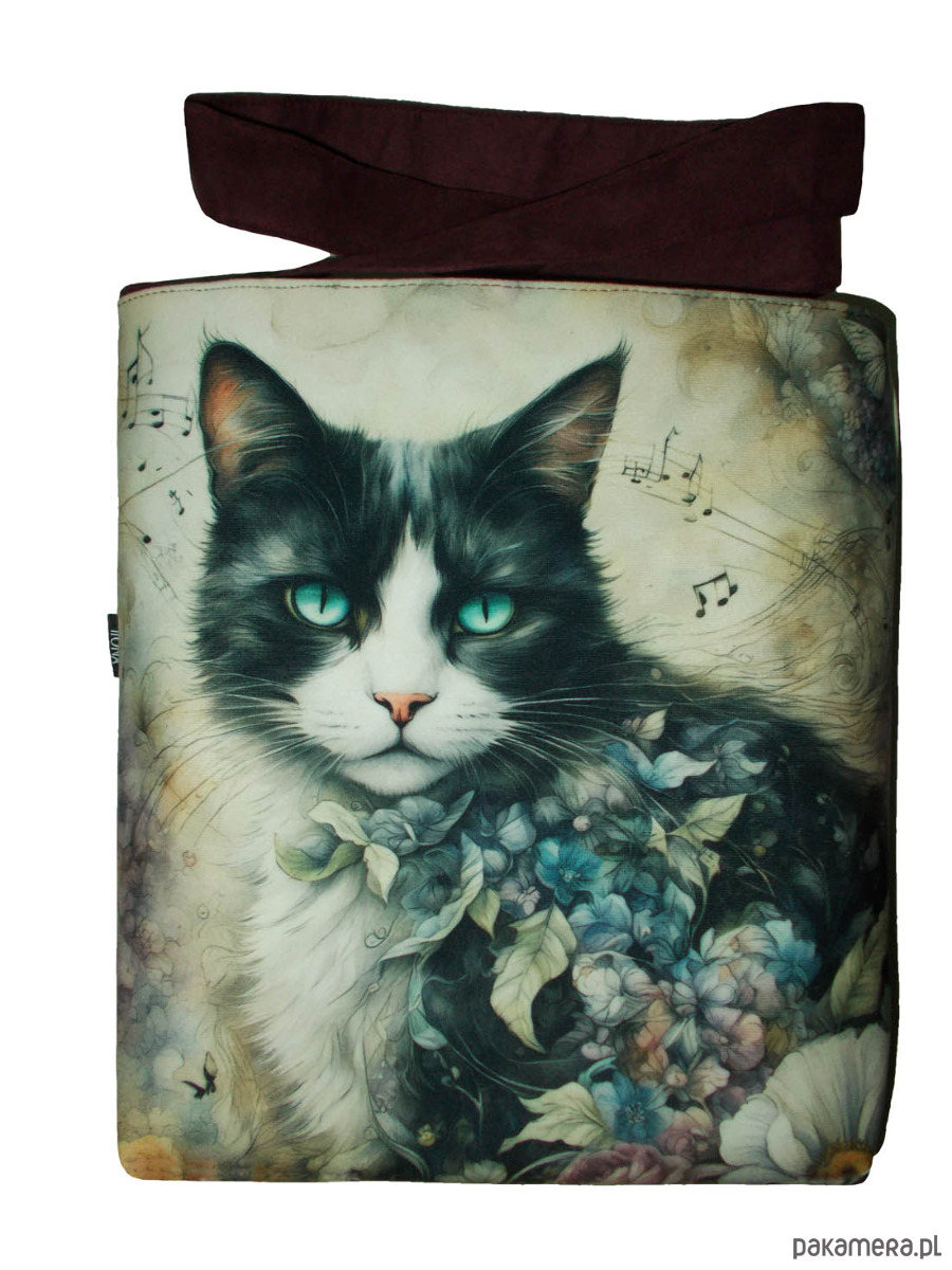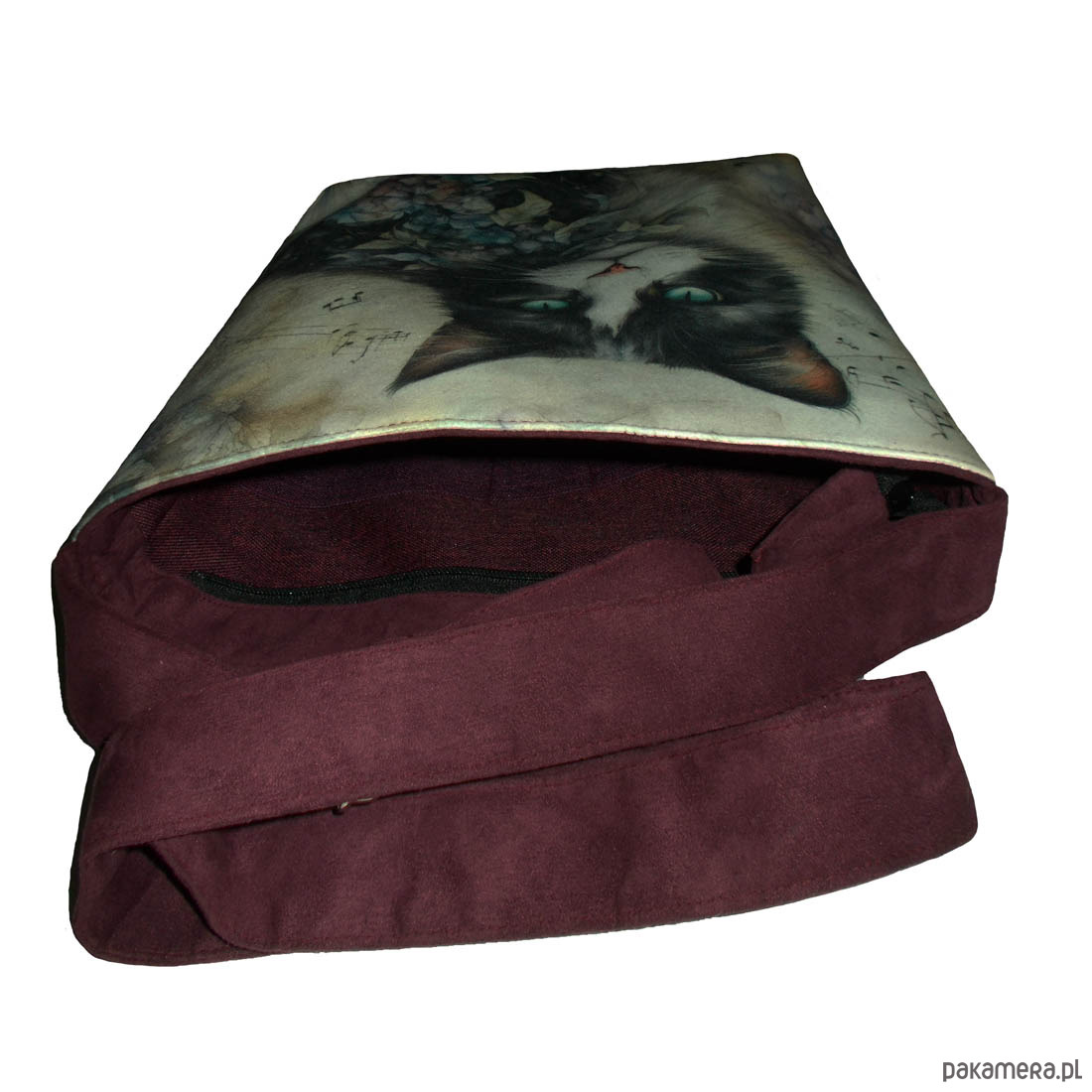 Autorska torba z usztywnionego eko zamszu, zapinana na zamek. Przód z weluru tapicerskiego. Pasek regulowany. Tył w kolorze paska (burgund). Torba trzyma fason. Wewnątrz dwie kieszenie - jedna na zamek, druga z miejscem na telefon i coś jeszcze. W szwach wypustka. Denko poszerzone. szerokość 32cm wysokość 30cm plus denko 8cm