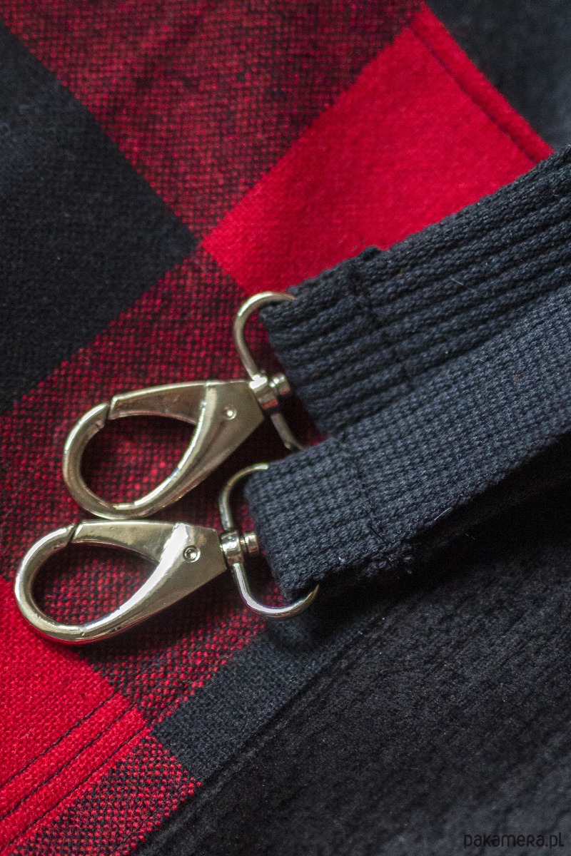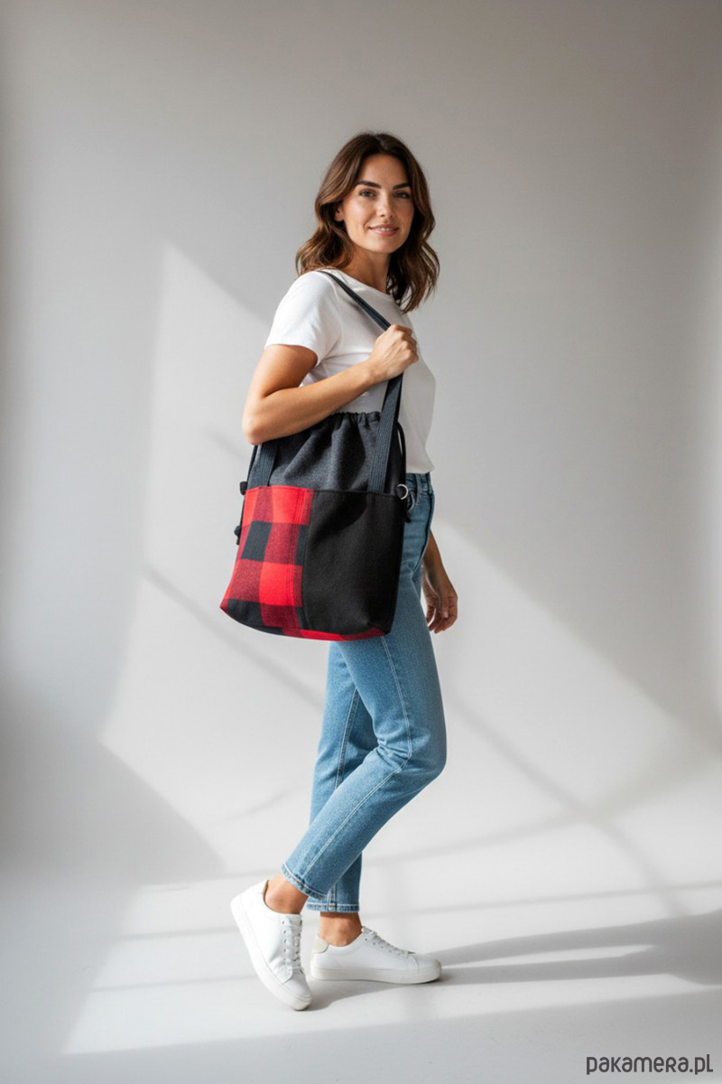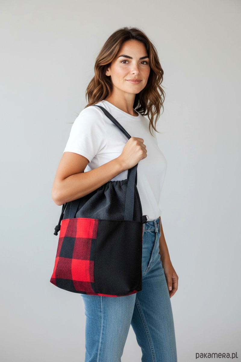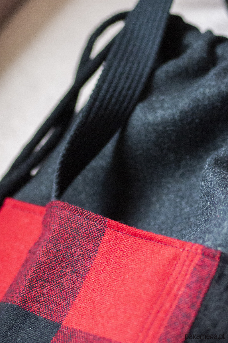 Torba worek wykonana z flauszu, weluru oraz czarno-czerwonej flaneli w kratę.