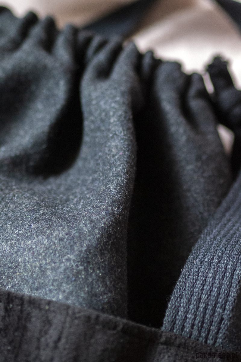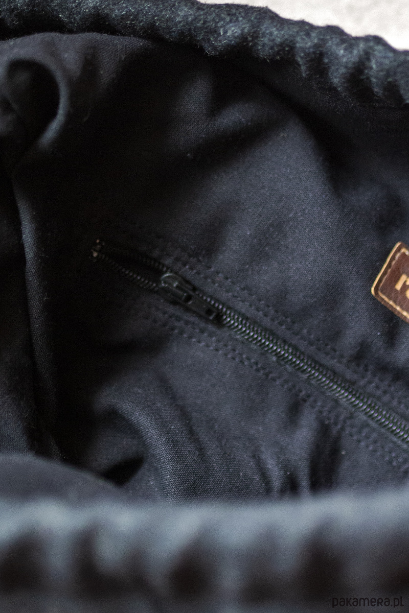 Ściągana jest jak worek bawełnianym sznurkiem w kolorze czarnym. Dół daje dodatkowe miejsce na przechowywanie rzeczy - z przodu dwie mniejsze, z tyłu torby jedna duża kieszeń.