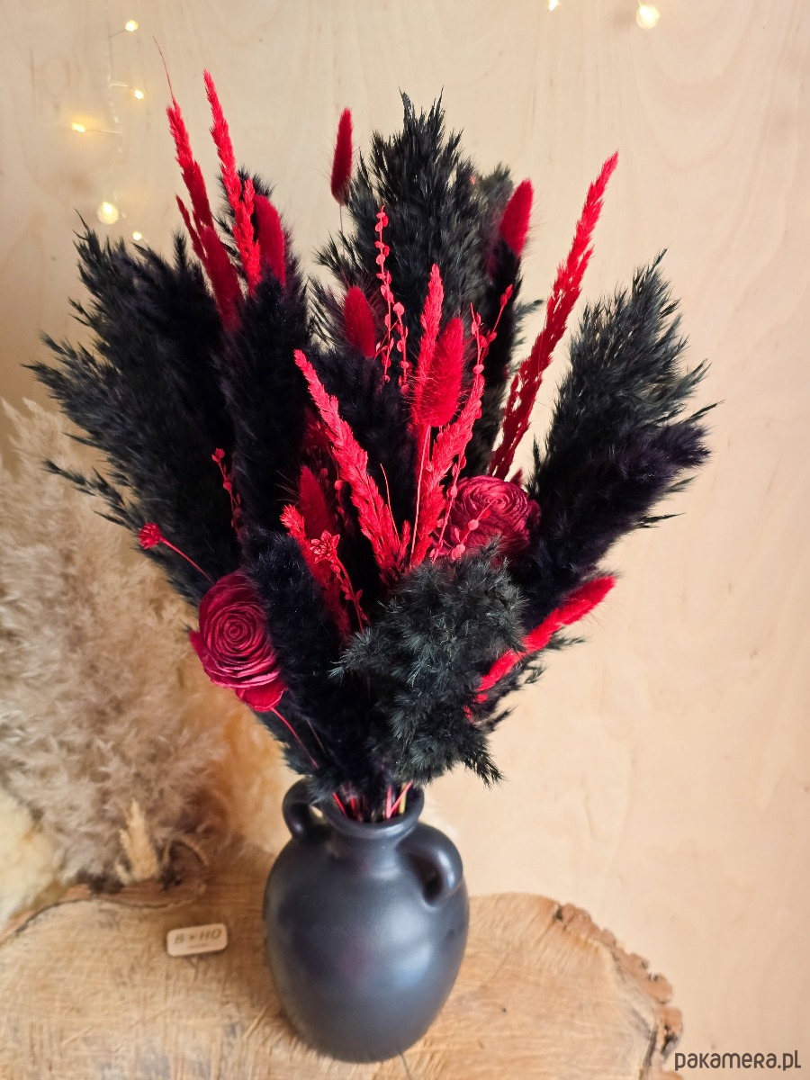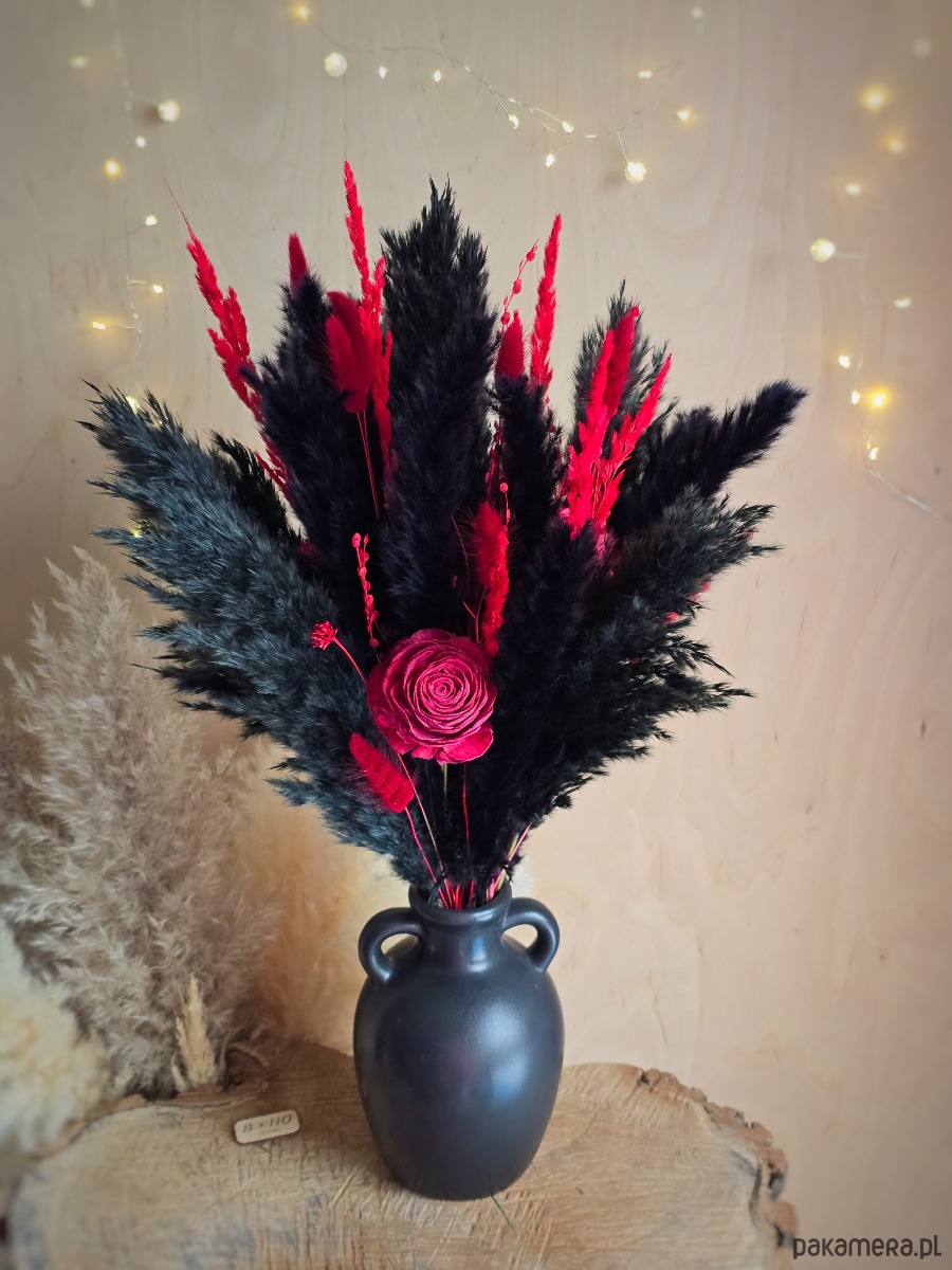 Ten bukiet łączy trawy pampasowe i kwiaty shola w wyrazistej, gotyckiej kolorystyce. Ma ok. 55 cm wysokości, dzięki czemu świetnie prezentuje się w wazonach stojących na komodzie, półce czy konsoli. To gotowa dekoracja, która od razu dodaje wnętrzu charakteru.