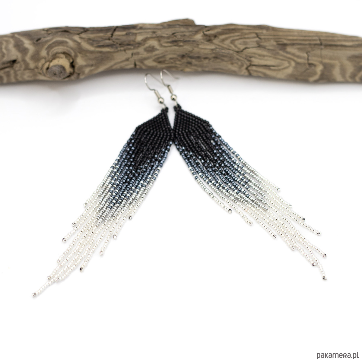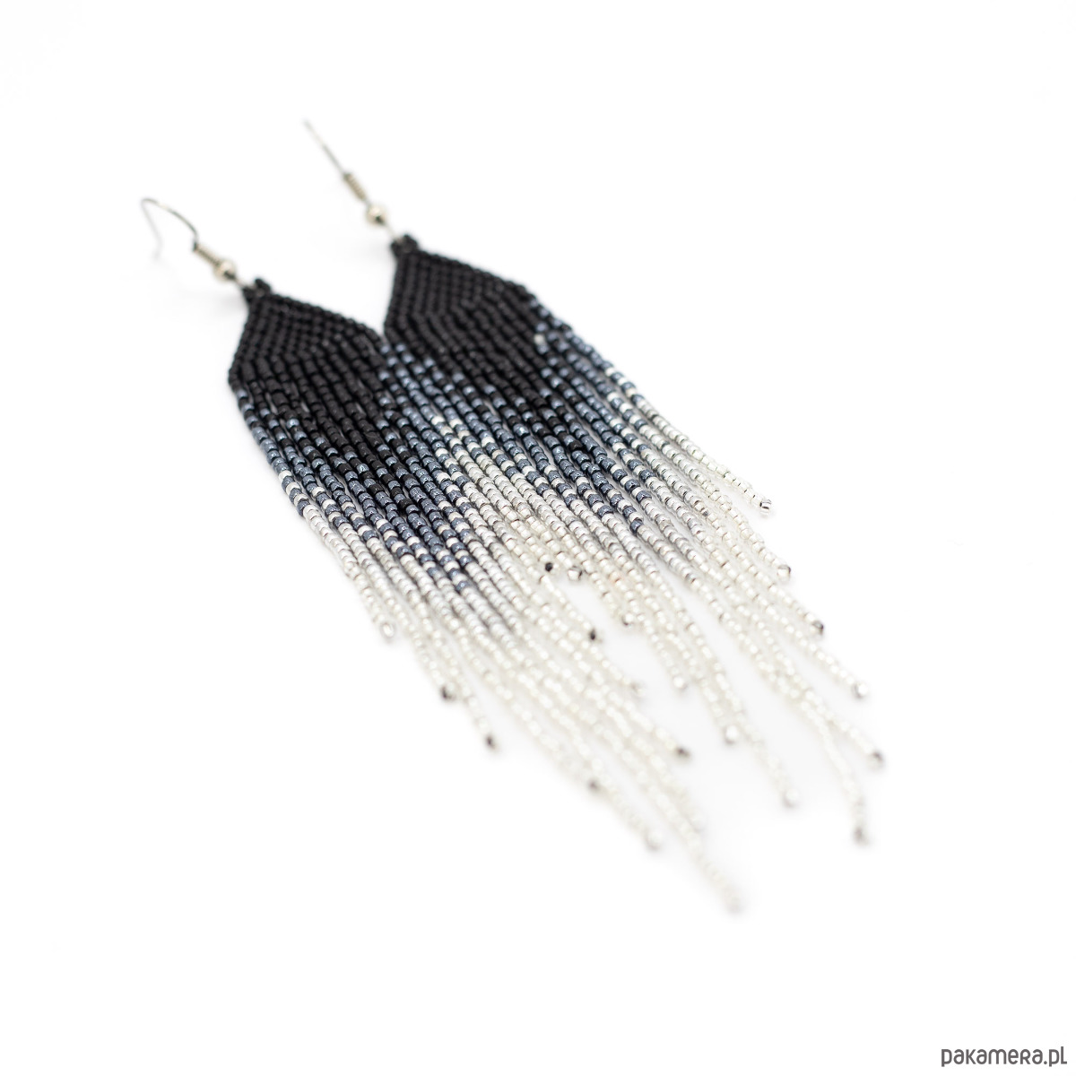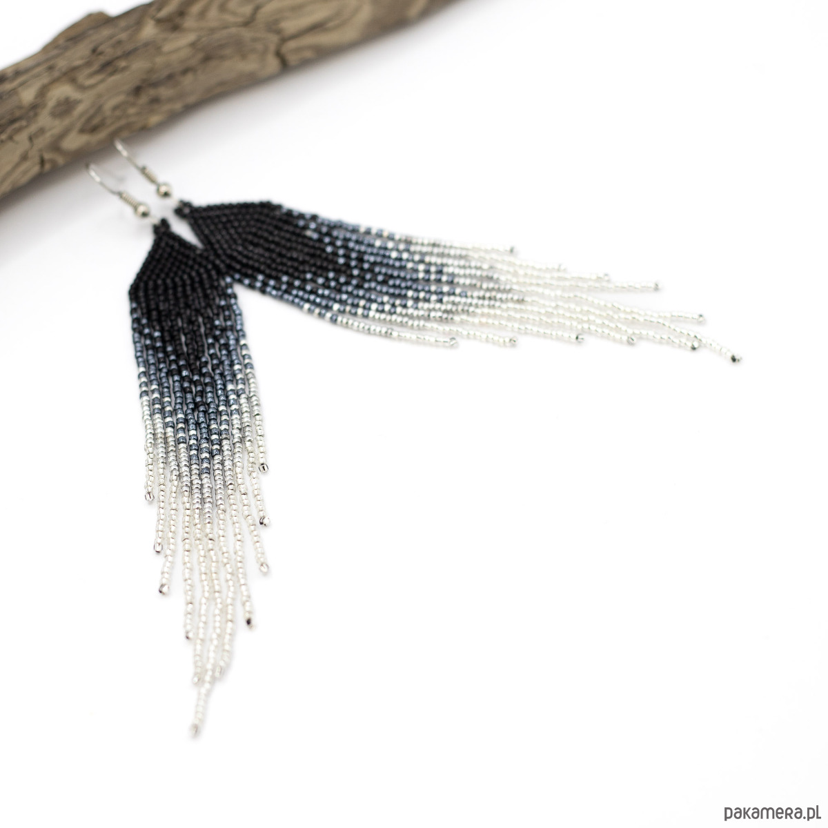 Kolczyki koralikowe cieniowane kolorami: czarnym, srebrnym, białym. Eleganckie, pięknie mieniące się na końcach.