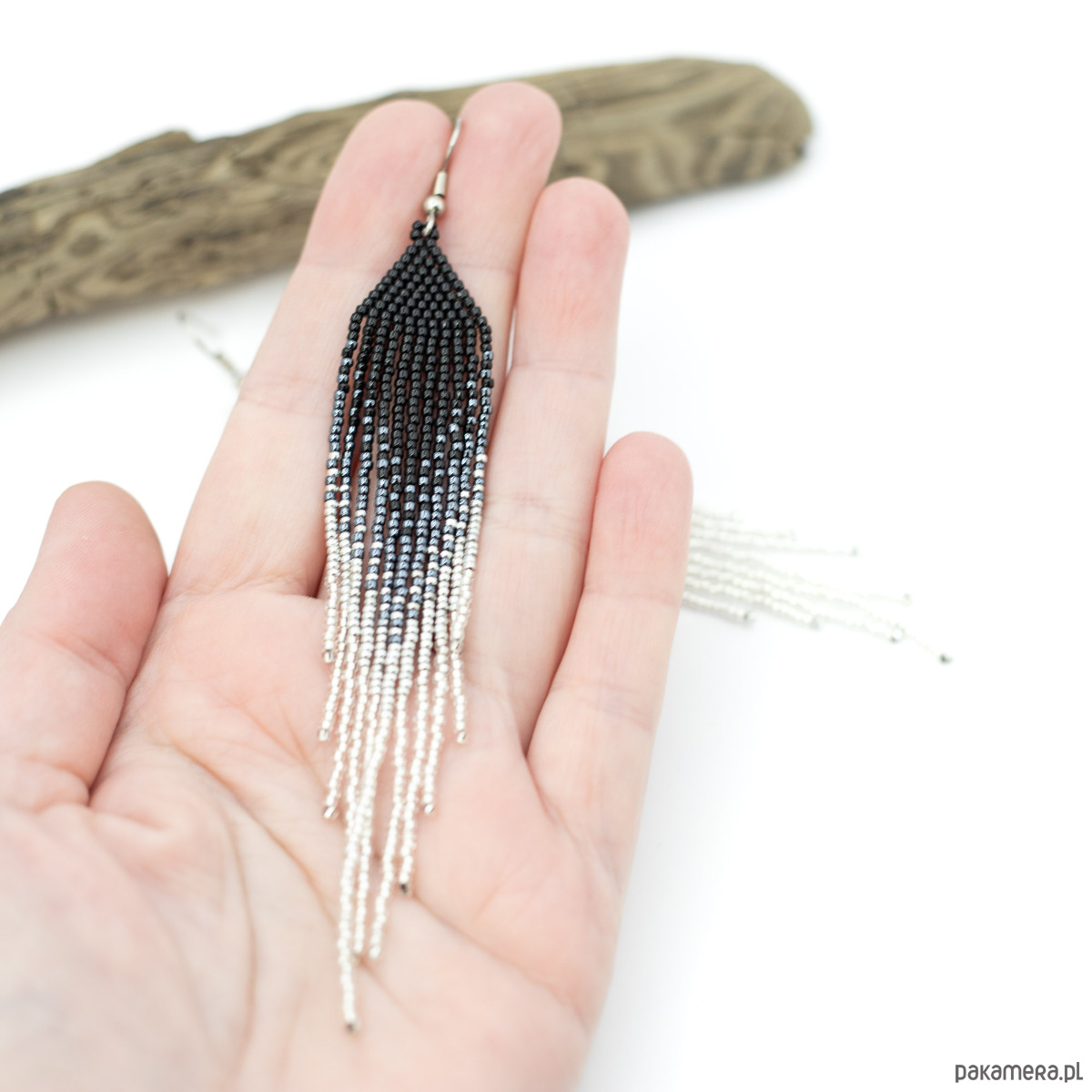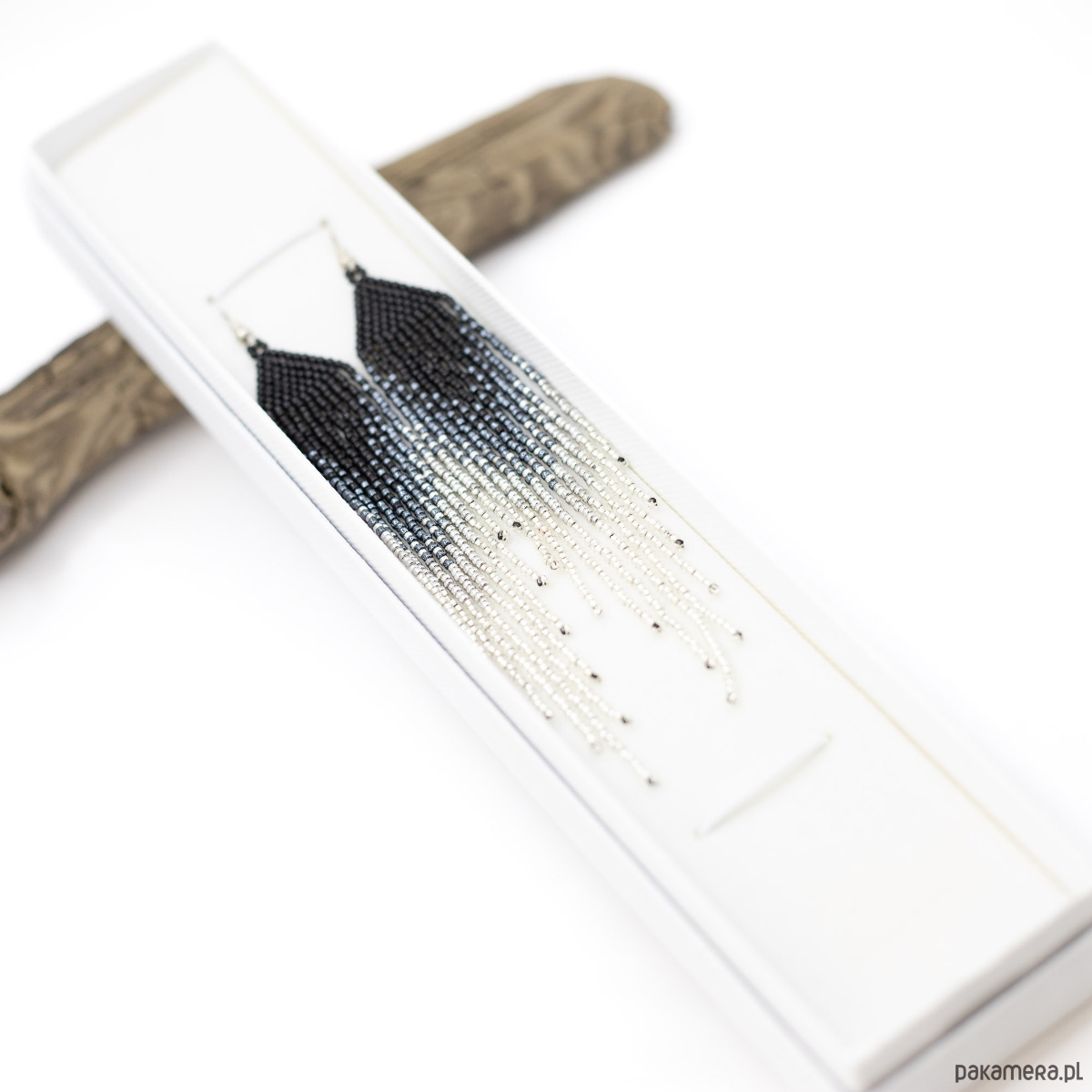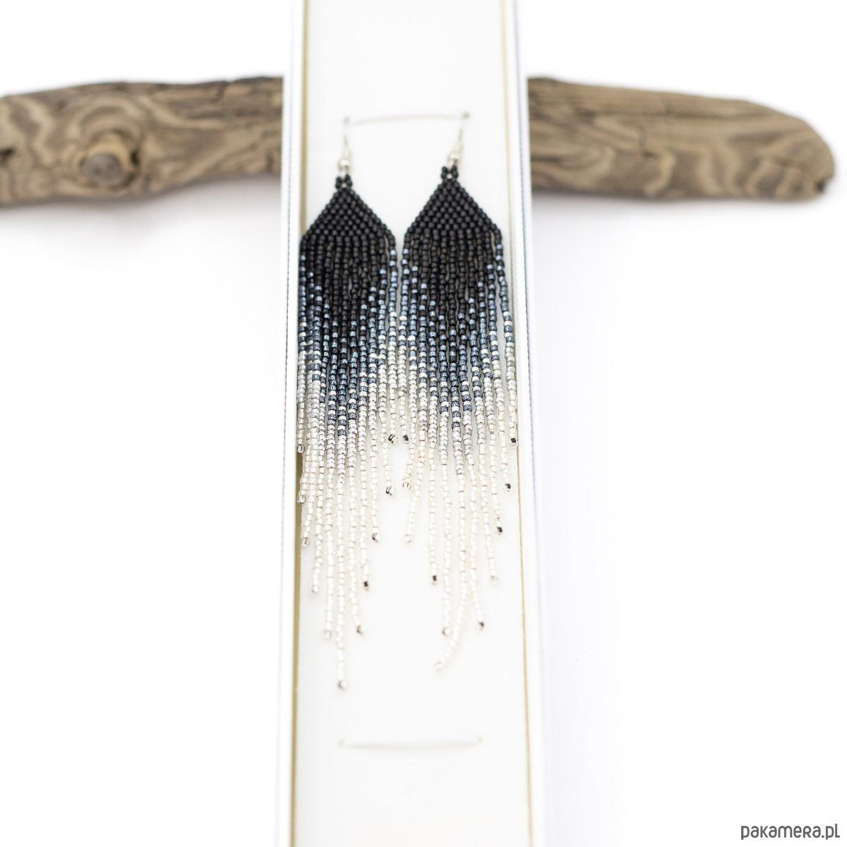 Kolczyki koralikowe cieniowane kolorami: czarnym, srebrnym, białym. Eleganckie, pięknie mieniące się na końcach.