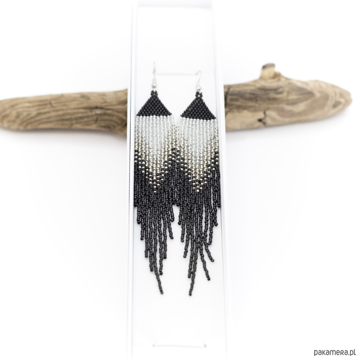 Wykonane z japońskich szklanych koralików. Wymiary kolczyka: 12cm/2cm. Bigle srebrne, możliwość wymiany na antyalergiczne - ze stali szlachetnej w kolorze srebrnym, proszę zostawić uwagę przy zamówieniu.